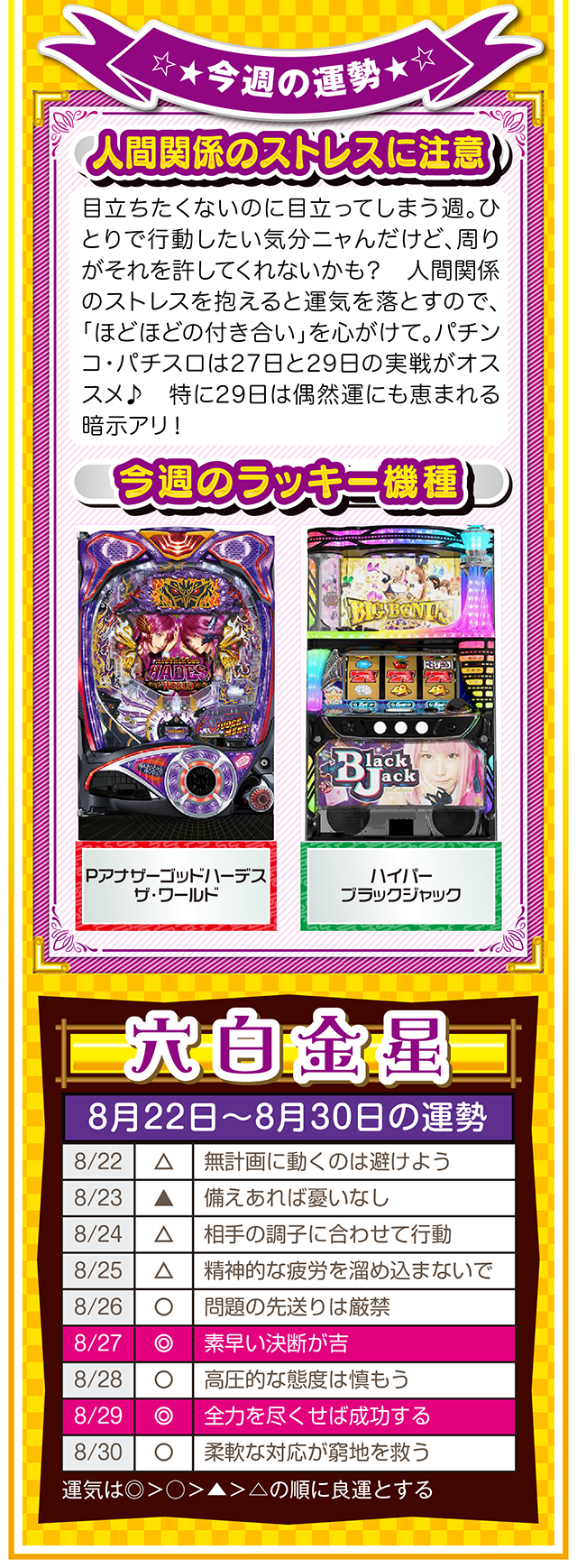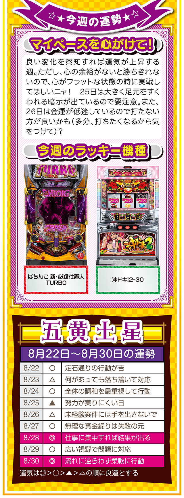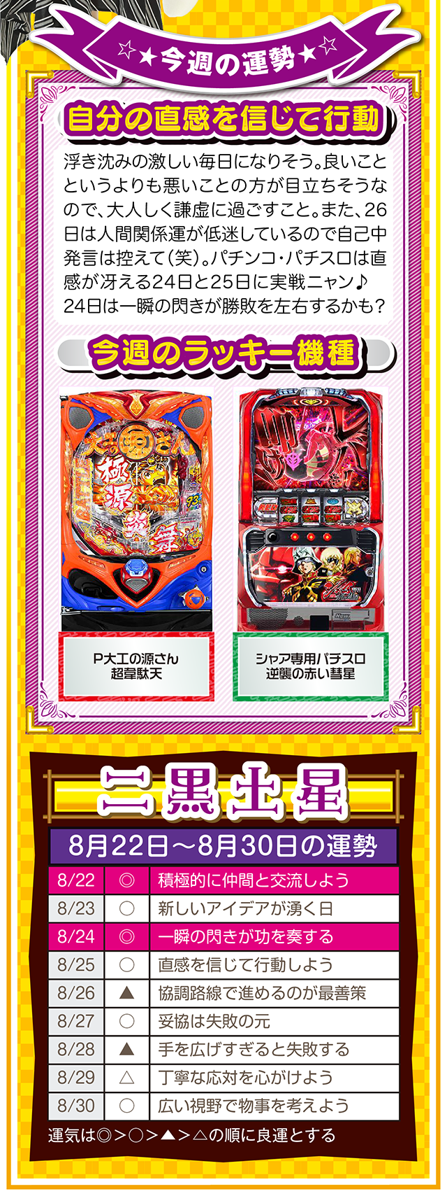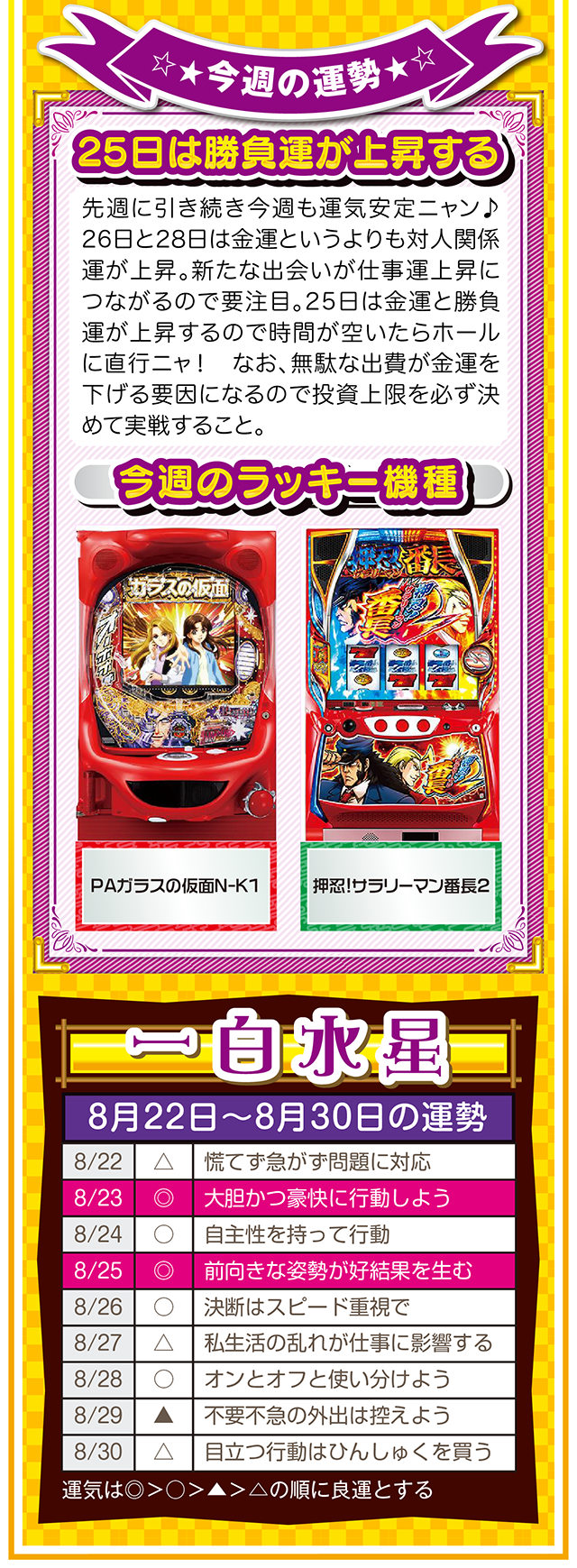 自分の価値観で生きない、自分の好みを押しつけない、自分のためだけに生きない……この3つを意識するだけで世界は大きく変わり、運とかツキにも恵まれるようになる。また、思いやりは言葉ではなく態度で示すことも忘れないでほしいニャン……というわけで早速、8月24日から30日の1週間を鑑定ニャ(男性の価値観だけは絶対に変えたくないフォー・チュンチュンが、今週もオマケとして22日と23日の運勢も鑑定したニャン♡)!