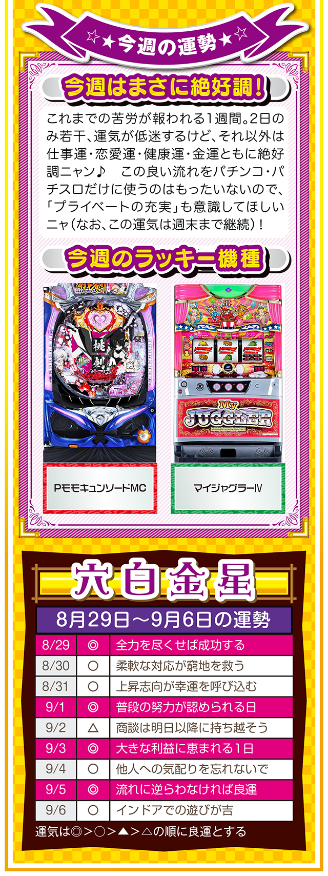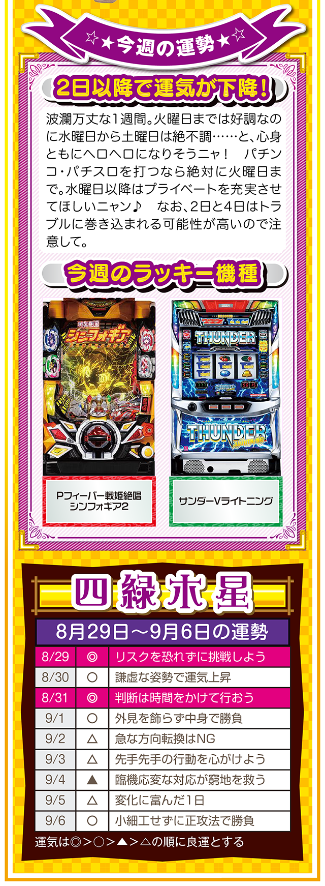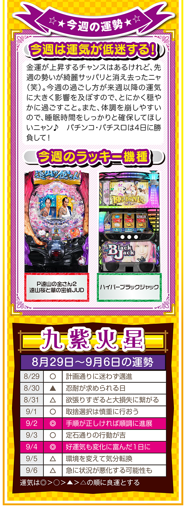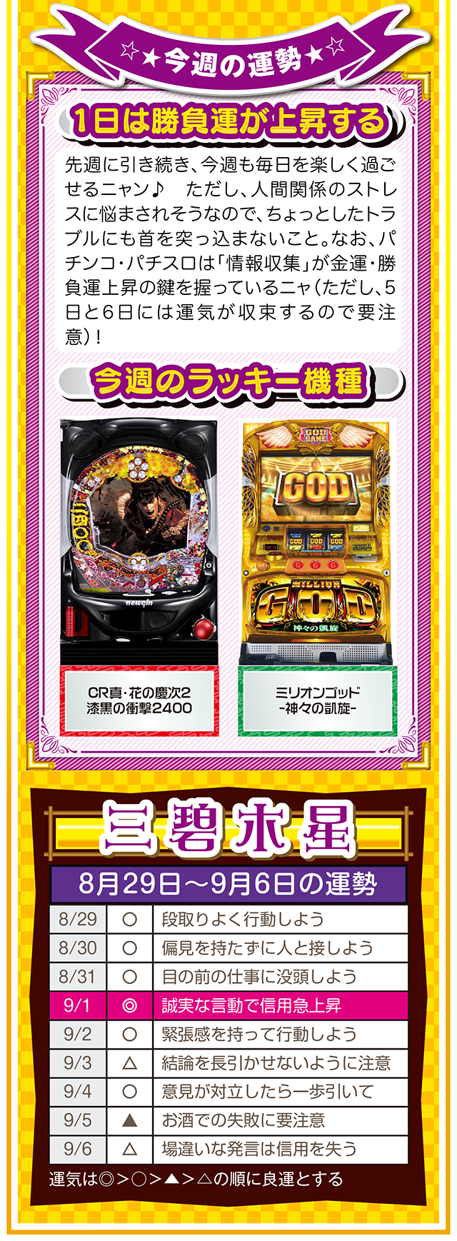 他人の成功を羨む前に、他人の努力と苦労に目を向けることができれば、その人以上の運とツキ、そして成功を手に入れることができるニャ……というわけで早速、8月31日から9月6日の1週間を鑑定ニャ(来年から厄年に突入するフォー・チュンチュンが、今週もオマケとして29日と30日の運勢も鑑定したニャン♡)!