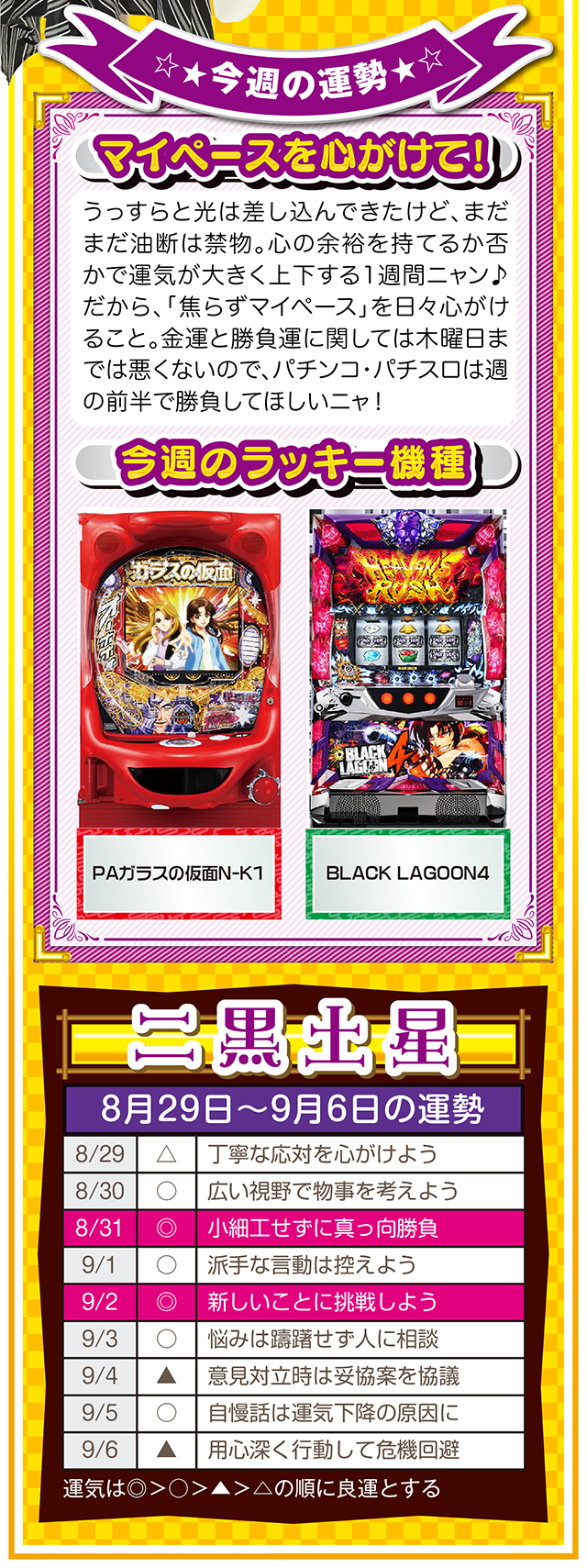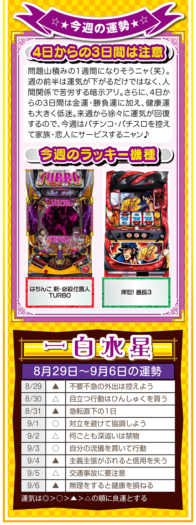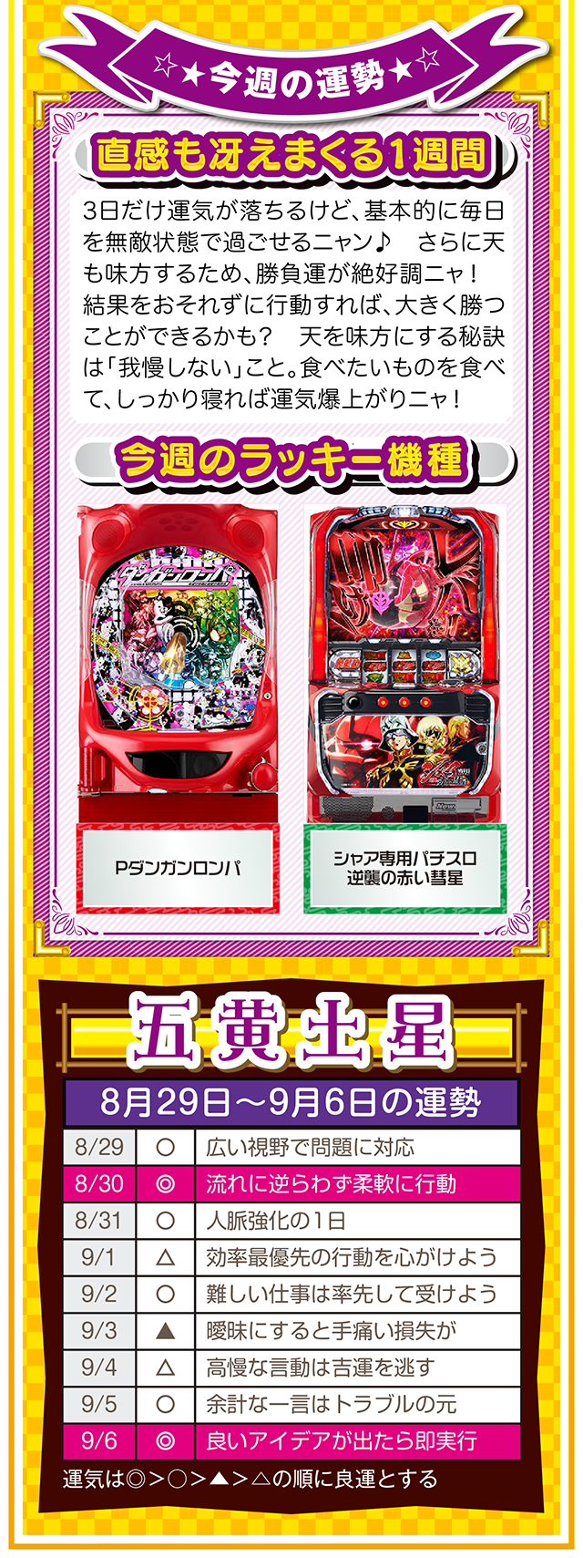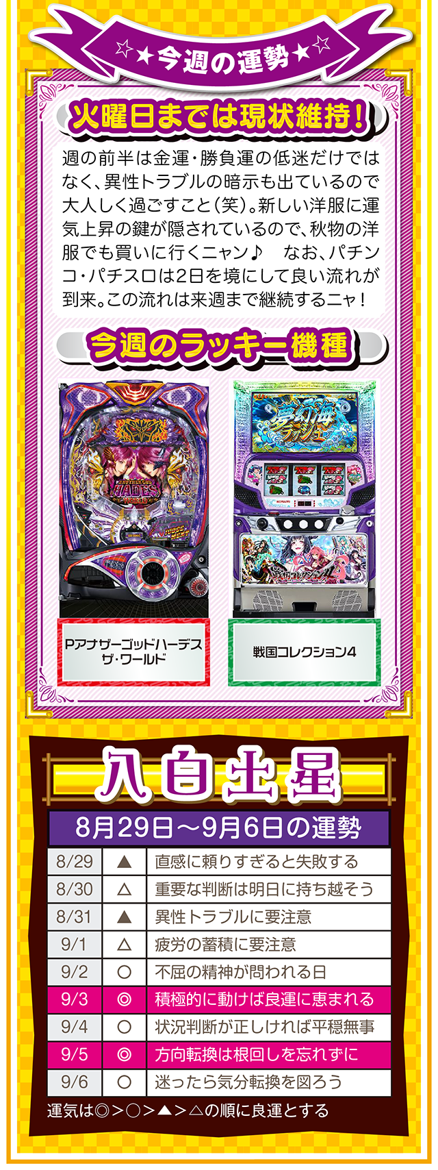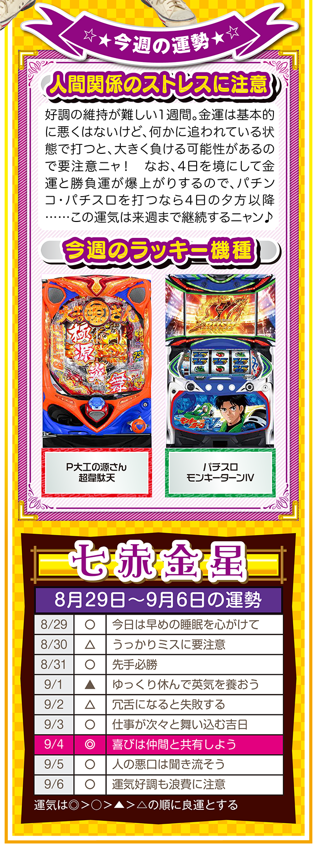 他人の成功を羨む前に、他人の努力と苦労に目を向けることができれば、その人以上の運とツキ、そして成功を手に入れることができるニャ……というわけで早速、8月31日から9月6日の1週間を鑑定ニャ(来年から厄年に突入するフォー・チュンチュンが、今週もオマケとして29日と30日の運勢も鑑定したニャン♡)!