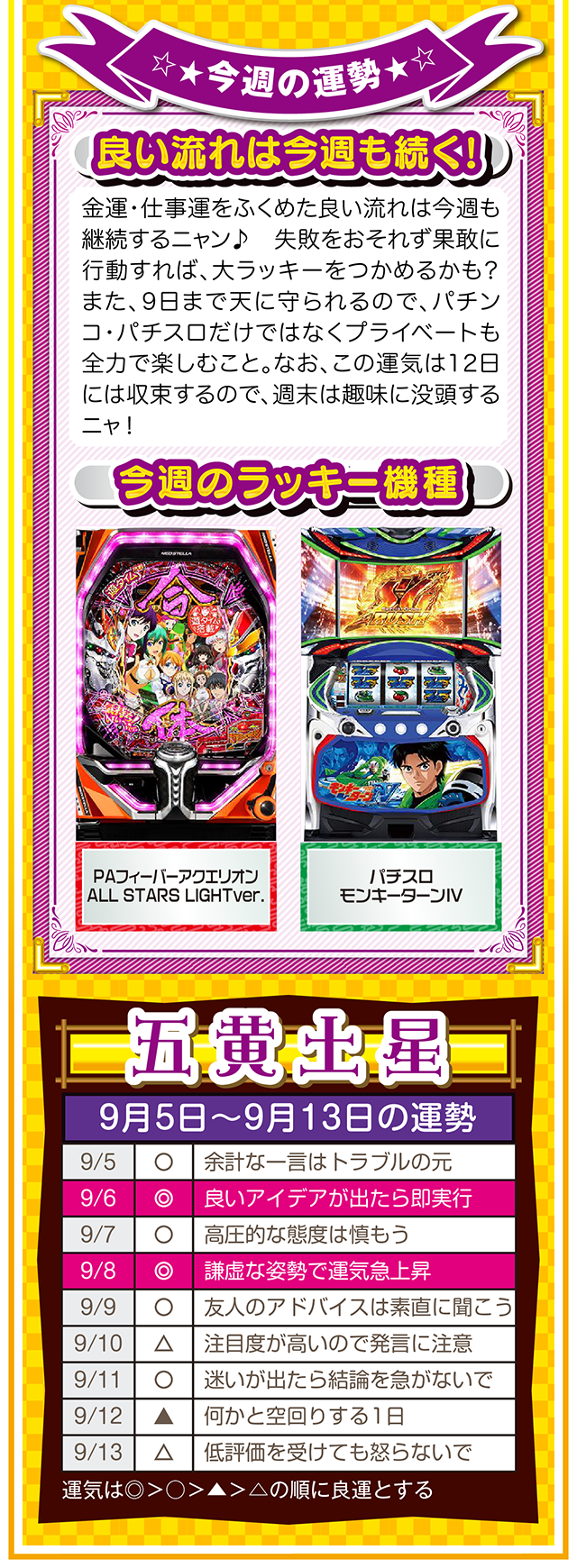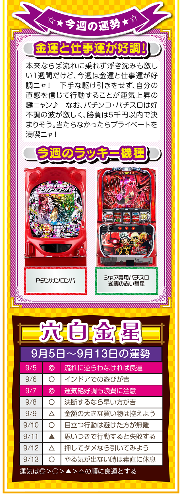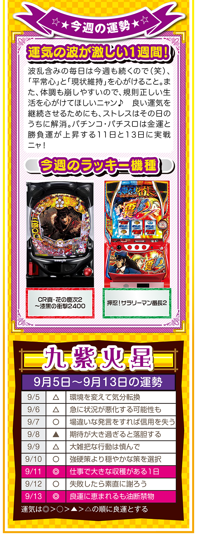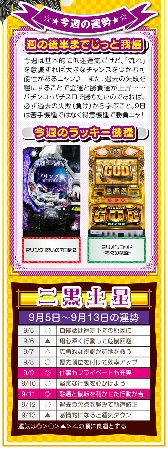もし幸せになりたいのなら、「生きていることに感謝できる人」になること。この法則を知れば、運とかツキも必ず味方してくれるニャン……というわけで早速、9月7日から13日の1週間を鑑定ニャ(冷蔵庫と電子レンジが同時に壊れてもなお引きつり笑顔を絶やさないフォー・チュンチュンが、今週もオマケとして5日と6日の運勢も鑑定したニャン♡)!