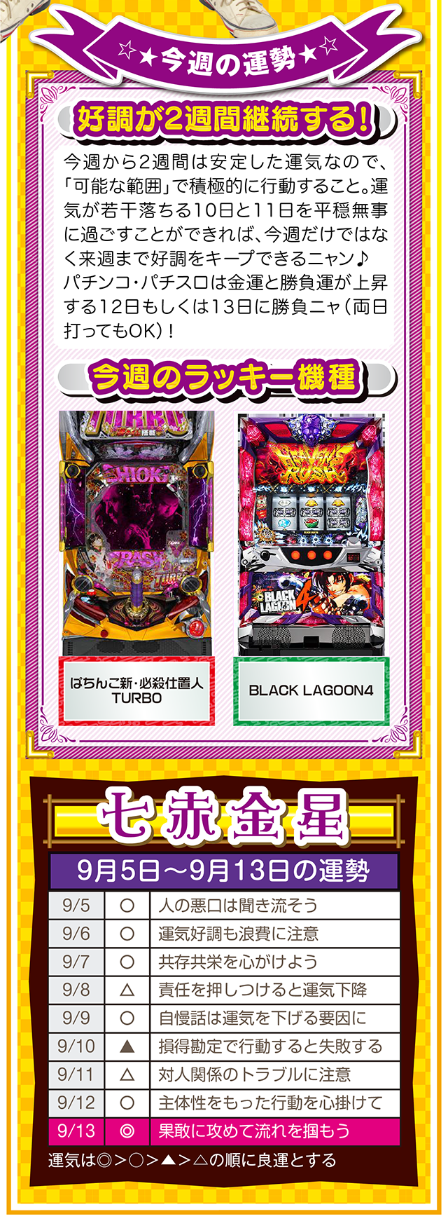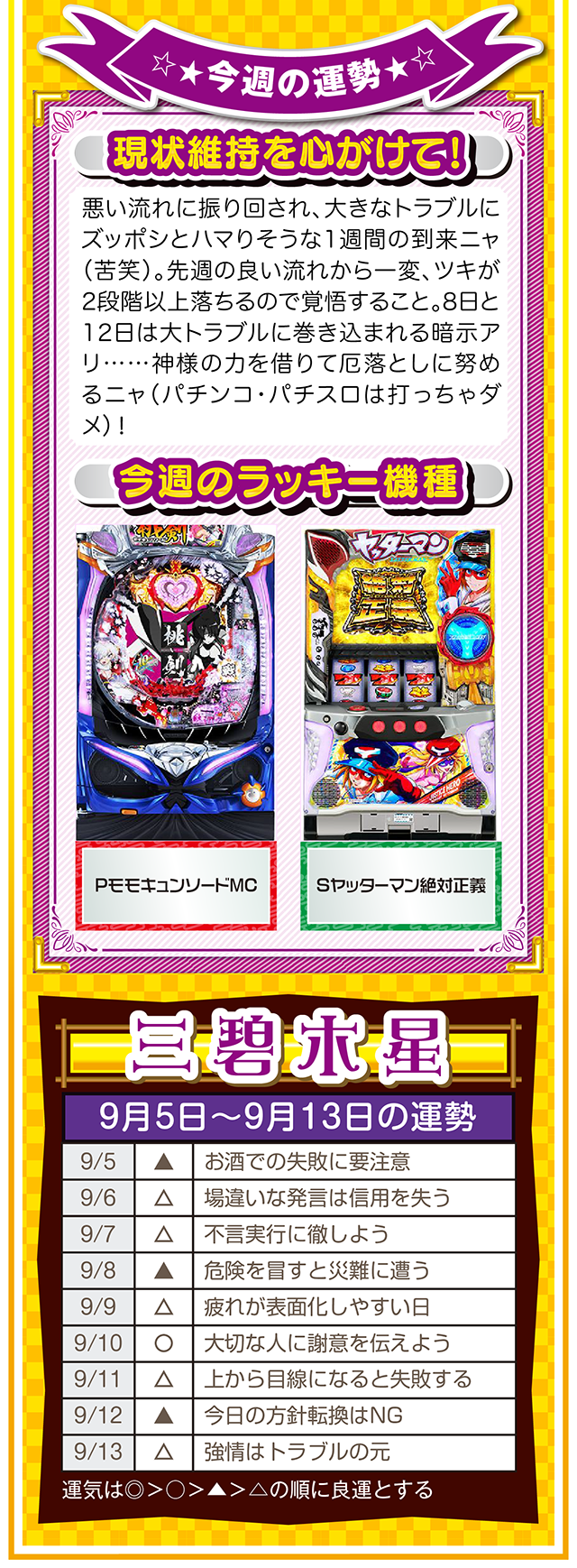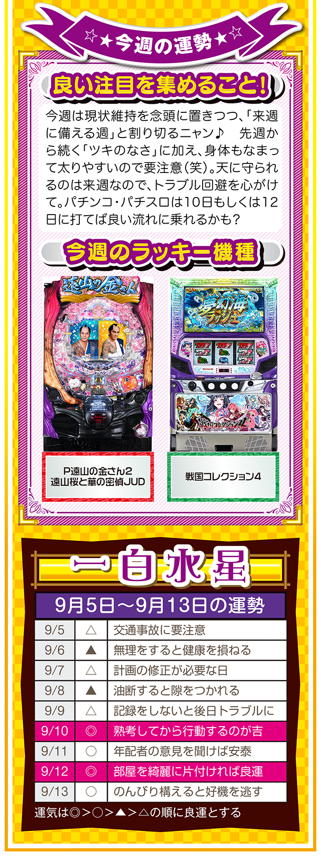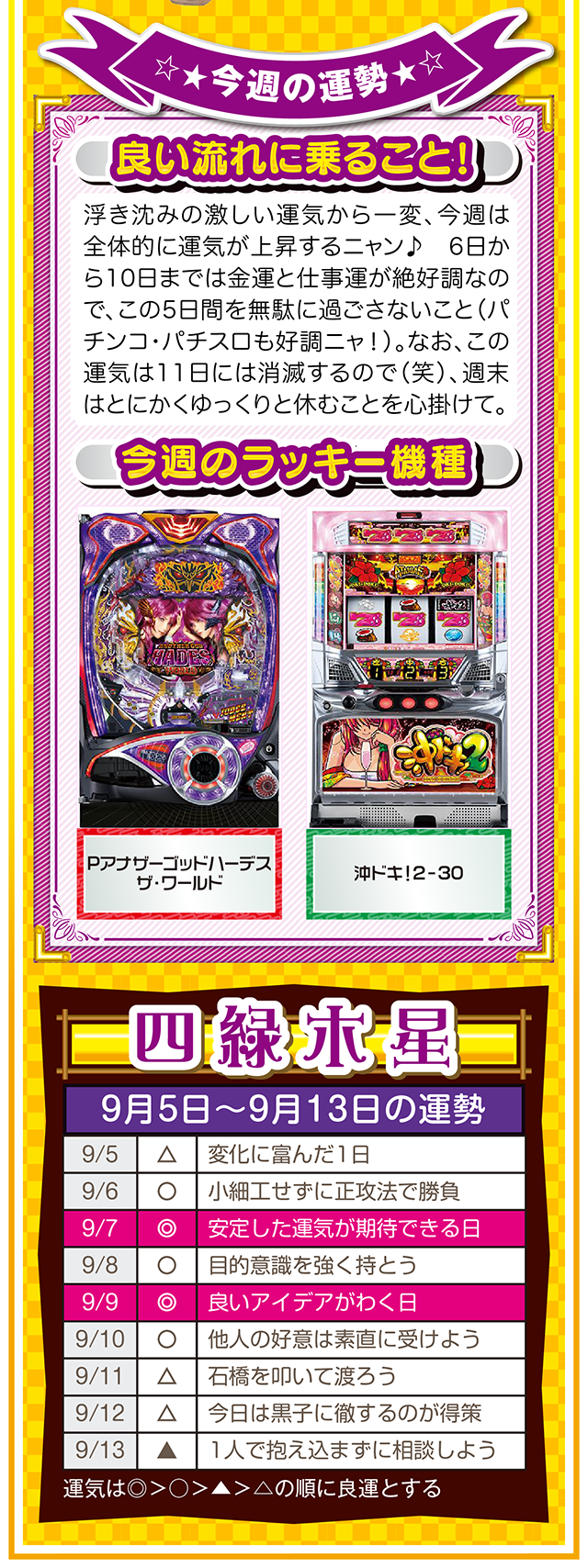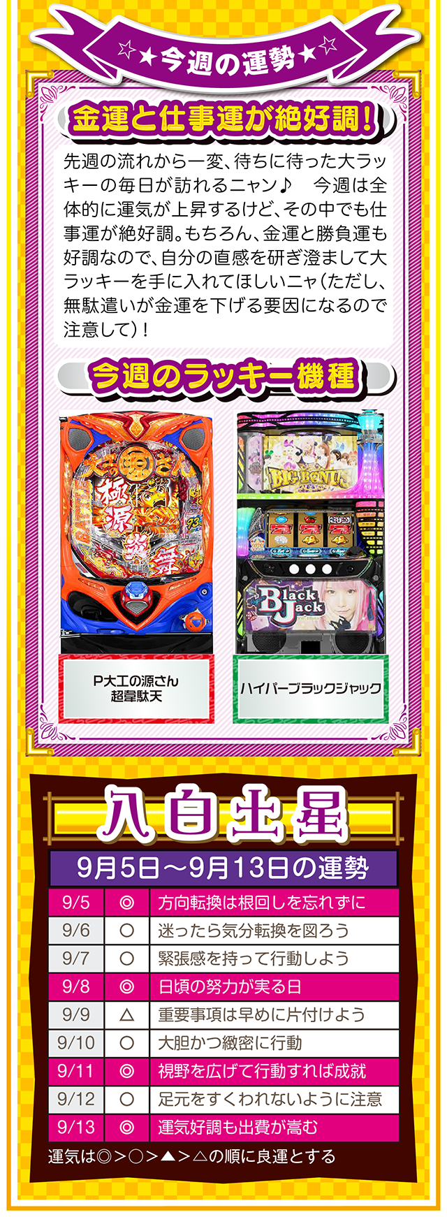 もし幸せになりたいのなら、「生きていることに感謝できる人」になること。この法則を知れば、運とかツキも必ず味方してくれるニャン……というわけで早速、9月7日から13日の1週間を鑑定ニャ(冷蔵庫と電子レンジが同時に壊れてもなお引きつり笑顔を絶やさないフォー・チュンチュンが、今週もオマケとして5日と6日の運勢も鑑定したニャン♡)!