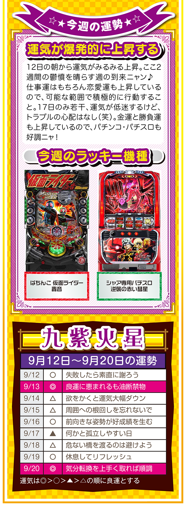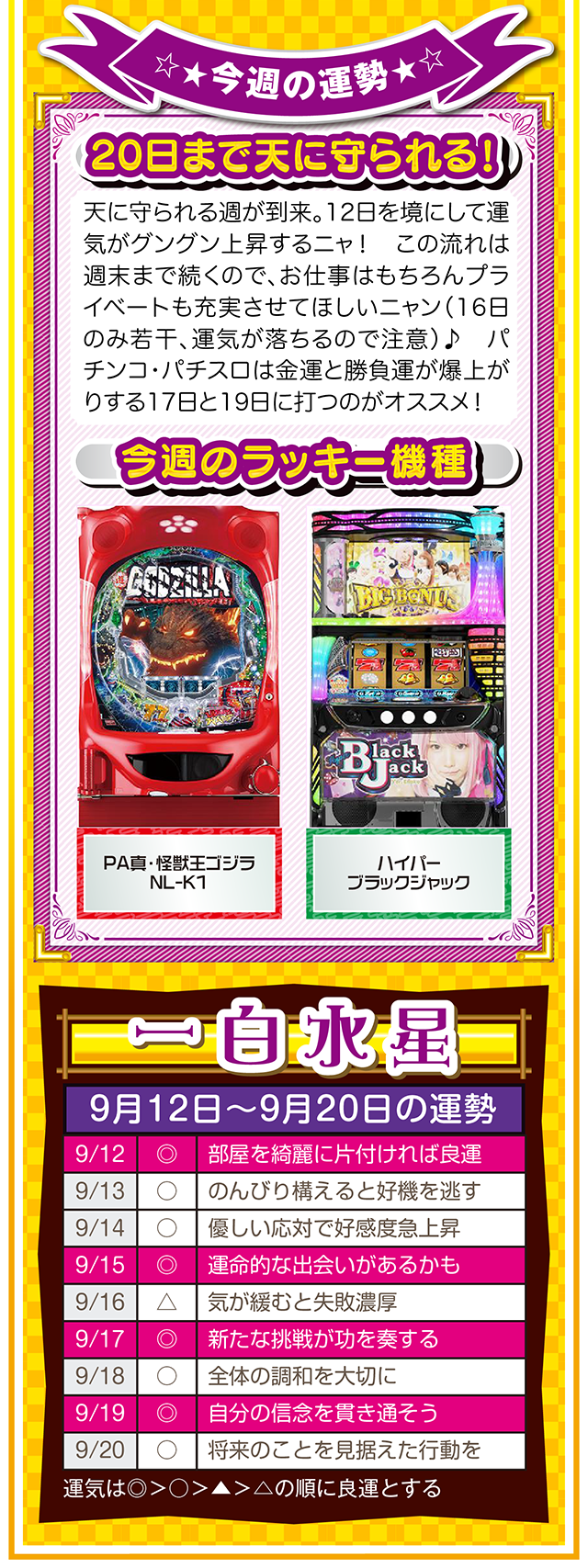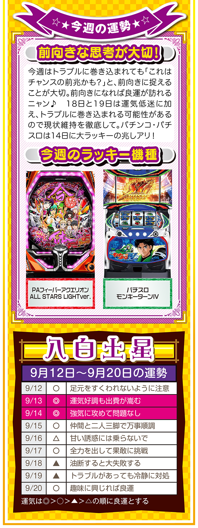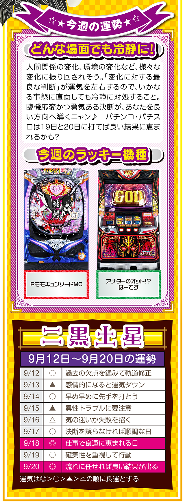 「ポジティブに想像する」ことを「当たり前の日常」にすること。これを実践するだけで、運気がみるみる上昇するはずニャン……というわけで早速、9月14日から20日の1週間を鑑定ニャ(男にフラれた後に必ず3キロ太るフォー・チュンチュンが、今週もオマケとして12日と13日の運勢も鑑定したニャン♡)!