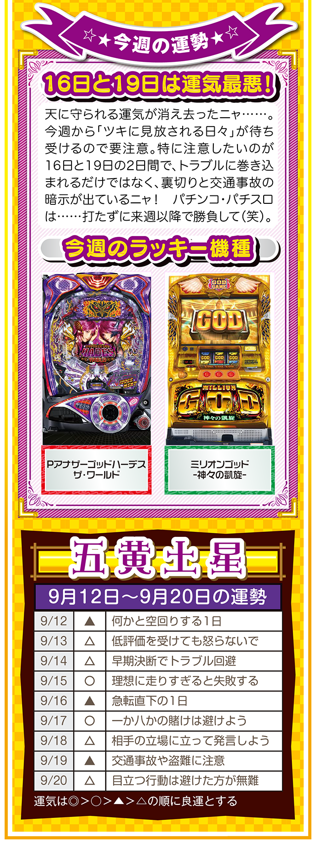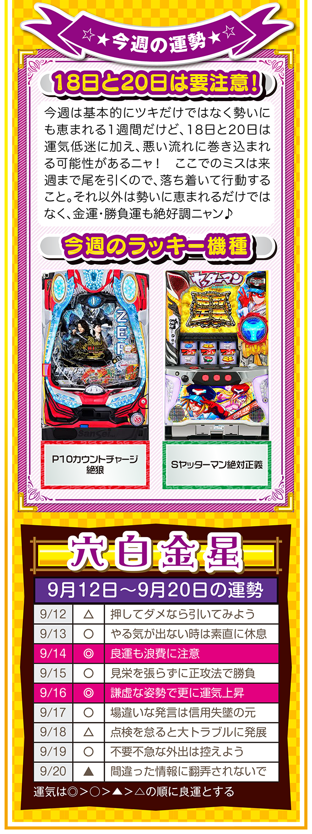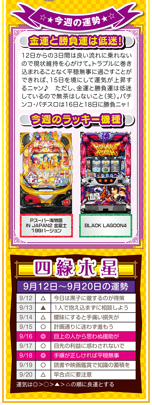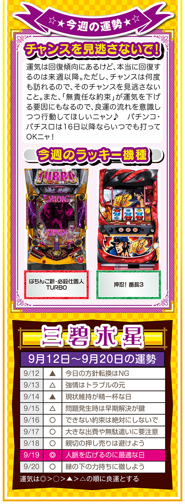 「ポジティブに想像する」ことを「当たり前の日常」にすること。これを実践するだけで、運気がみるみる上昇するはずニャン……というわけで早速、9月14日から20日の1週間を鑑定ニャ(男にフラれた後に必ず3キロ太るフォー・チュンチュンが、今週もオマケとして12日と13日の運勢も鑑定したニャン♡)!
