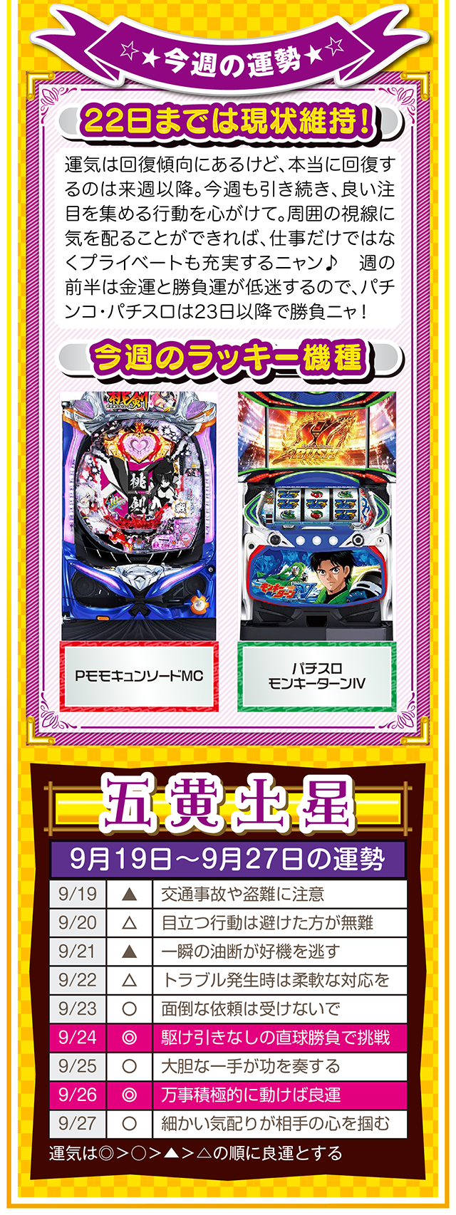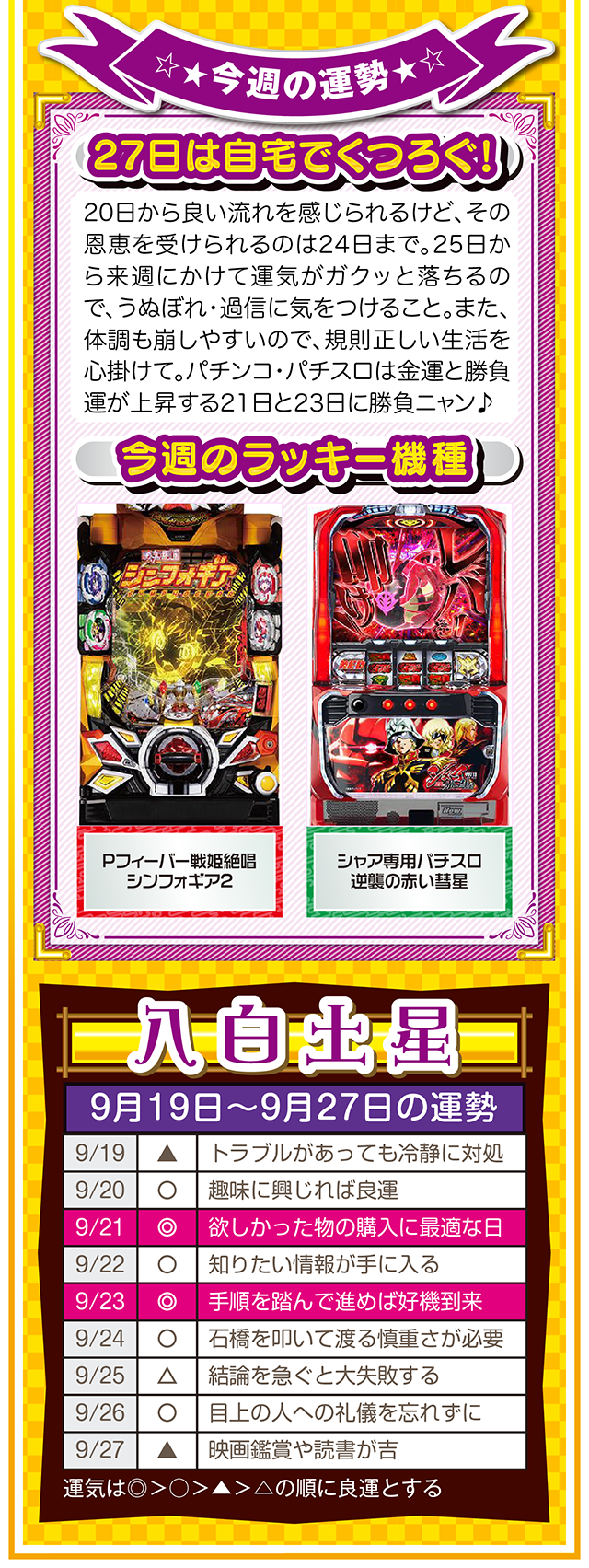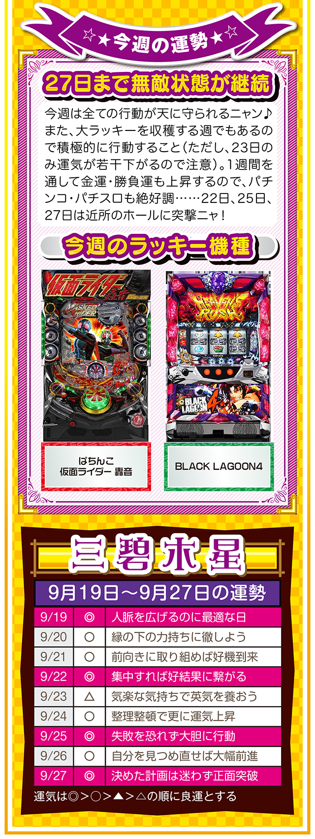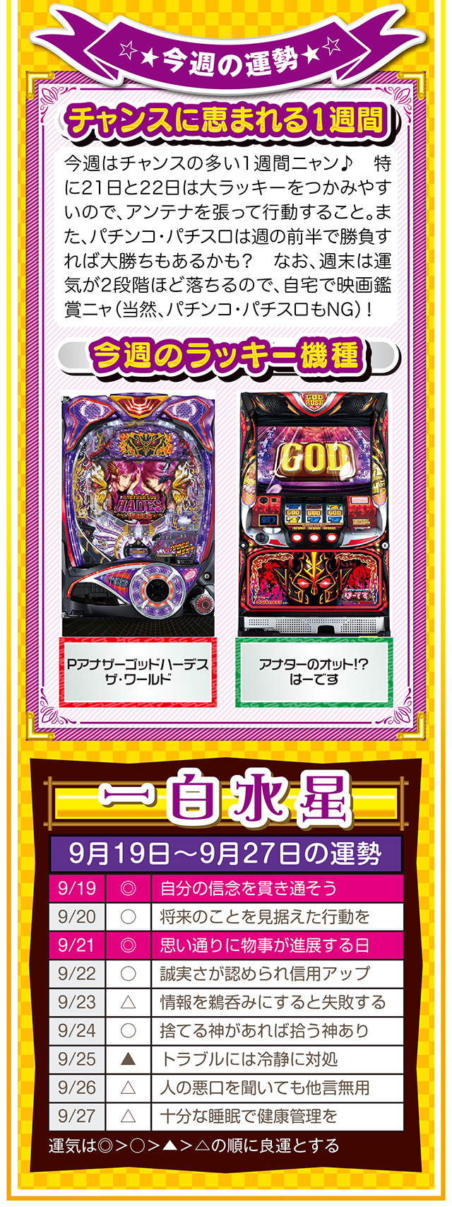 負の要素を「マイナス」と捉える前に、もっと広い視点・心で受け入れて理解する。そして負の要素をポジティブに考える習慣が身につけば、あなたの視界がパァーーーッと明るくなるはずニャン……というわけで早速、9月21日から27日の1週間を鑑定ニャ(「婚活パーティへの投資は未来への投資」と言い聞かせているフォー・チュンチュンが、今週もオマケとして19日と20日の運勢も鑑定したニャン♡)!