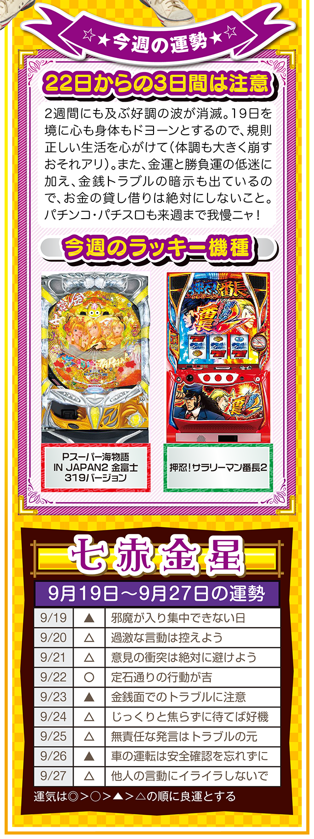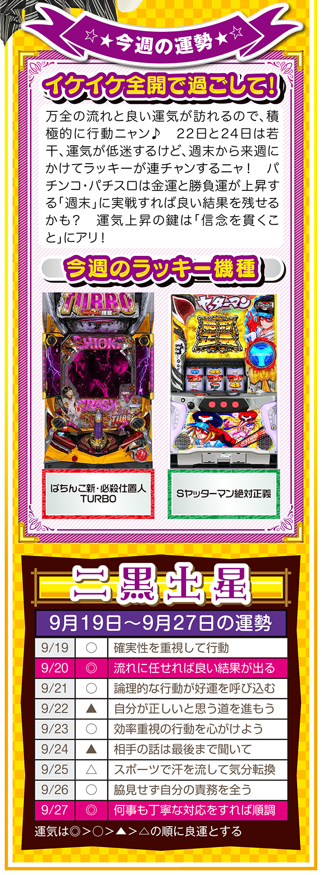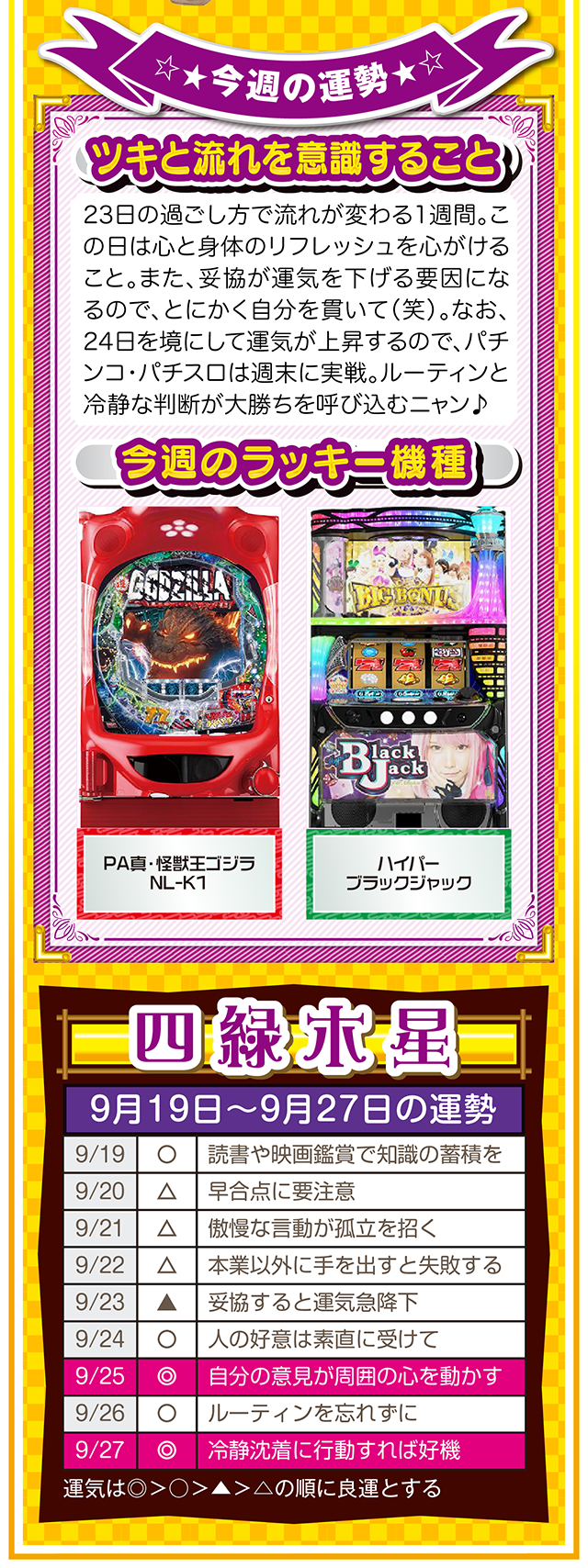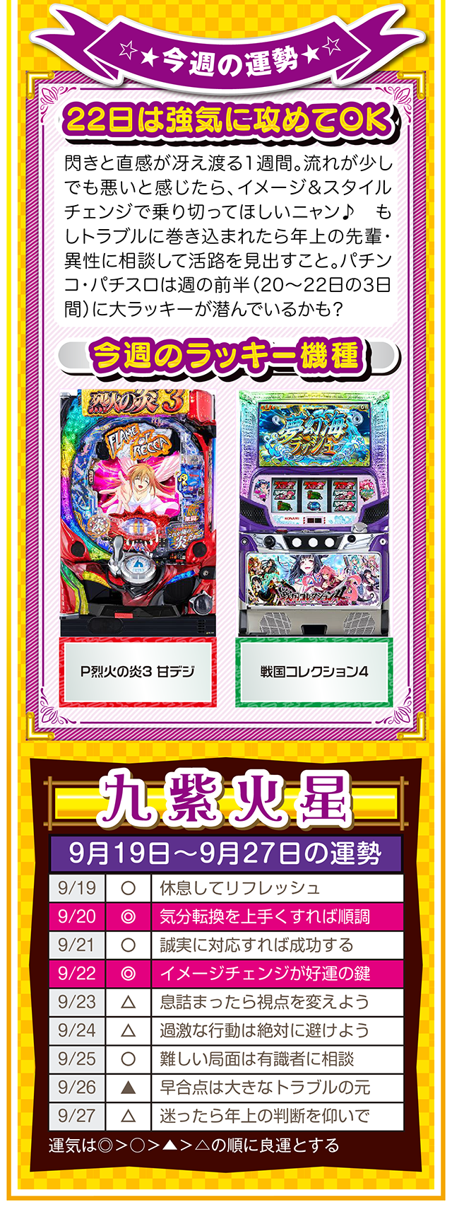 負の要素を「マイナス」と捉える前に、もっと広い視点・心で受け入れて理解する。そして負の要素をポジティブに考える習慣が身につけば、あなたの視界がパァーーーッと明るくなるはずニャン……というわけで早速、9月21日から27日の1週間を鑑定ニャ(「婚活パーティへの投資は未来への投資」と言い聞かせているフォー・チュンチュンが、今週もオマケとして19日と20日の運勢も鑑定したニャン♡)!