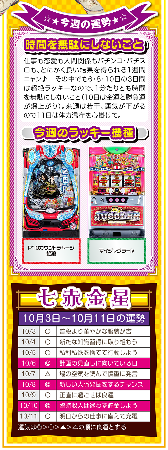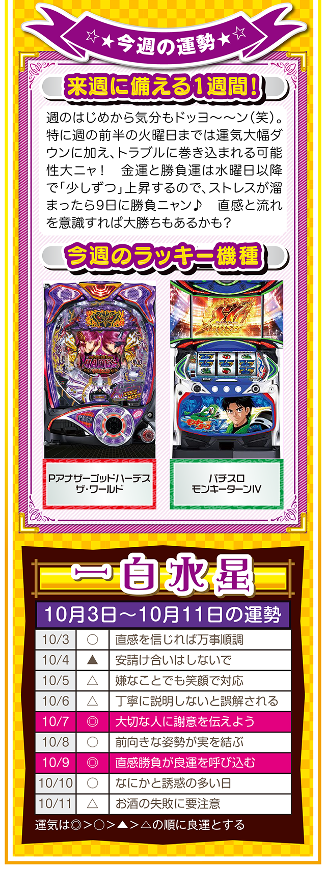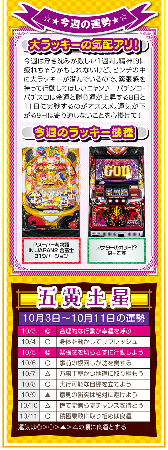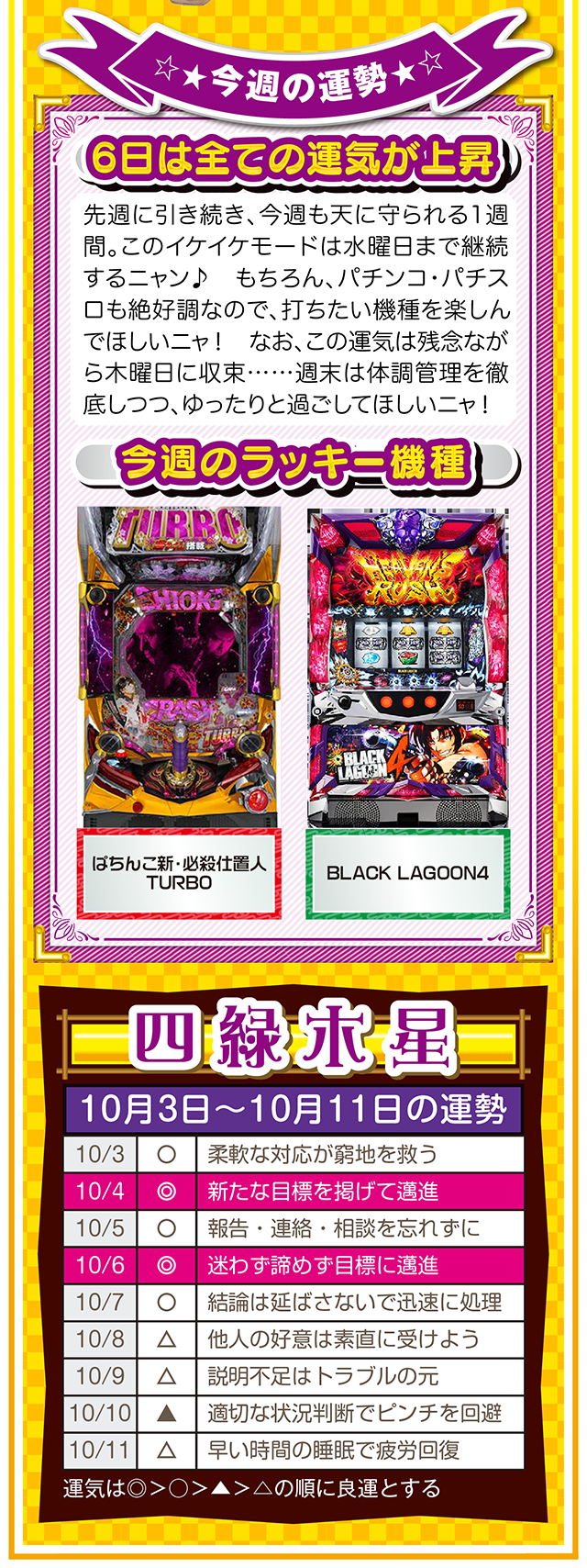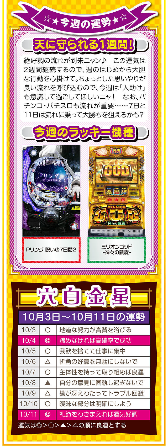 失うことを恐れずに、失うことを楽しむ。それに気付くことができれば、失うもの以上の幸せが、あなたのもとに訪れるニャン……というわけで早速、10月5日から11日の1週間を鑑定ニャ(溜まりに溜まった脂肪をとにかく手放したいフォー・チュンチュンが、今週もオマケとして10月3日と4日の運勢も鑑定したニャン♡)!