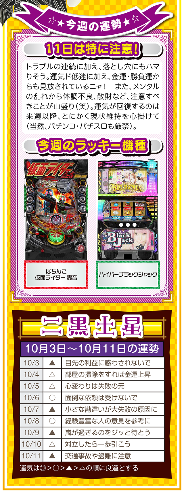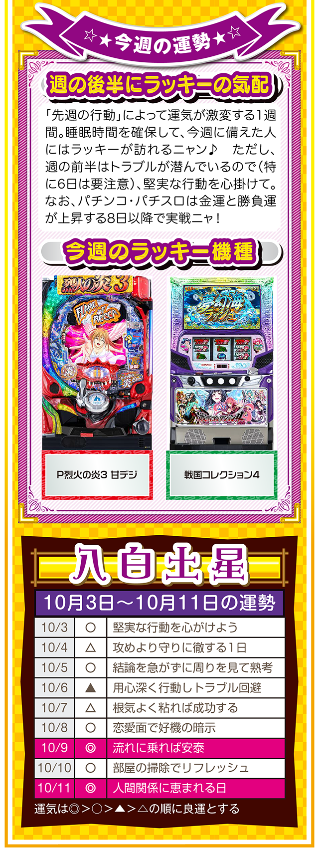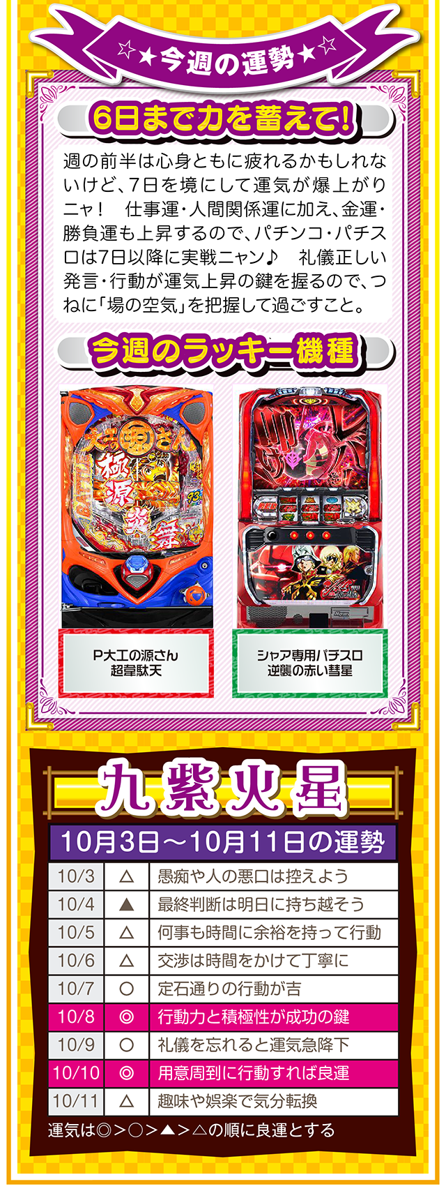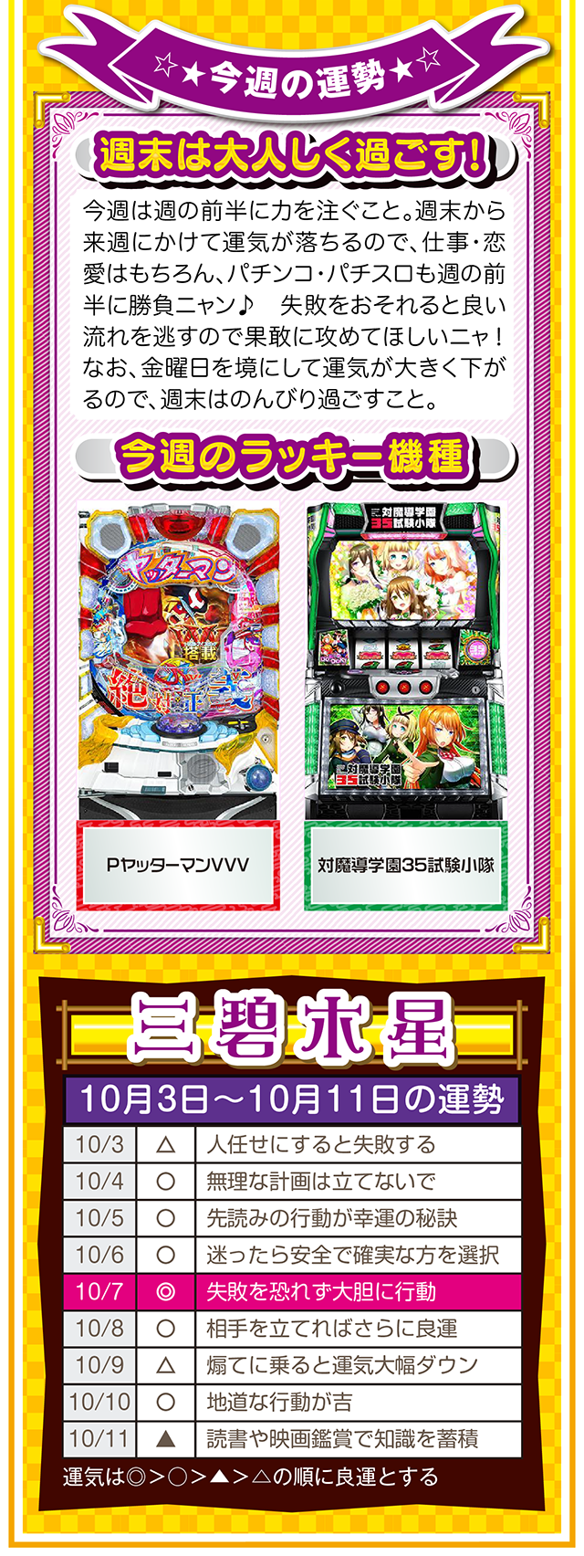 失うことを恐れずに、失うことを楽しむ。それに気付くことができれば、失うもの以上の幸せが、あなたのもとに訪れるニャン……というわけで早速、10月5日から11日の1週間を鑑定ニャ(溜まりに溜まった脂肪をとにかく手放したいフォー・チュンチュンが、今週もオマケとして10月3日と4日の運勢も鑑定したニャン♡)!