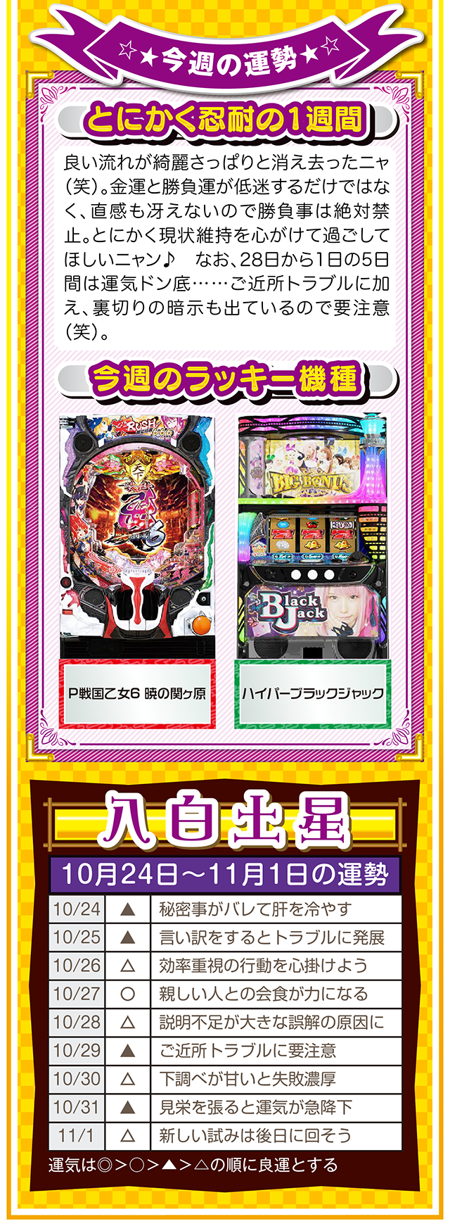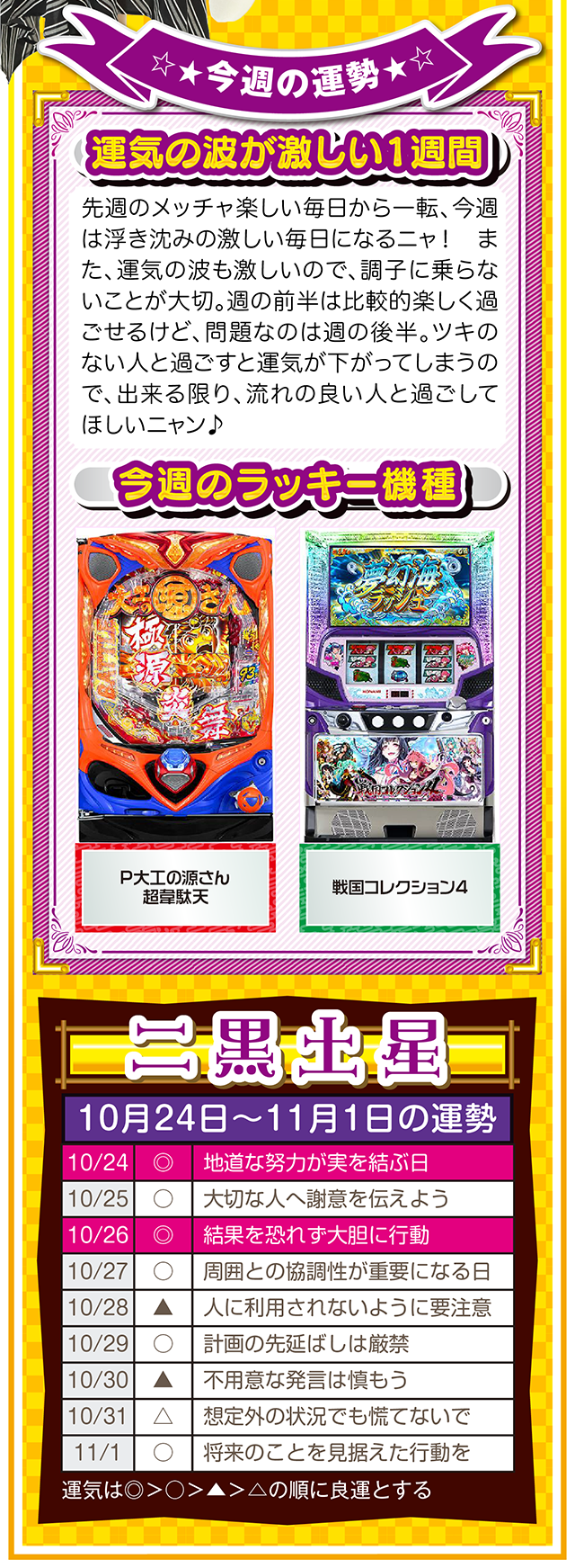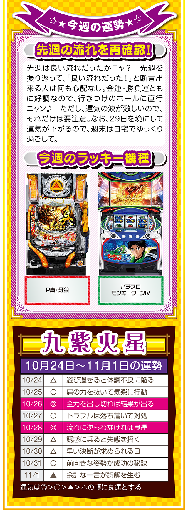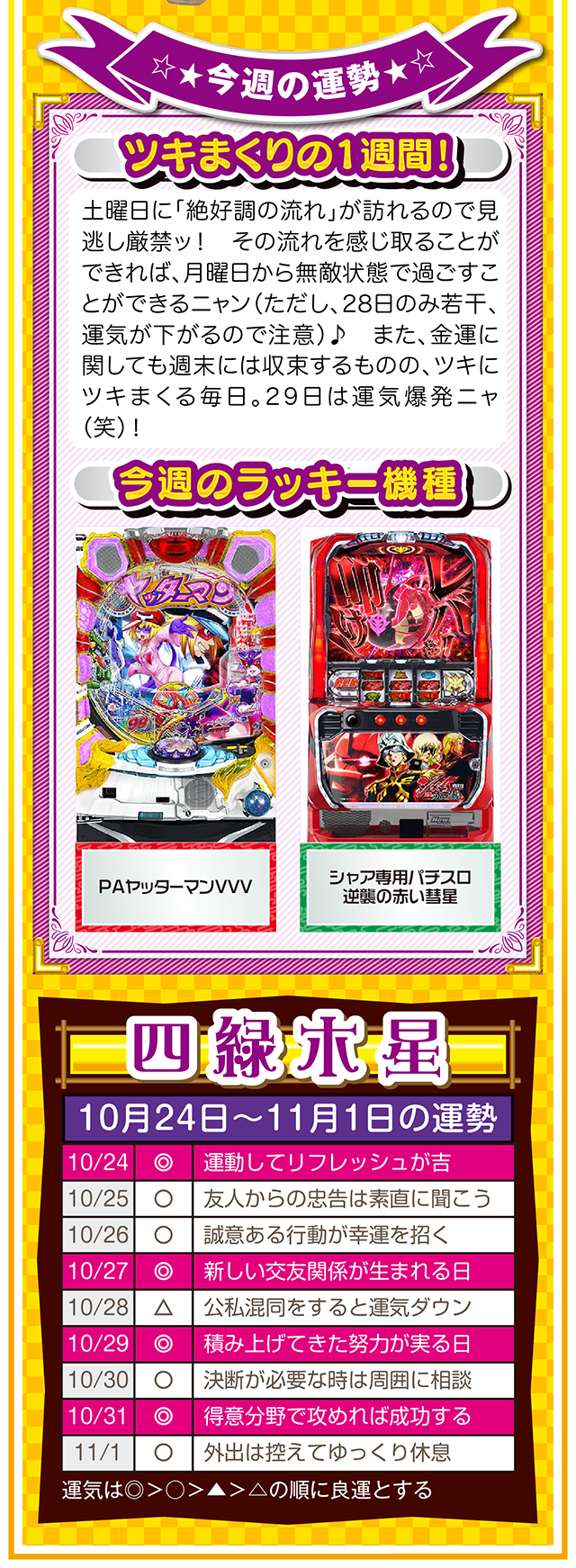 周りの人を笑顔にしているのか、喜ばせているのか、感謝しているのか? 不幸な選択をしないためにも、つねに感謝を忘れない選択を取り続けてほしいニャン…………というわけで早速、10月26日から11月1日の1週間を鑑定ニャ(読者の皆様に愛を届けまくる「ザ・独身」のフォー・チュンチュンが、今週もオマケとして10月24日と25日の運勢も鑑定したニャン♡)!