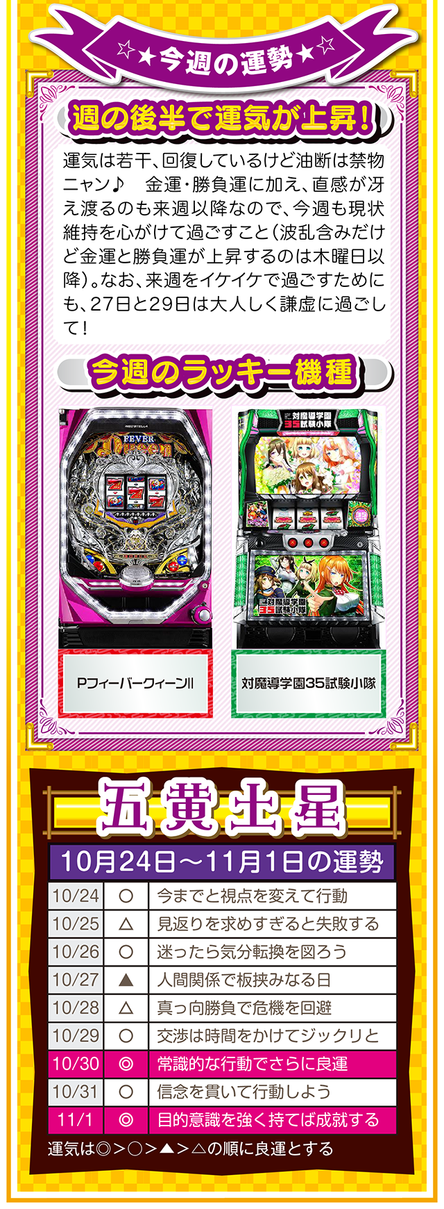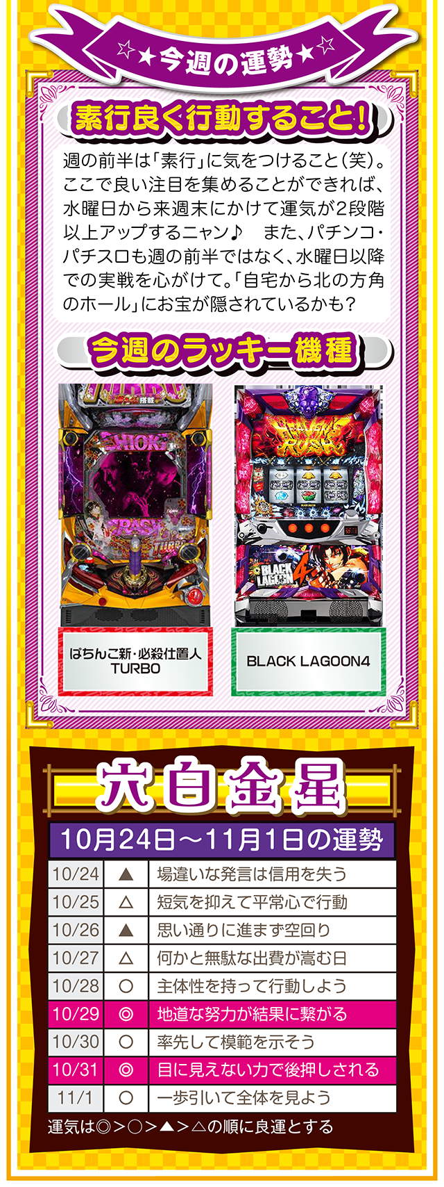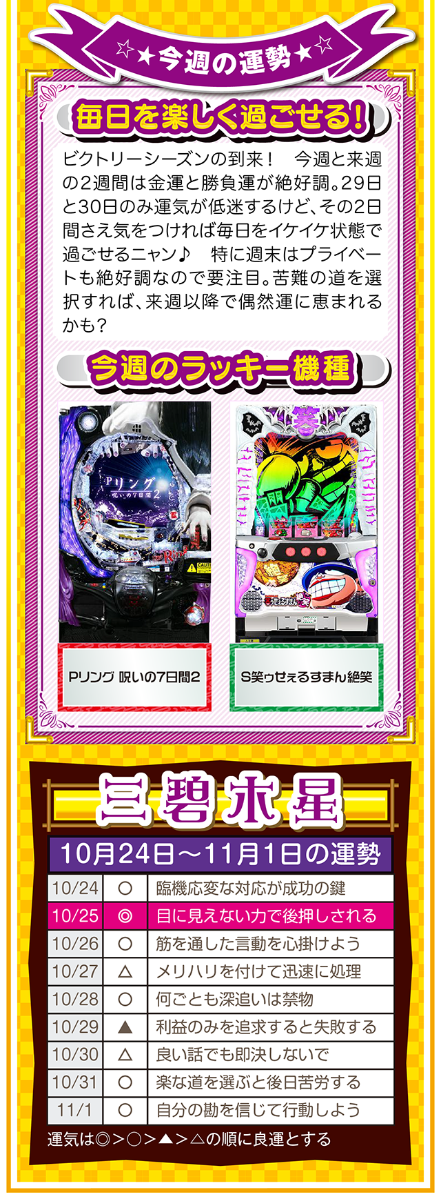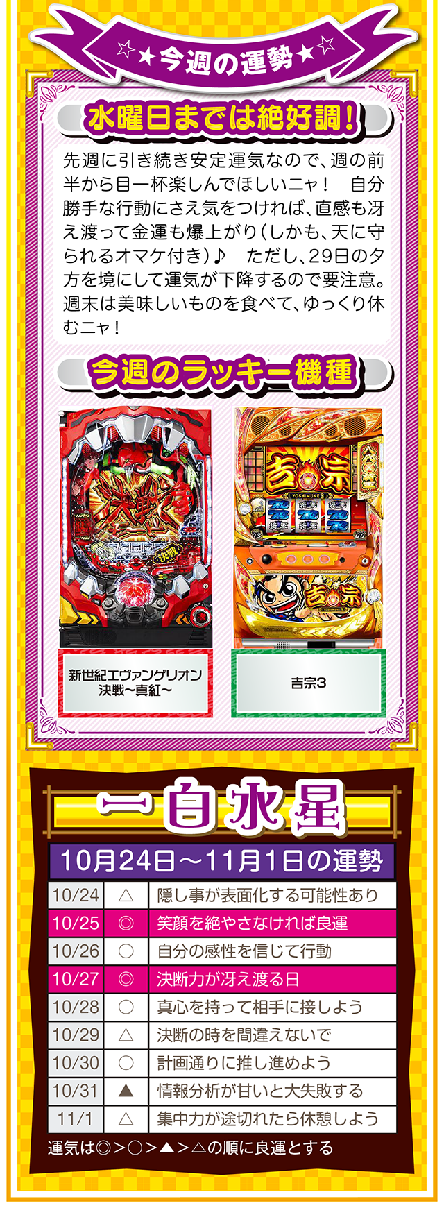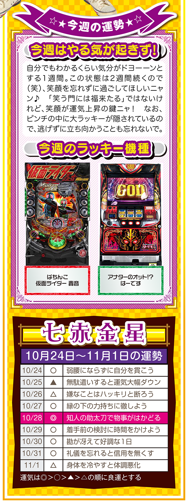 周りの人を笑顔にしているのか、喜ばせているのか、感謝しているのか? 不幸な選択をしないためにも、つねに感謝を忘れない選択を取り続けてほしいニャン…………というわけで早速、10月26日から11月1日の1週間を鑑定ニャ(読者の皆様に愛を届けまくる「ザ・独身」のフォー・チュンチュンが、今週もオマケとして10月24日と25日の運勢も鑑定したニャン♡)!