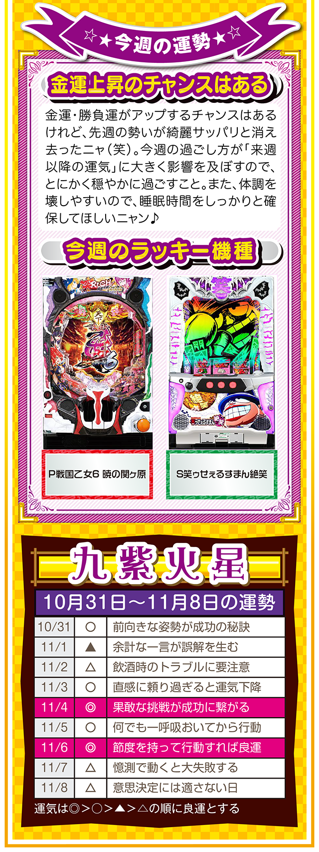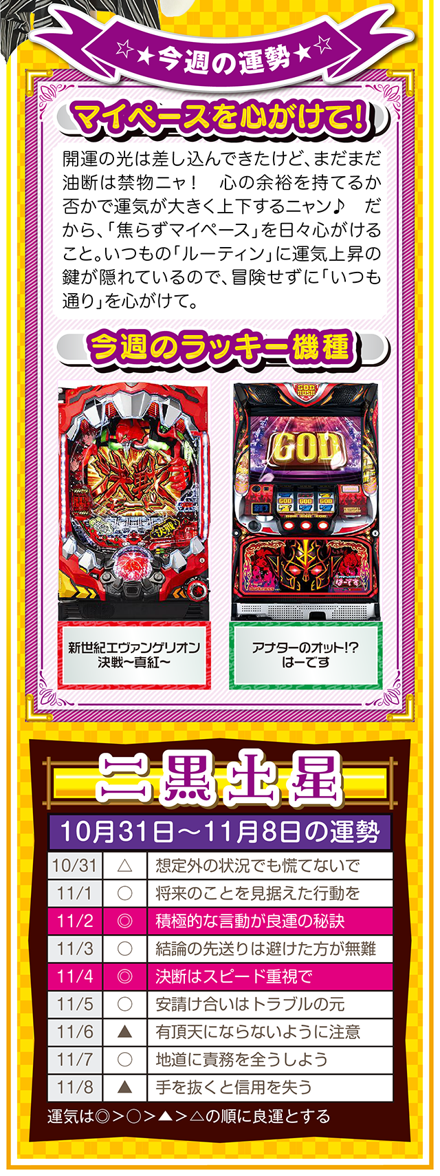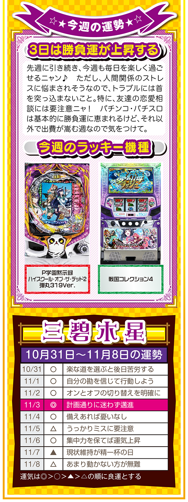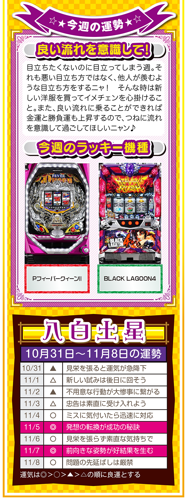そんな時間があるなら、尊敬できる人・憧れを抱く人に近づけるよう、努力した方がいいニャン♪ その行動が結果として、良い流れをつかむキッカケになるのだから……というわけで早速、11月2日から8日の1週間を鑑定ニャ(歩きスマホに対するイライラが止まらないフォー・チュンチュンが、今週もオマケとして10月31日と11月1日の運勢も鑑定したニャン♡)!