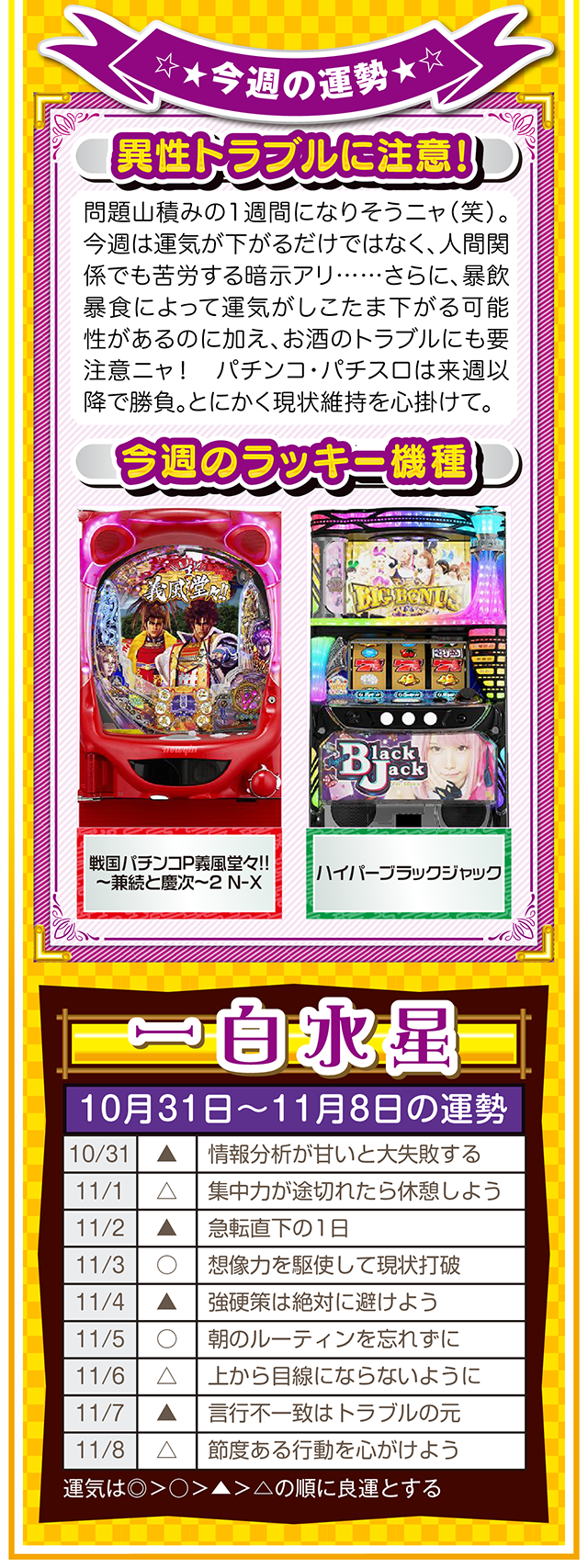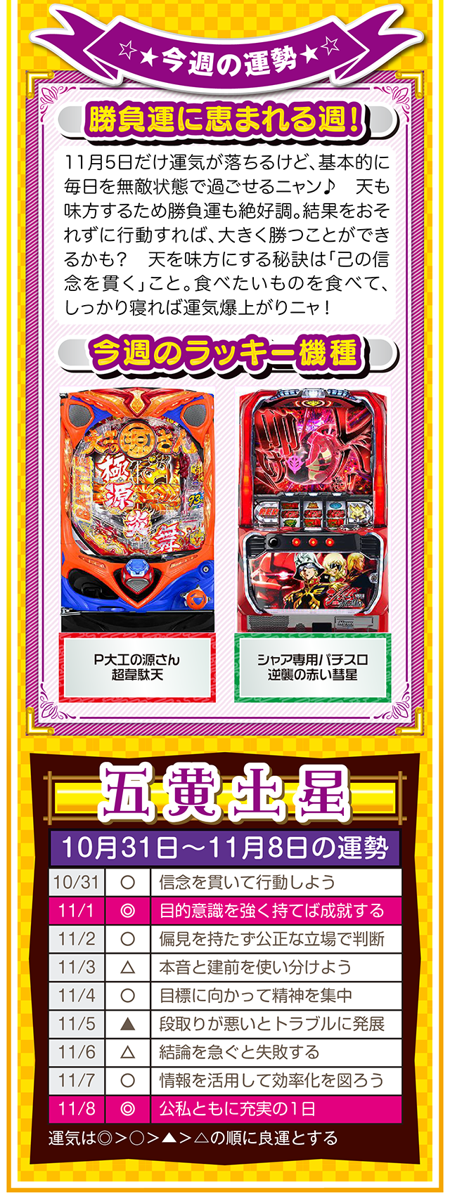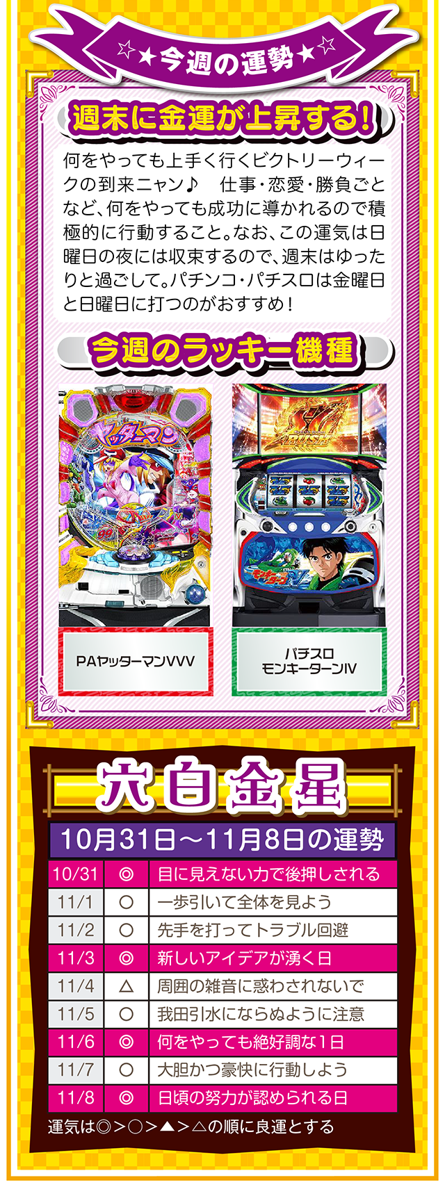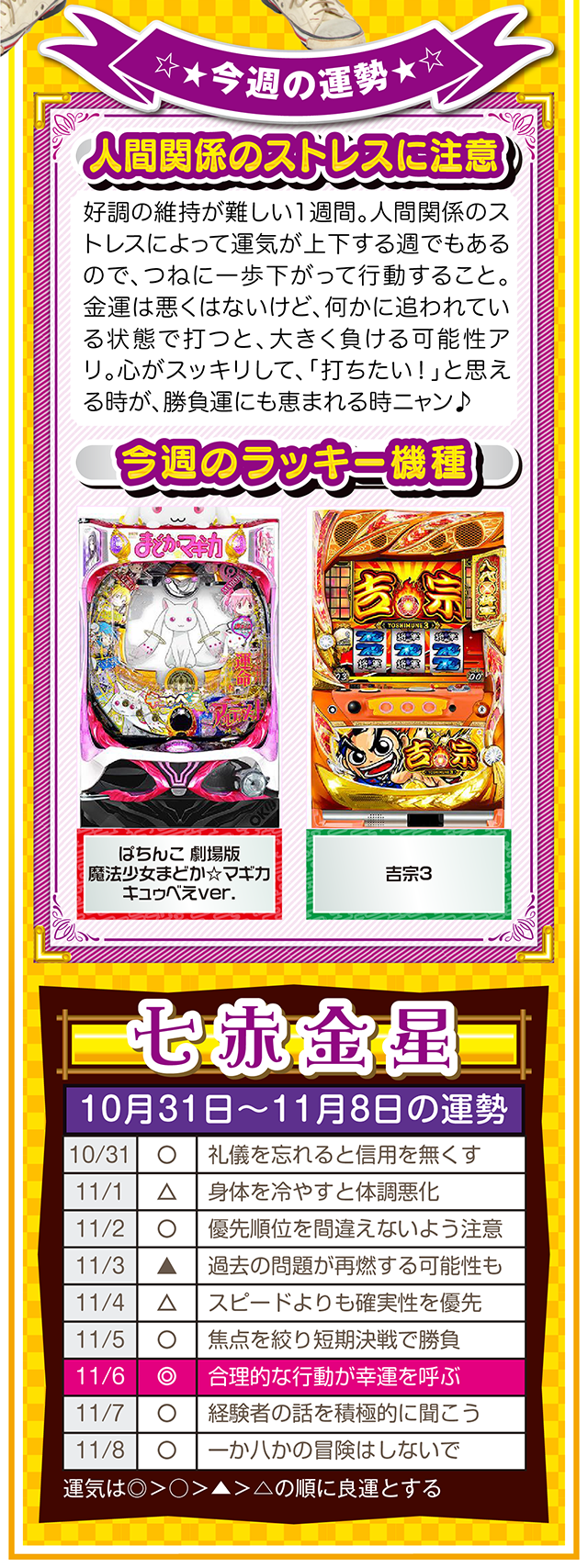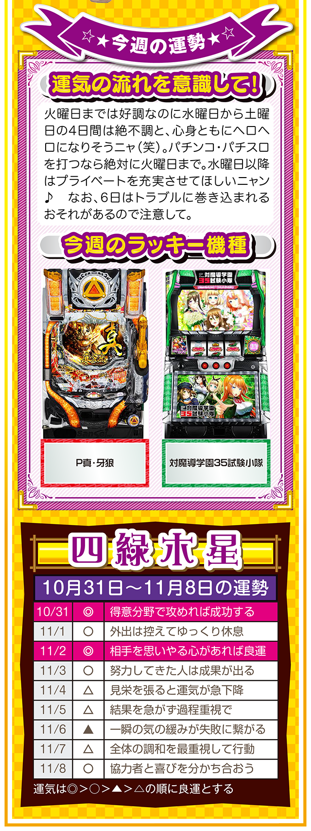 そんな時間があるなら、尊敬できる人・憧れを抱く人に近づけるよう、努力した方がいいニャン♪ その行動が結果として、良い流れをつかむキッカケになるのだから……というわけで早速、11月2日から8日の1週間を鑑定ニャ(歩きスマホに対するイライラが止まらないフォー・チュンチュンが、今週もオマケとして10月31日と11月1日の運勢も鑑定したニャン♡)!