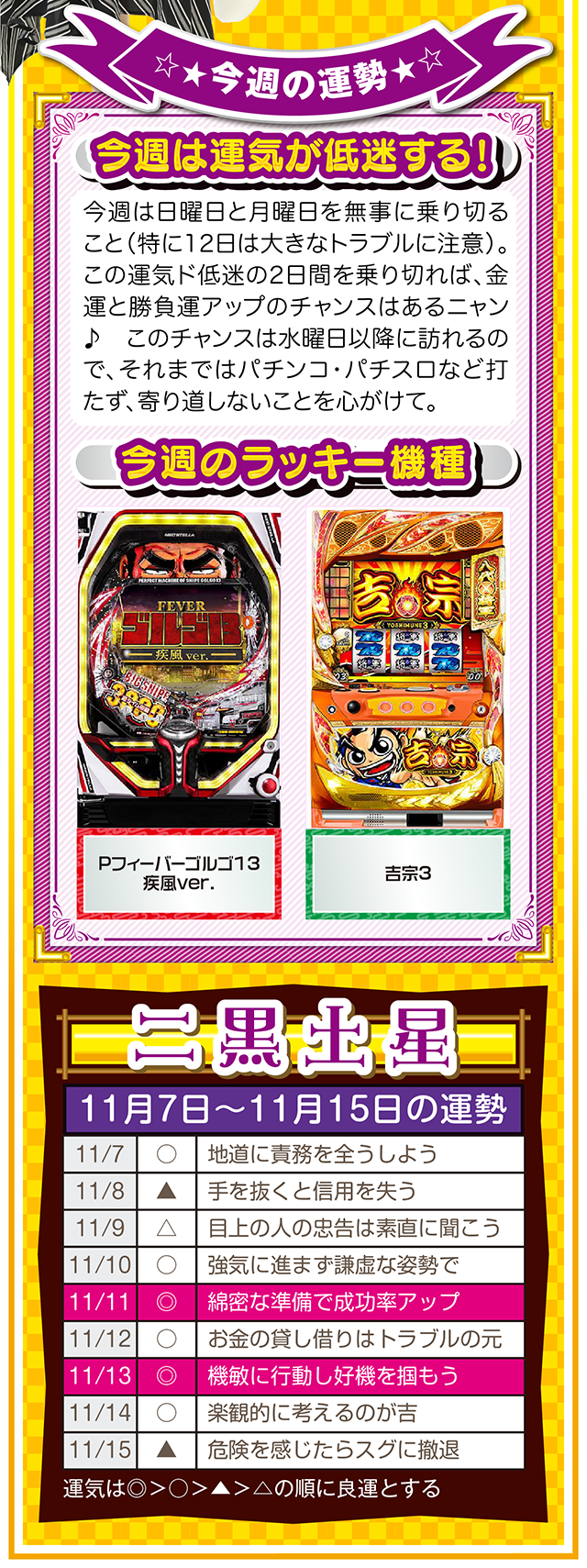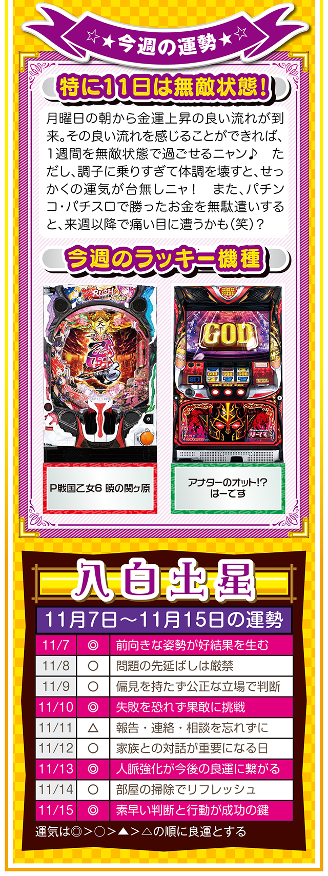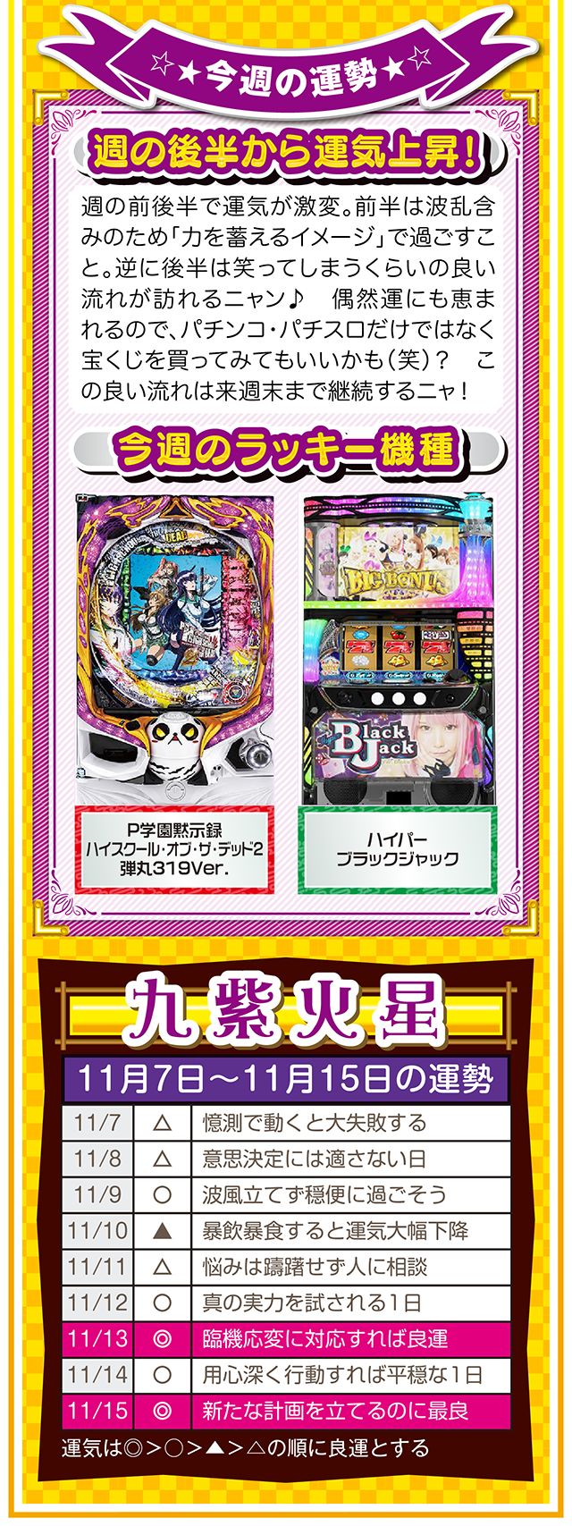 苦労や困難、そして高い壁は誰にでも現れる。また、運の流れが悪い日も当然あるけど、その日を「現状維持」と「準備」に費やせば、必ず良い流れを察知できるニャ。というわけで早速、11月9日から15日の1週間を鑑定ニャ(良い流れを意識しても男運が一向に上がらないフォー・チュンチュンが、今週もオマケとして11月7日と8日の運勢も鑑定したニャン♡)!