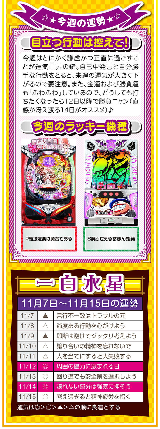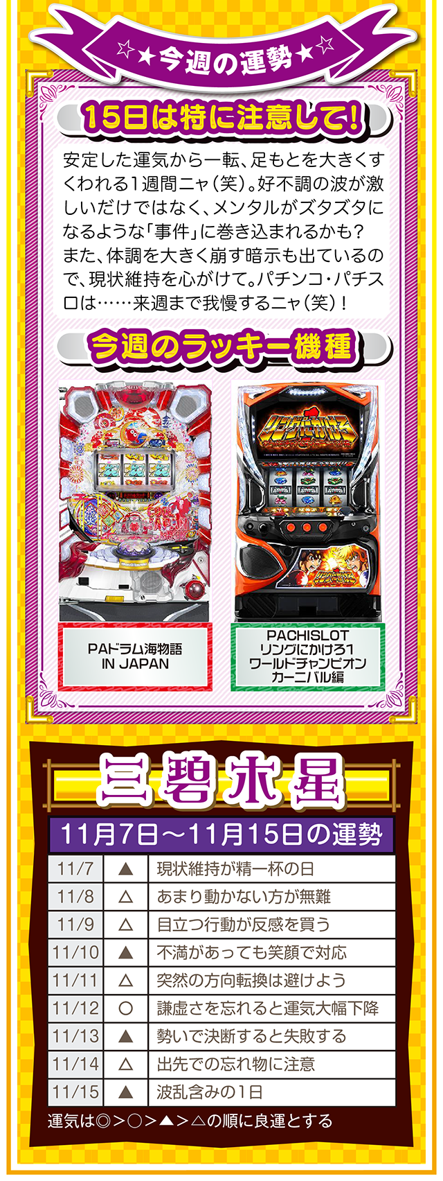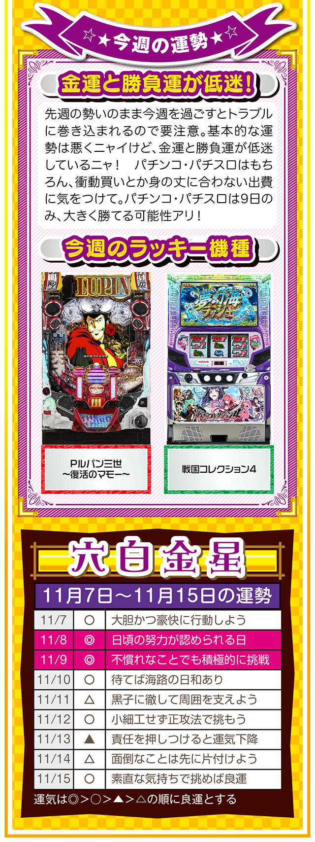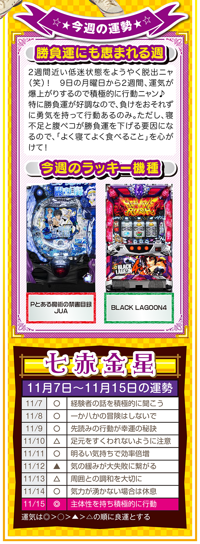 苦労や困難、そして高い壁は誰にでも現れる。また、運の流れが悪い日も当然あるけど、その日を「現状維持」と「準備」に費やせば、必ず良い流れを察知できるニャ。というわけで早速、11月9日から15日の1週間を鑑定ニャ(良い流れを意識しても男運が一向に上がらないフォー・チュンチュンが、今週もオマケとして11月7日と8日の運勢も鑑定したニャン♡)!