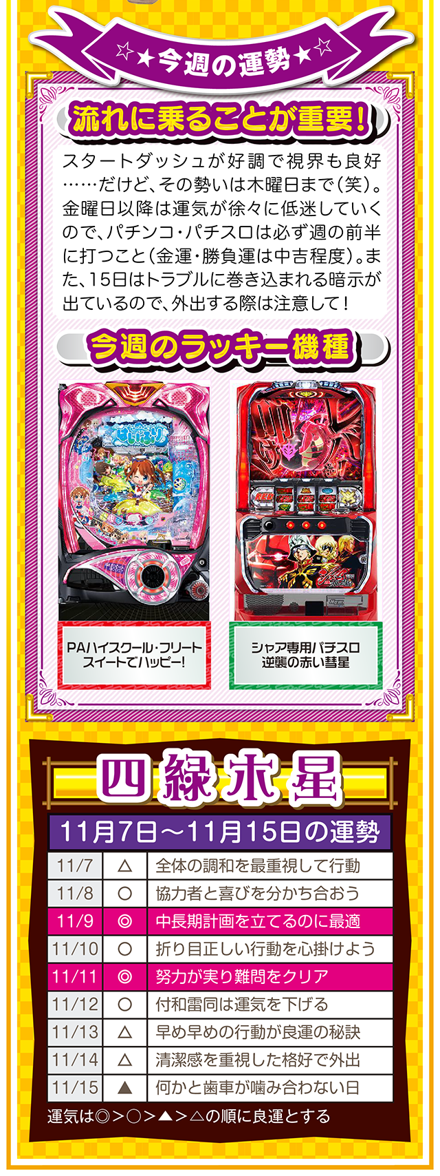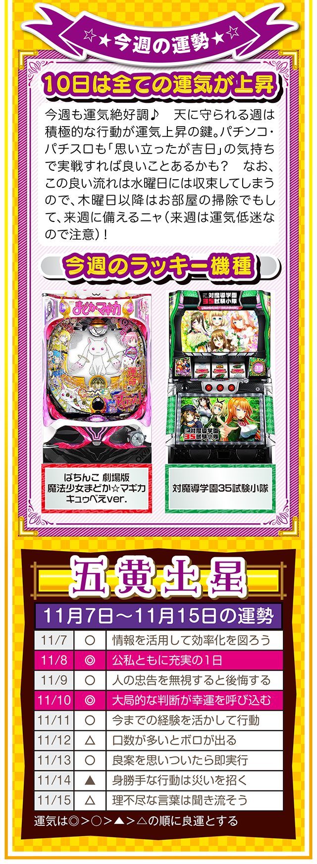 さらーっと流し見でもいいけど、運勢が「◎の日」と「×の日」だけでも注目した方がいいニャ!