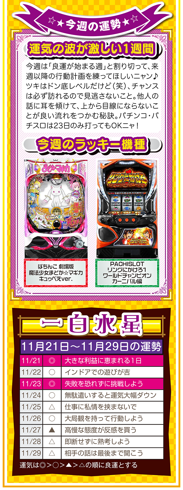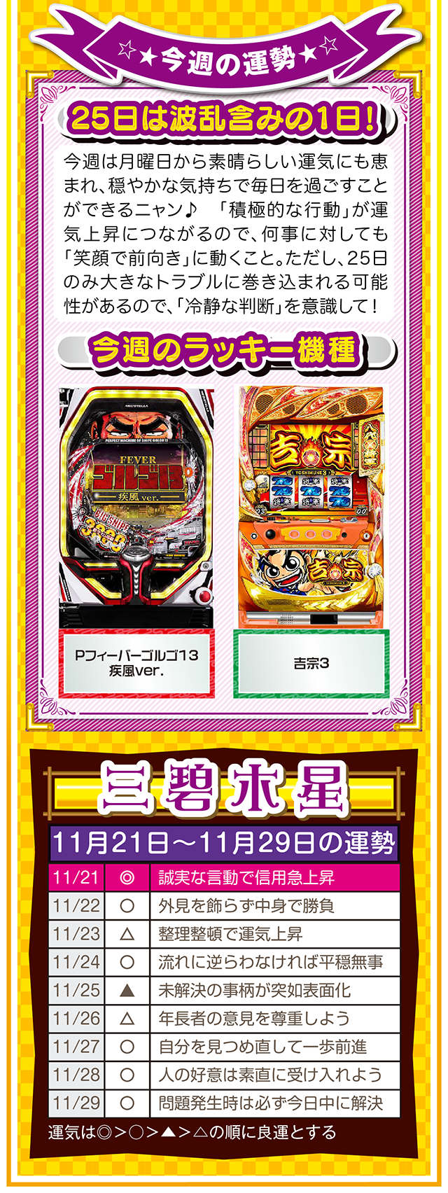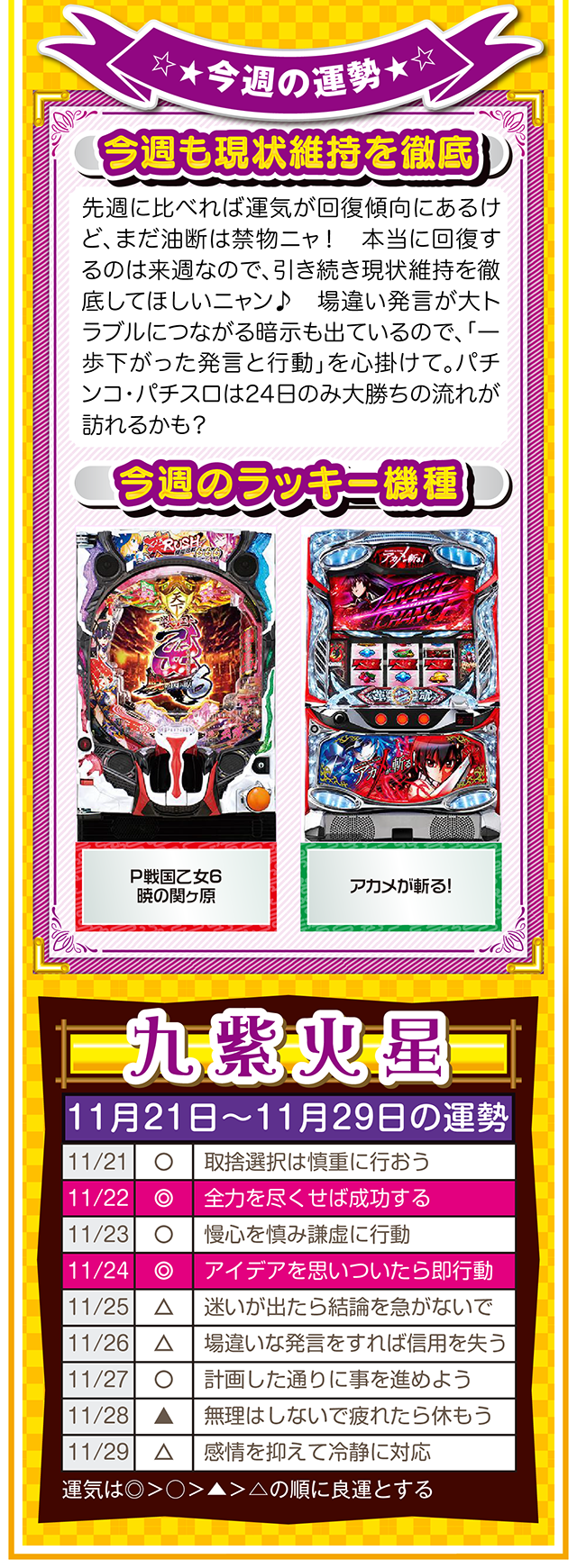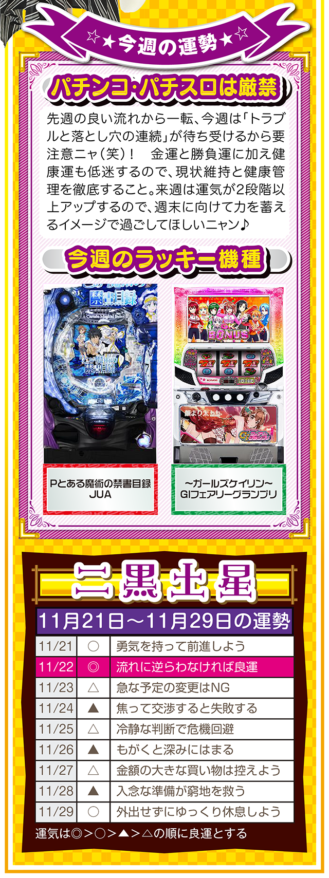 どんな本にも必ず、未知の世界があって新しい言葉がある。壁にぶつかったり、人間関係に悩んだりしたら本を読む。また、成功したい、お金持ちになりたいと思うなら本を読む。本屋さんは人生を豊かにするパワースポットということを覚えておいてほしいニャン……というわけで早速、11月23日から29日の1週間を鑑定ニャ(鬼滅の刃の17巻以降が買えなくてモヤモヤするフォー・チュンチュンが、今週もオマケとして11月21日と22日の運勢も鑑定したニャン♡)!