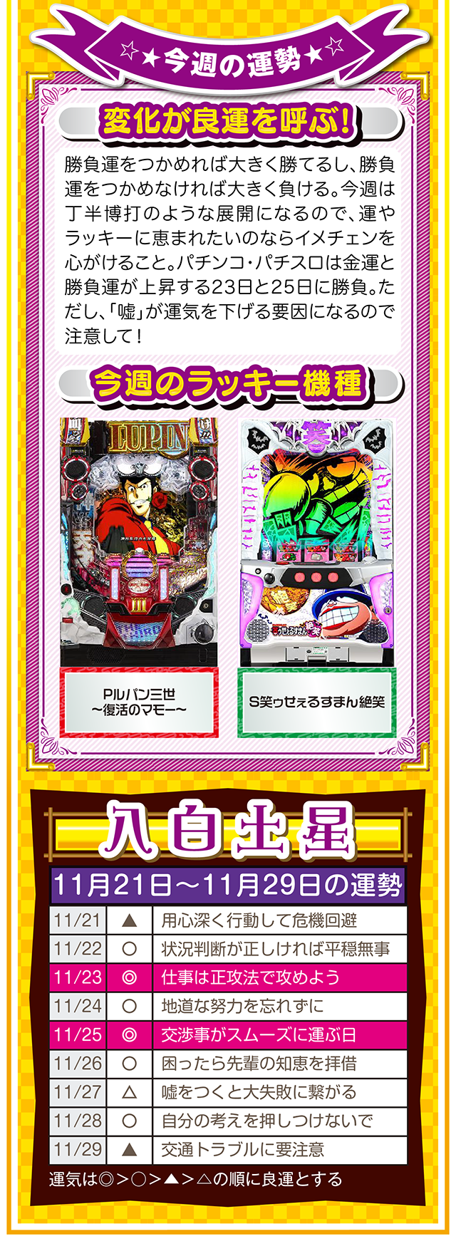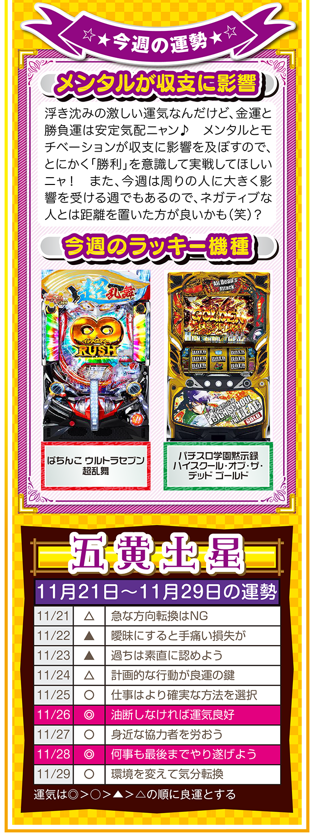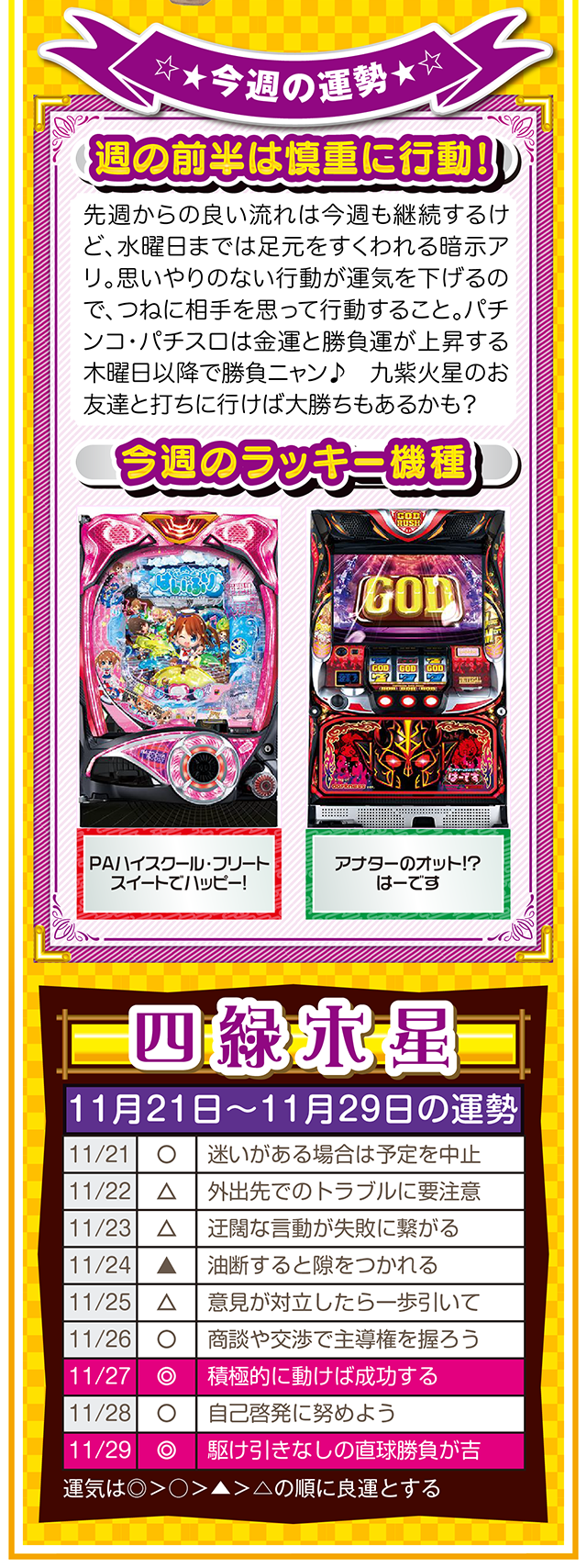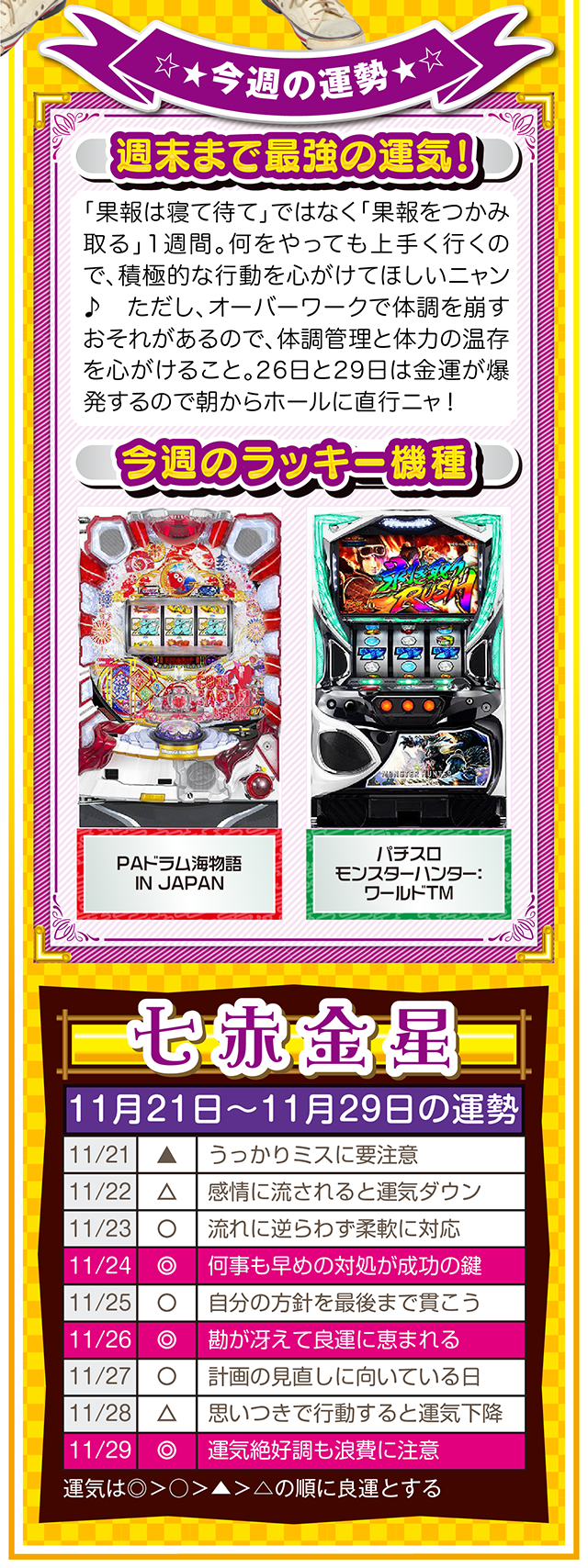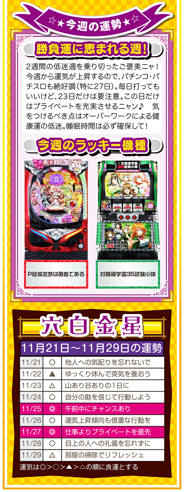 どんな本にも必ず、未知の世界があって新しい言葉がある。壁にぶつかったり、人間関係に悩んだりしたら本を読む。また、成功したい、お金持ちになりたいと思うなら本を読む。本屋さんは人生を豊かにするパワースポットということを覚えておいてほしいニャン……というわけで早速、11月23日から29日の1週間を鑑定ニャ(鬼滅の刃の17巻以降が買えなくてモヤモヤするフォー・チュンチュンが、今週もオマケとして11月21日と22日の運勢も鑑定したニャン♡)!