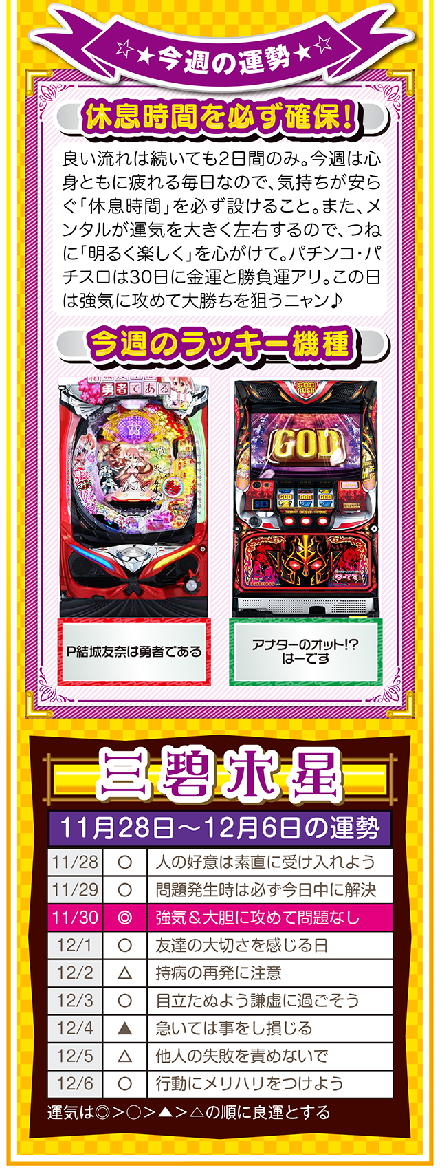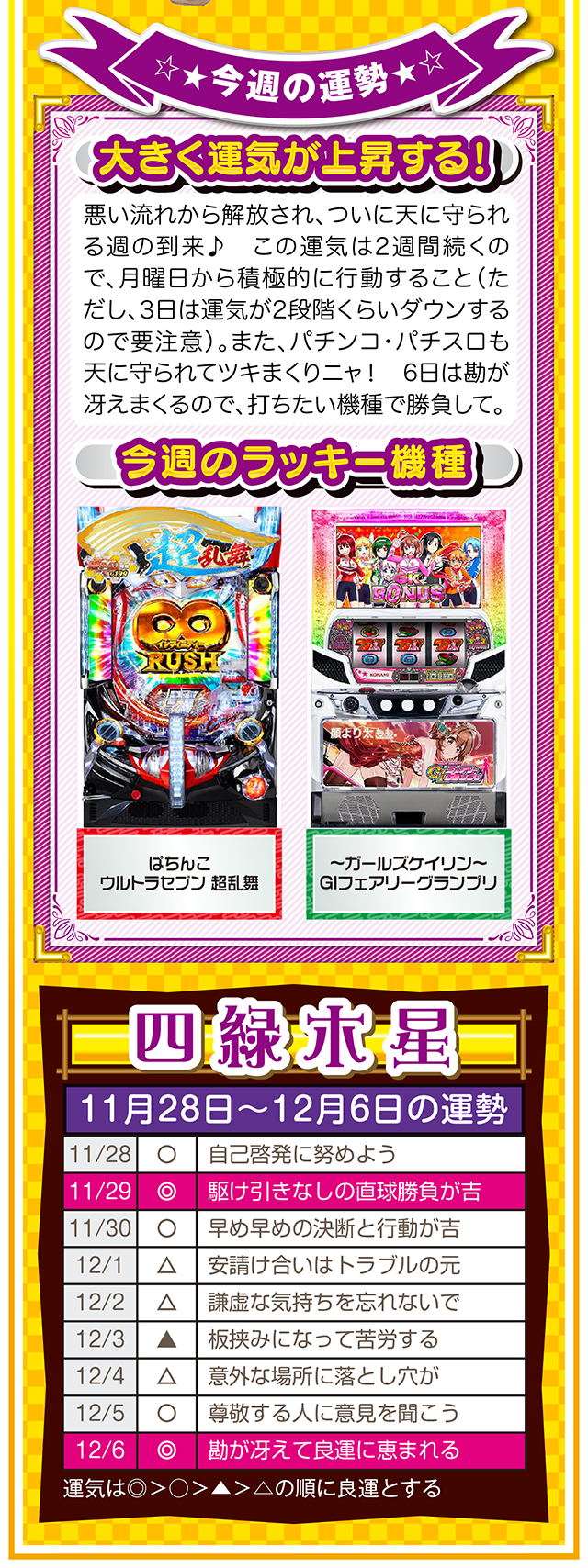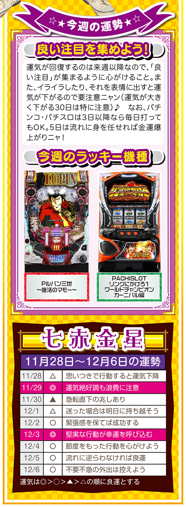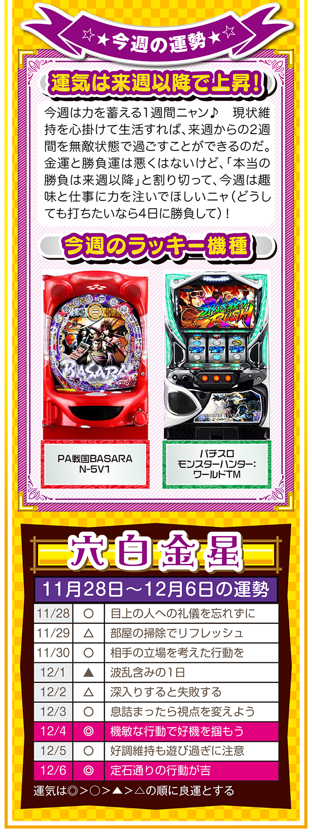 フォー・チュンチュンのブログには「運気カレンダー」を掲載しているので、自分を知る時間がない人は、その流れに心の状態を合わせてみるといいかも? ◎の日は間違いなく、心のリズムが絶好調ニャン……というわけで早速、11月30日から12月6日の1週間を鑑定ニャ(心のリズムを整えているのに未だ独身のフォー・チュンチュンが、今週もオマケとして11月28日と29日の運勢も鑑定したニャン♡)!