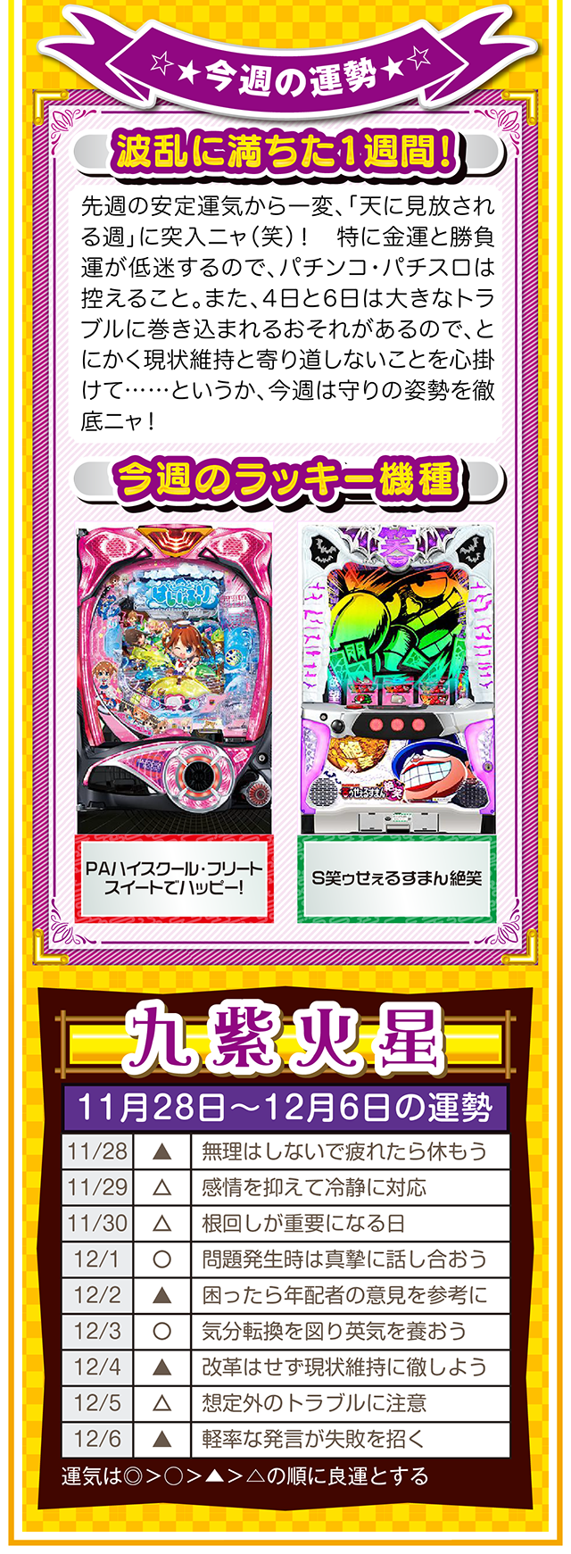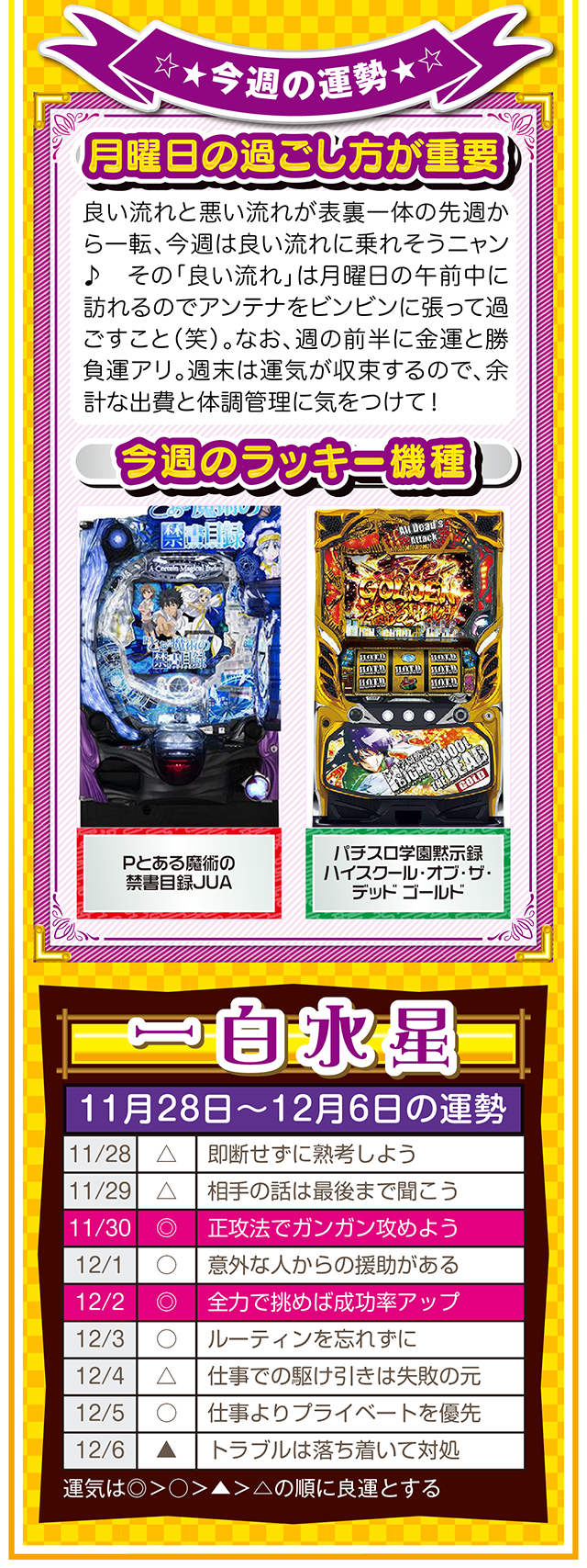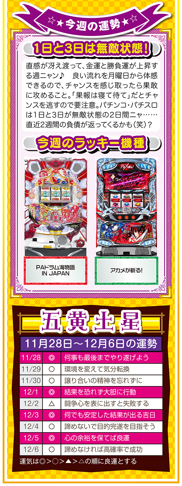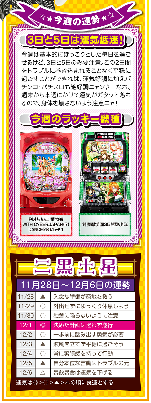 フォー・チュンチュンのブログには「運気カレンダー」を掲載しているので、自分を知る時間がない人は、その流れに心の状態を合わせてみるといいかも? ◎の日は間違いなく、心のリズムが絶好調ニャン……というわけで早速、11月30日から12月6日の1週間を鑑定ニャ(心のリズムを整えているのに未だ独身のフォー・チュンチュンが、今週もオマケとして11月28日と29日の運勢も鑑定したニャン♡)!