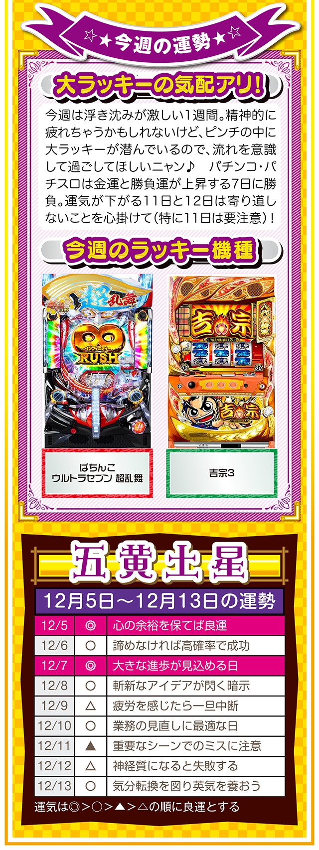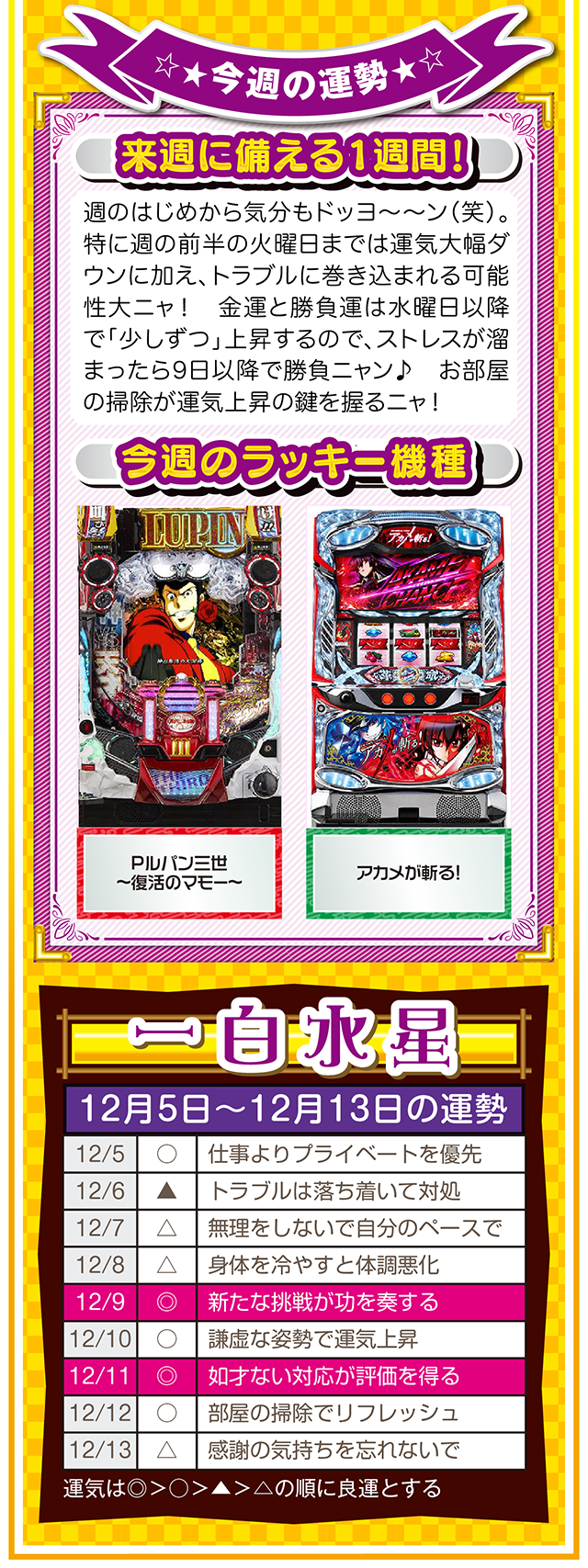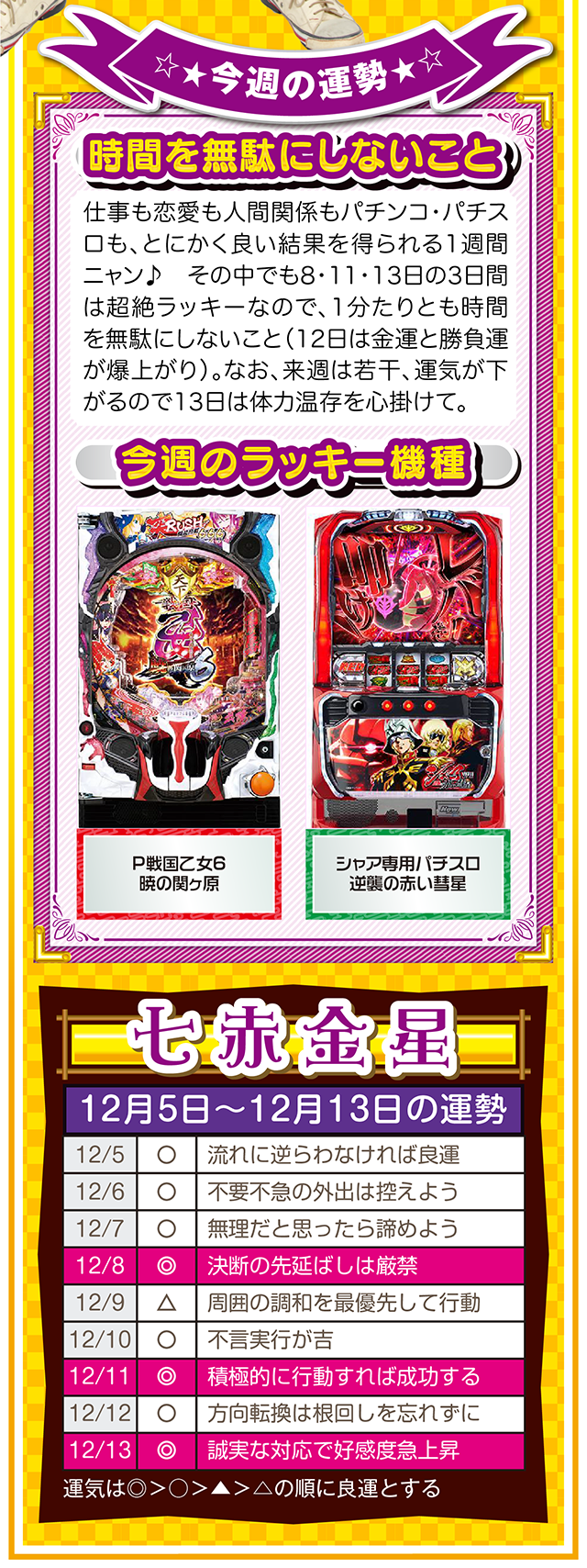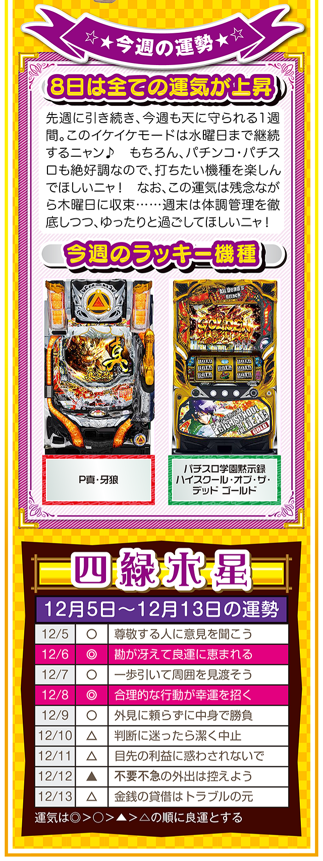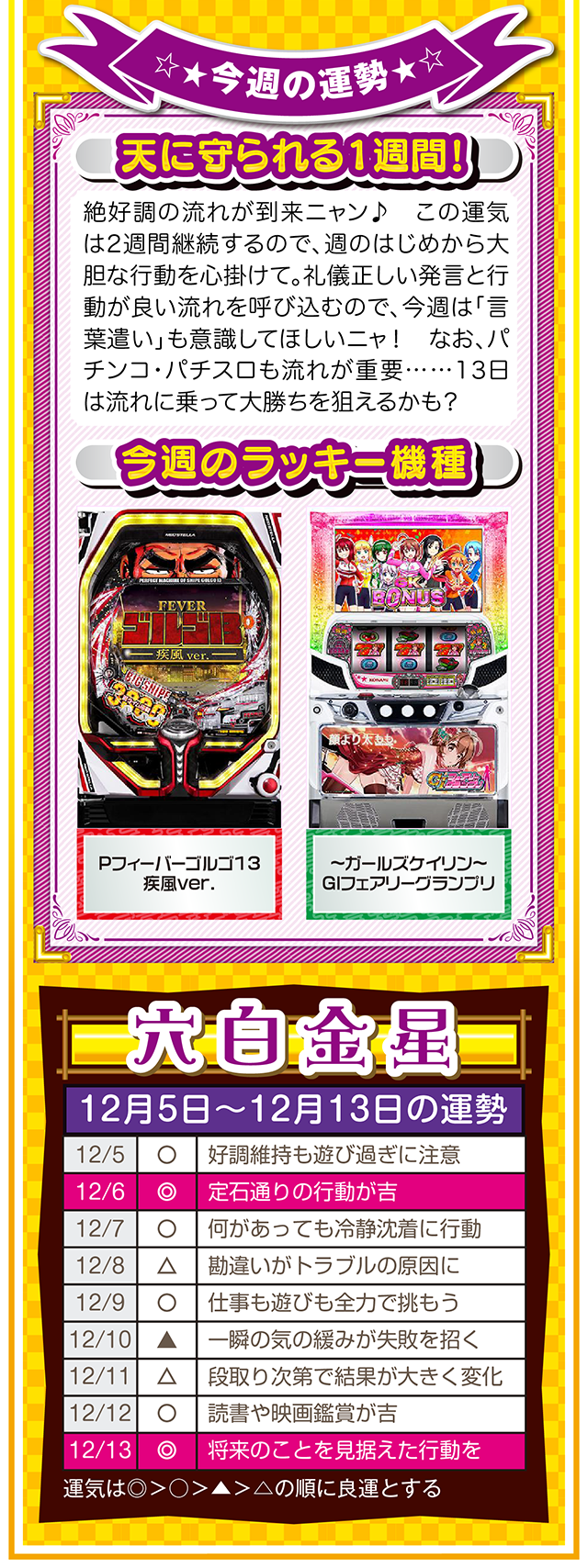 なお、最もパワーがもらえる時間帯は午前9時から11時の2時間。この時間帯に遠方へ行ける方は、自宅を中心として半径50キロ以上の神社を目指すこと(理想は120キロ以上)。仕事が忙しくて遠くへ行けない人は、その方角に向かって「自分の叶えたいこと」をお祈りしてほしいニャン……というわけで早速、12月7日から13日の1週間を鑑定ニャ(大大吉日は日光東照宮を目指すフォー・チュンチュンが、今週もオマケとして5日と6日の運勢も鑑定したニャン♡)!