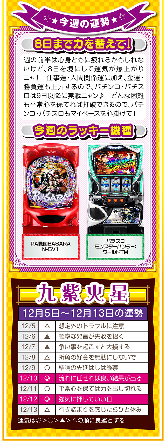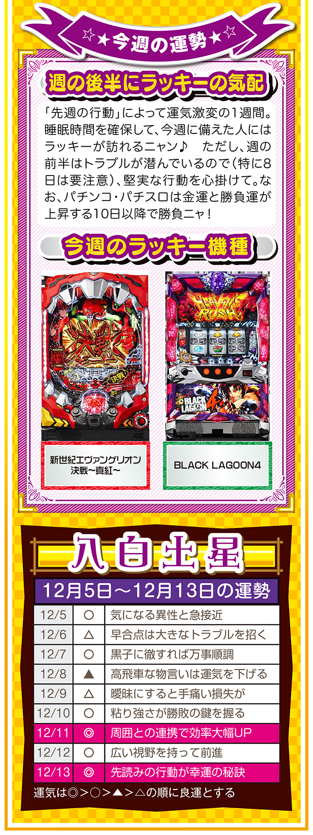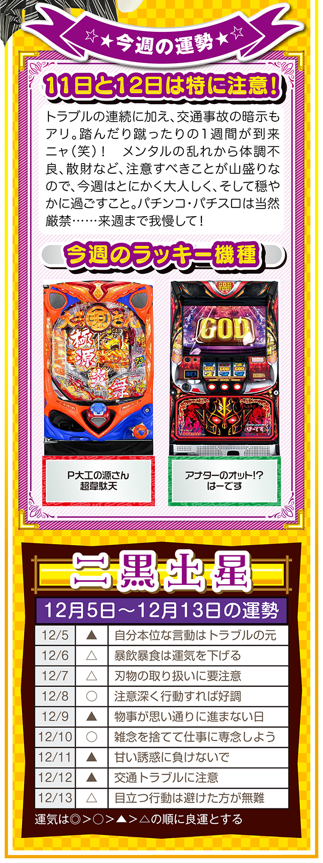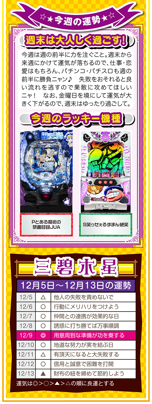 なお、最もパワーがもらえる時間帯は午前9時から11時の2時間。この時間帯に遠方へ行ける方は、自宅を中心として半径50キロ以上の神社を目指すこと(理想は120キロ以上)。仕事が忙しくて遠くへ行けない人は、その方角に向かって「自分の叶えたいこと」をお祈りしてほしいニャン……というわけで早速、12月7日から13日の1週間を鑑定ニャ(大大吉日は日光東照宮を目指すフォー・チュンチュンが、今週もオマケとして5日と6日の運勢も鑑定したニャン♡)!
