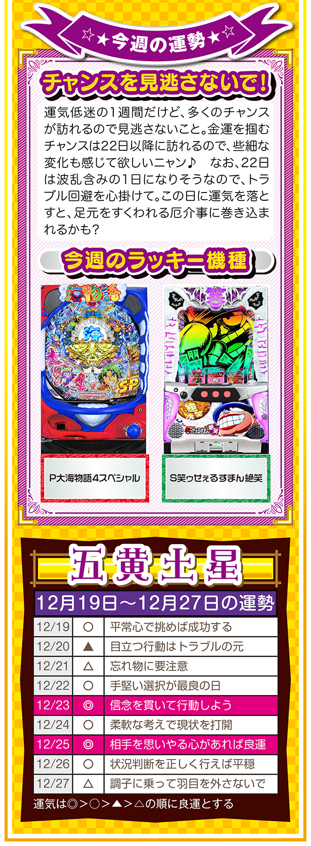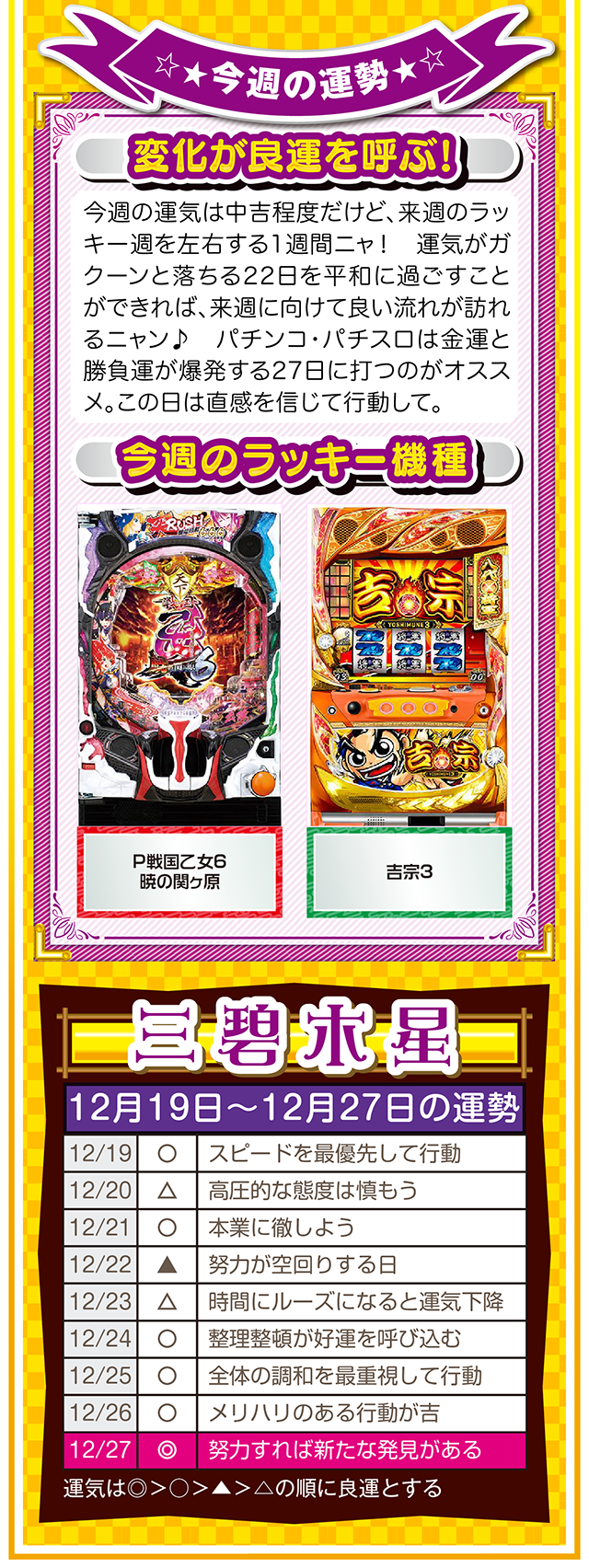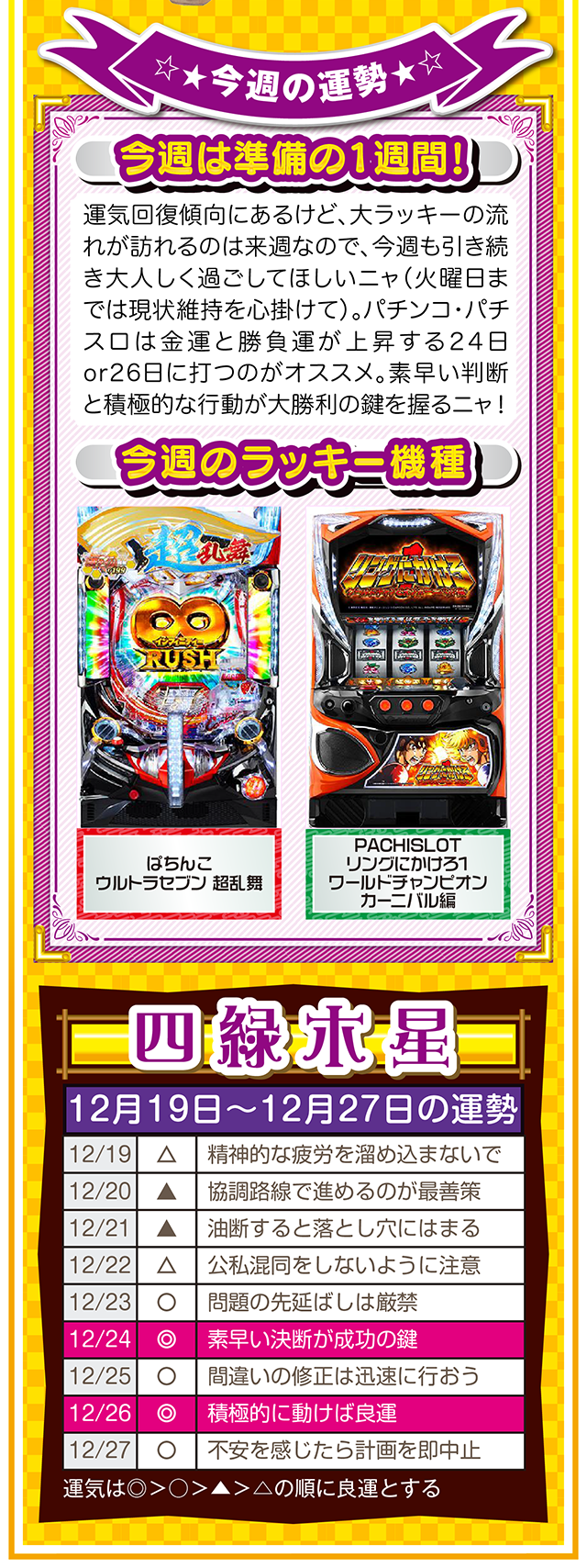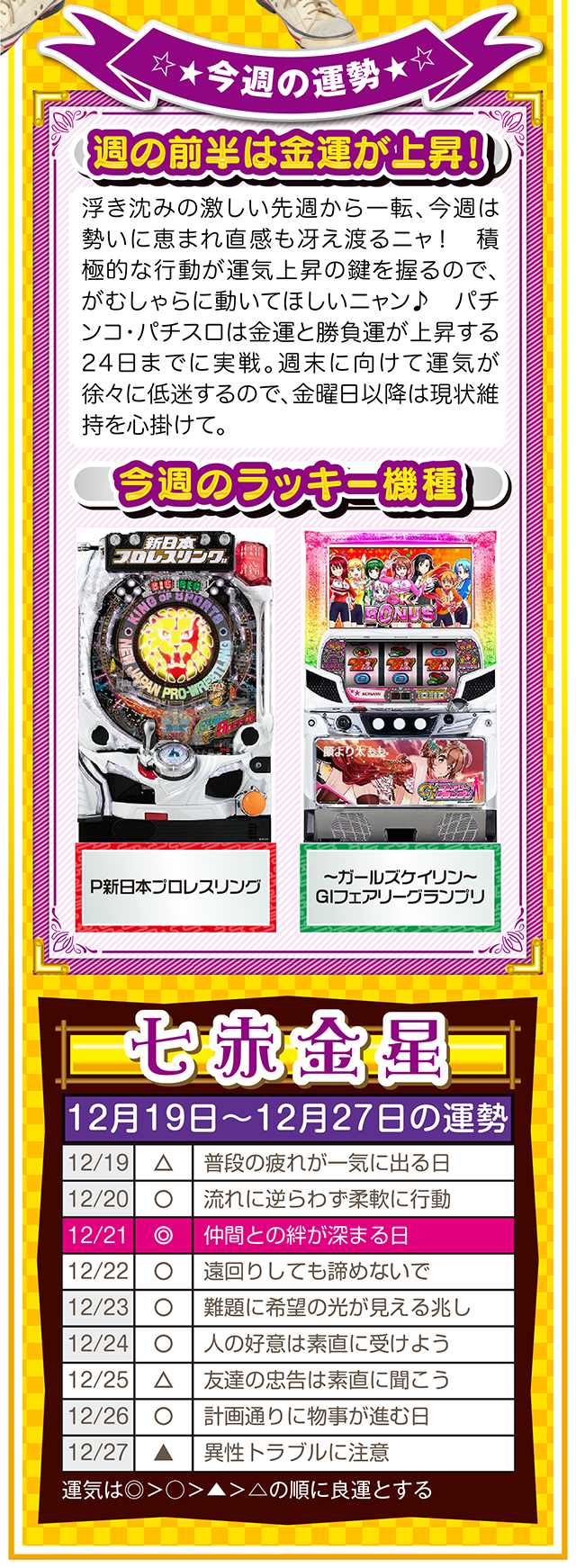 季節はもう年末ニャ! 忙しいかも知れないけどスマホの電話帳を調べて厄落とし。心からの笑顔で良い流れをつかみ、幸せな気持ちで新年を迎えてほしいニャン……というわけで早速、12月21日から27日の1週間を鑑定ニャ(お友達が5人しかいないフォー・チュンチュンが、今週もオマケとして19日と20日の運勢も鑑定したニャン♡)!