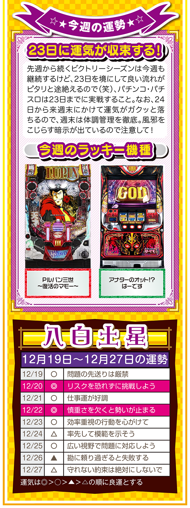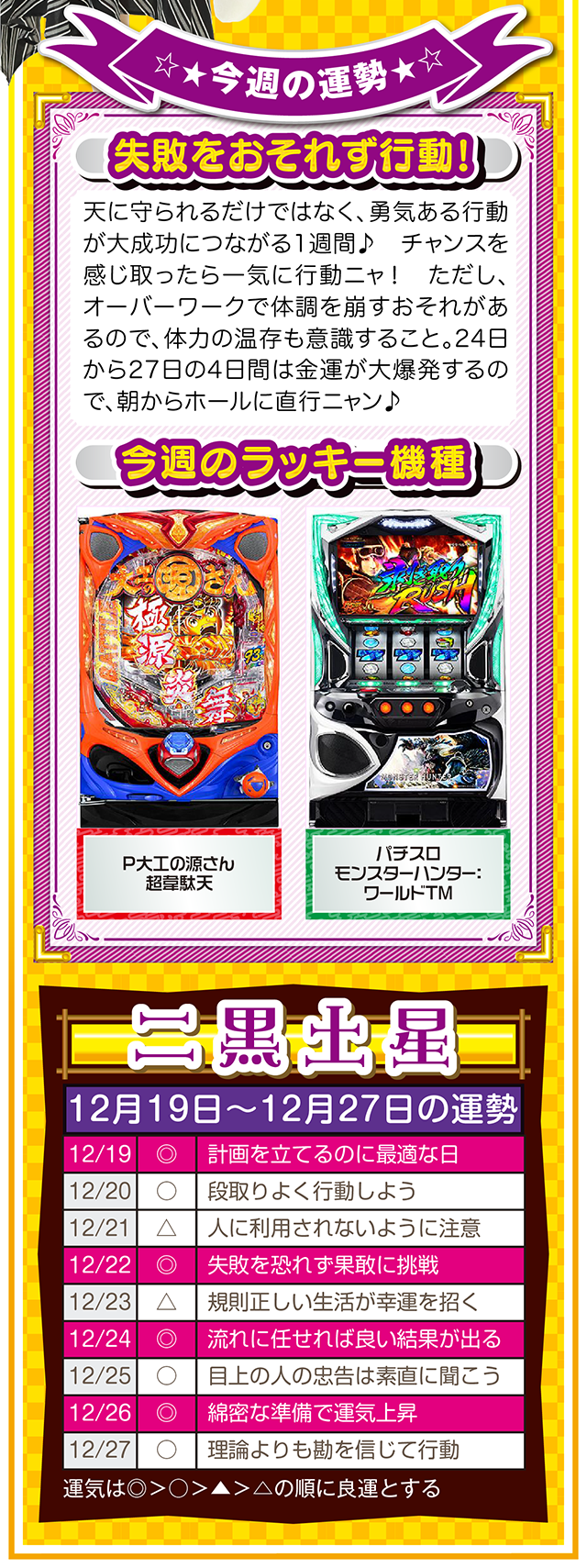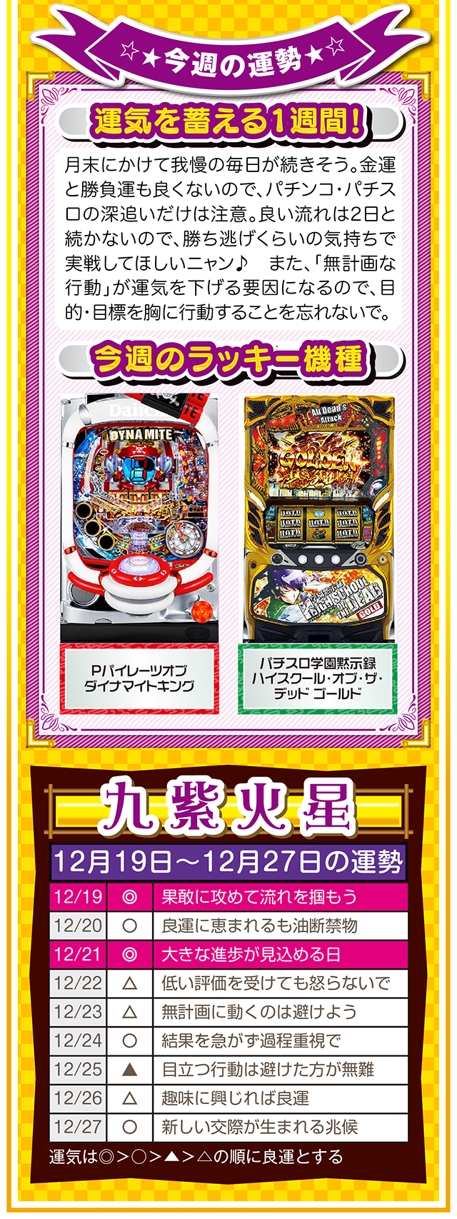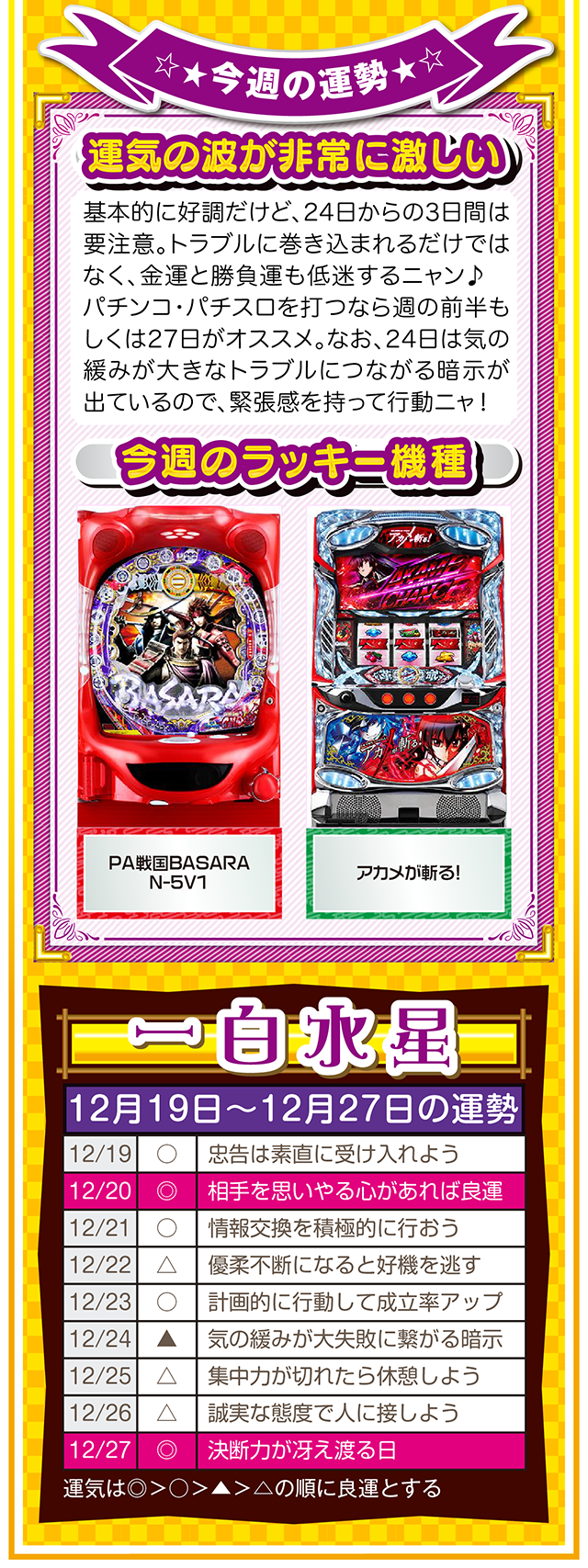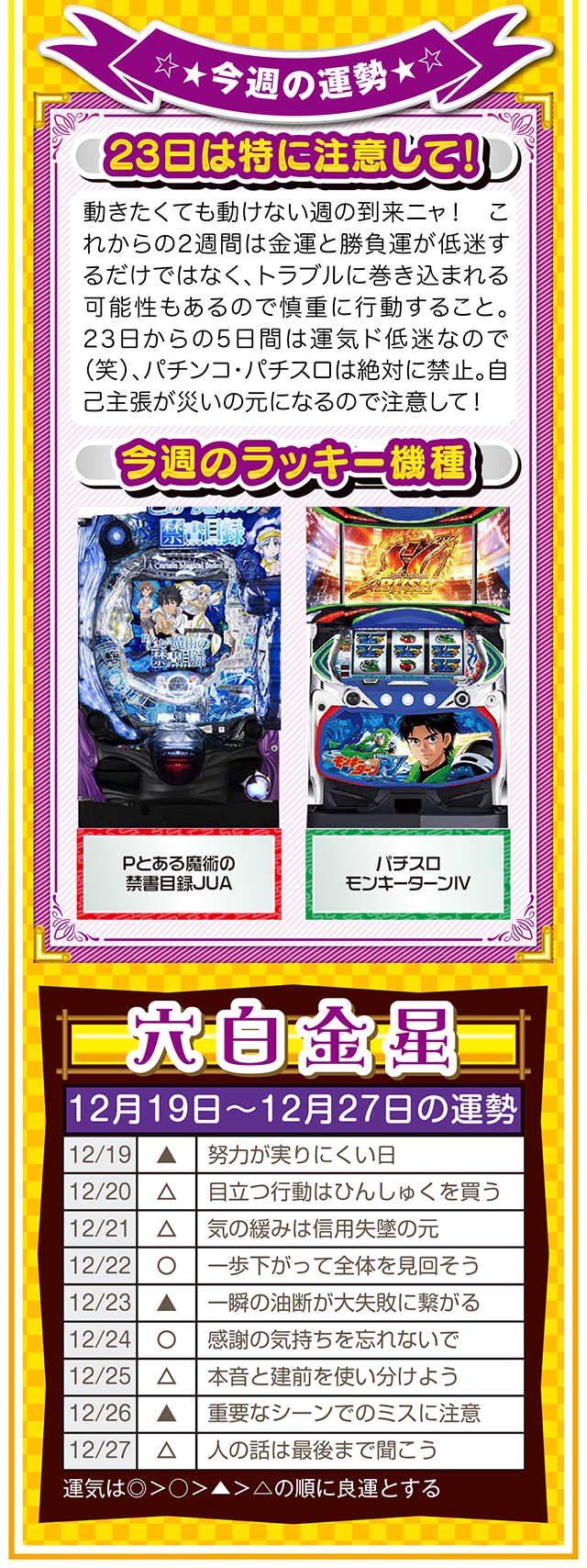 季節はもう年末ニャ! 忙しいかも知れないけどスマホの電話帳を調べて厄落とし。心からの笑顔で良い流れをつかみ、幸せな気持ちで新年を迎えてほしいニャン……というわけで早速、12月21日から27日の1週間を鑑定ニャ(お友達が5人しかいないフォー・チュンチュンが、今週もオマケとして19日と20日の運勢も鑑定したニャン♡)!
