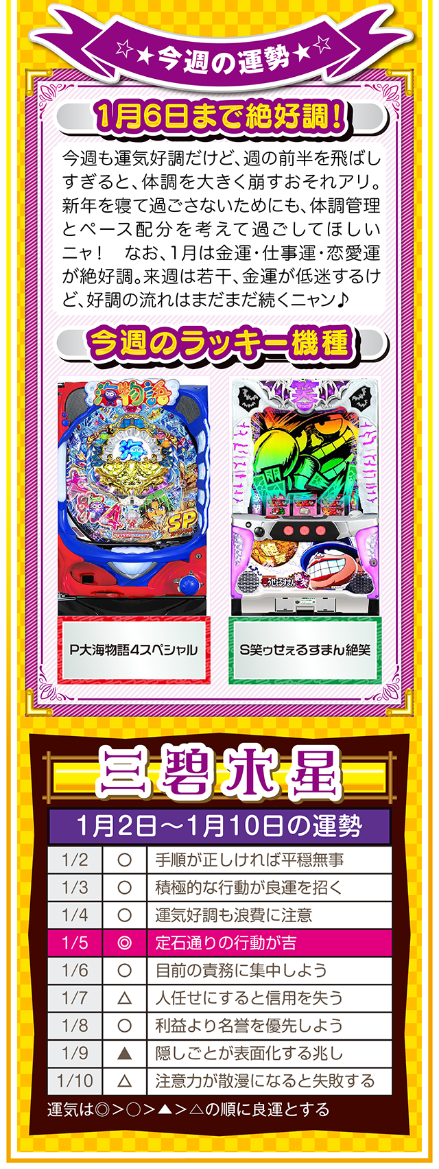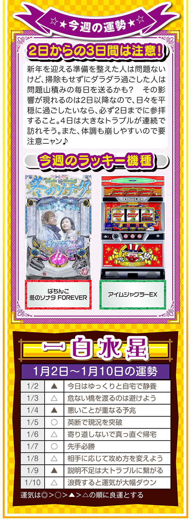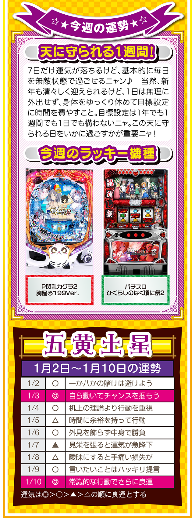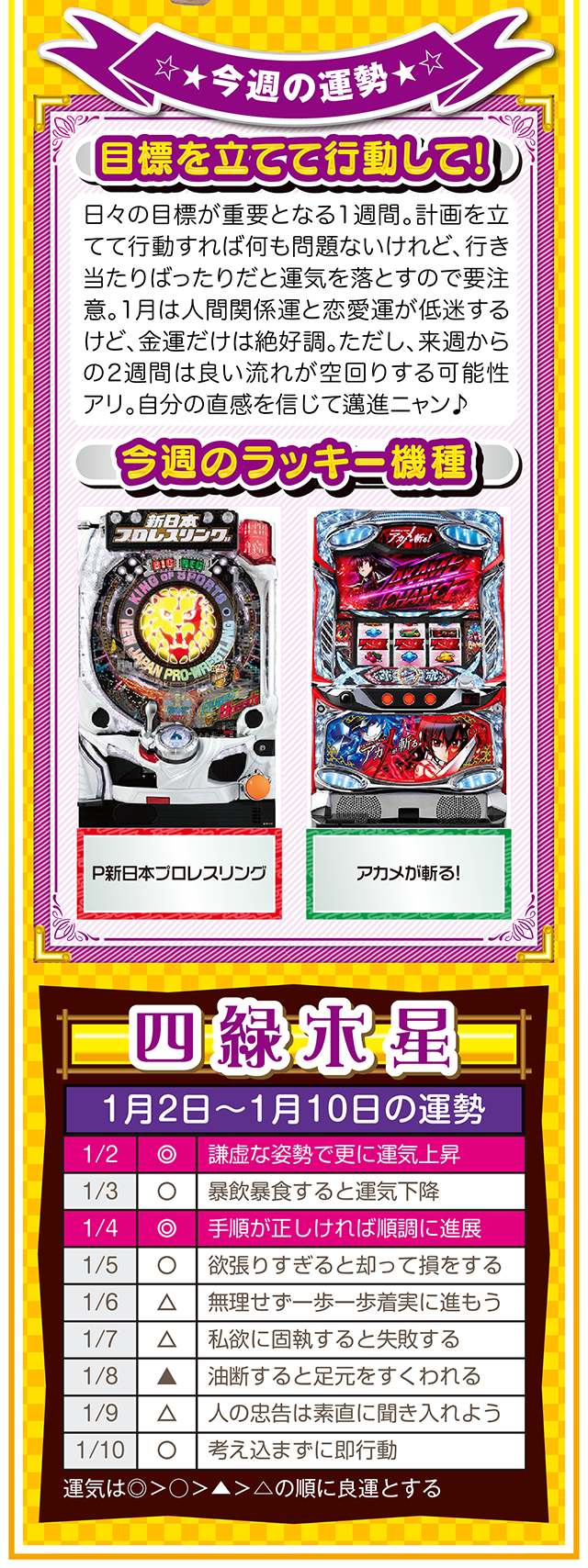 九星気学は動の運命学。令和3年は行動力と直感が「天に守られる秘訣」でもあるので、動きに動きまくって良い流れをつかみ取ってほしいニャン……というわけで早速、1月4日から1月10日の1週間を鑑定ニャ(1月中旬までのスケジュールが真っ白のフォー・チュンチュンが、オマケとして1月2日と3日の運勢も鑑定したニャン♡)!