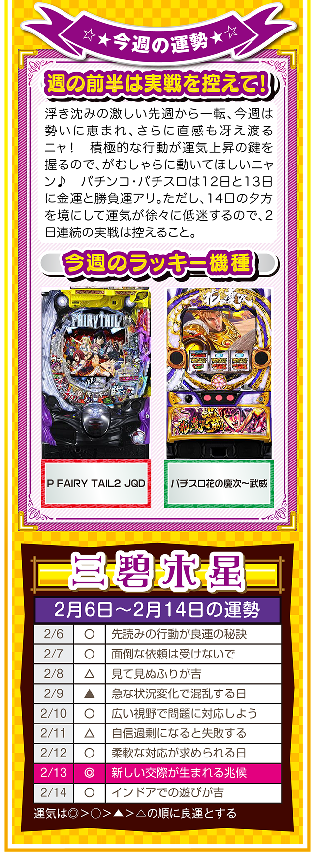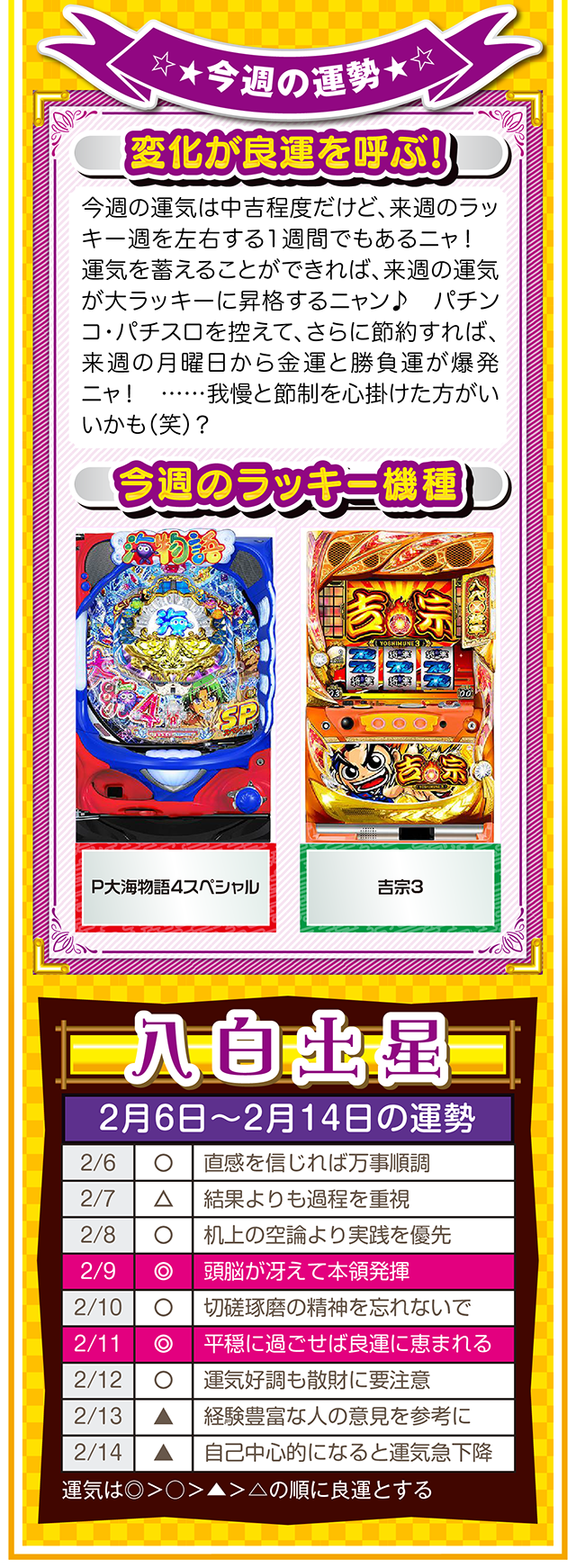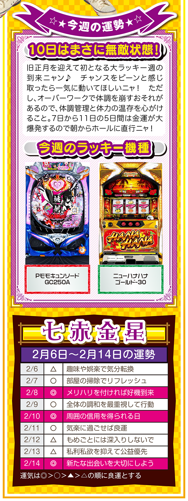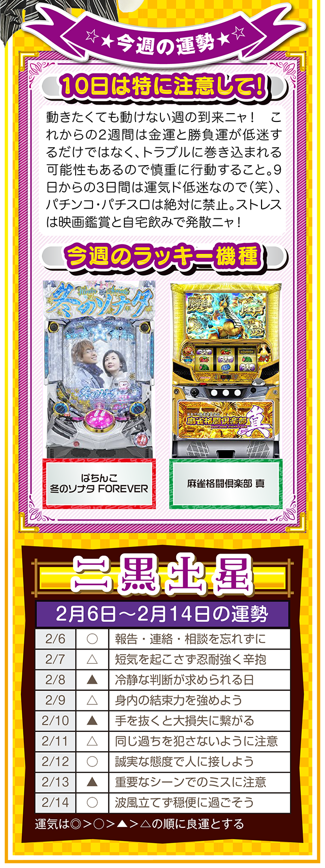 九星気学は動の運命学。行動する、行動しないは個人の自由だけど、お金がかかるわけでもないので(笑)、行動しないよりも行動した方がいい。パチンコで負けて気分が乗らない時こそ、無理矢理にでも身体を動かして、東北と南西方位をお掃除してほしいニャン……というわけで早速、2月8日から14日の1週間を鑑定ニャ(今年のバレンタインも「義理チョコRUSH(本命どころか対抗もナシ)」のフォー・チュンチュンが、オマケとして6日と7日の運勢も鑑定したニャン♡)!