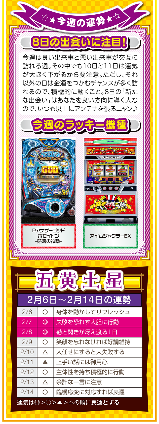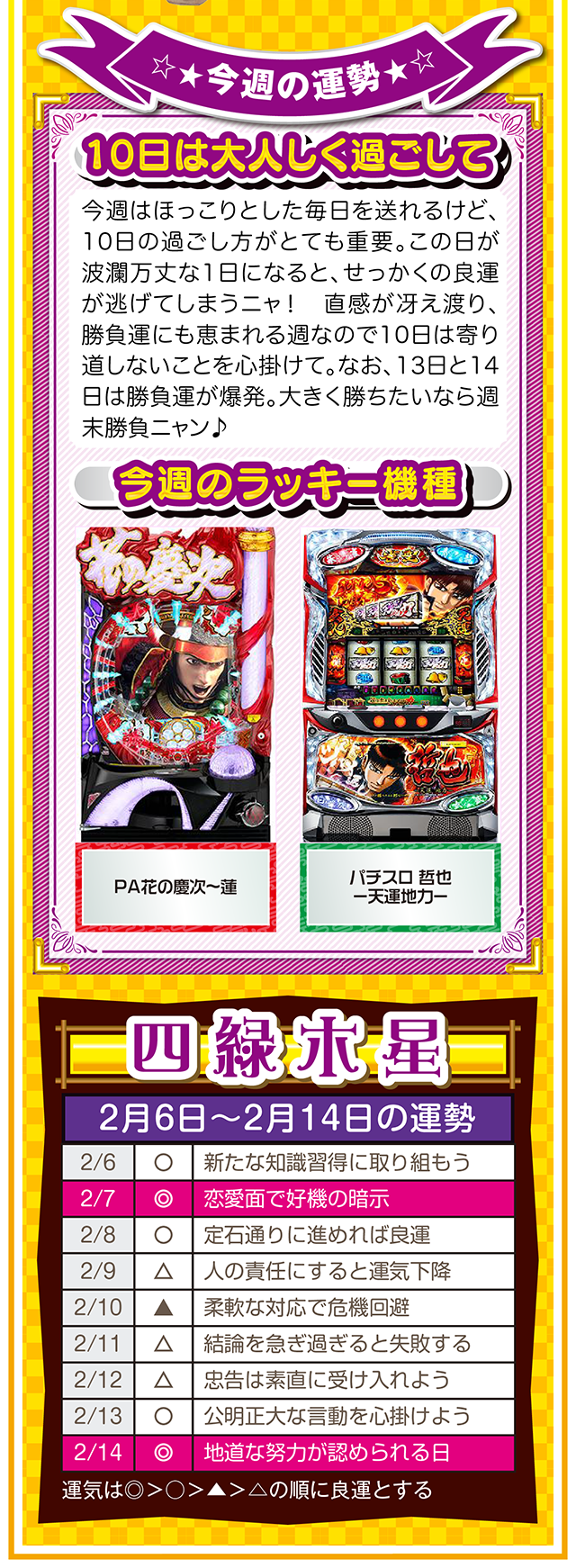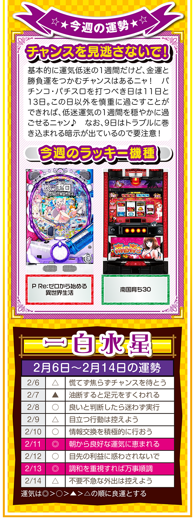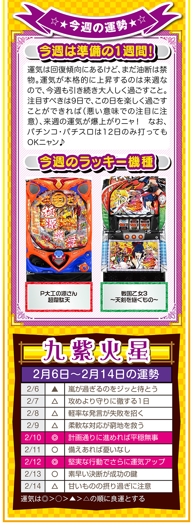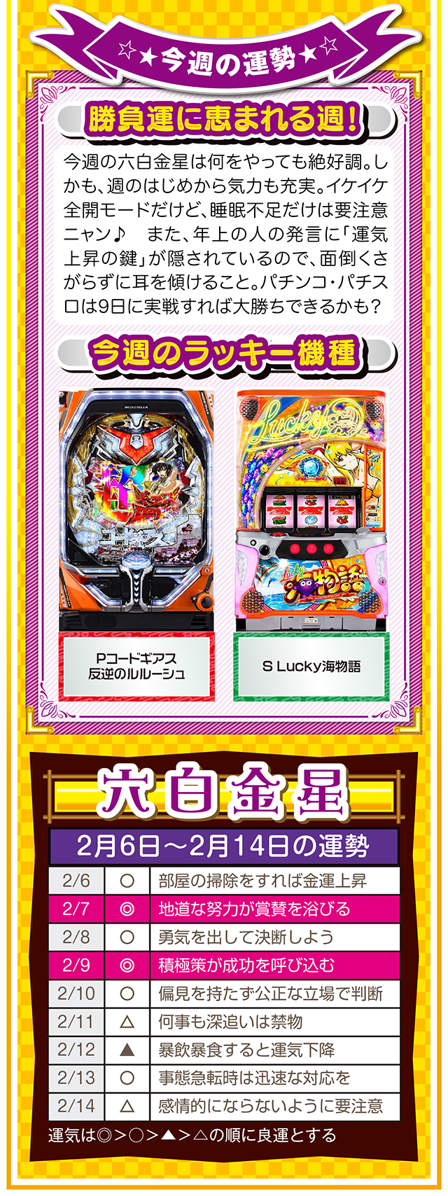 九星気学は動の運命学。行動する、行動しないは個人の自由だけど、お金がかかるわけでもないので(笑)、行動しないよりも行動した方がいい。パチンコで負けて気分が乗らない時こそ、無理矢理にでも身体を動かして、東北と南西方位をお掃除してほしいニャン……というわけで早速、2月8日から14日の1週間を鑑定ニャ(今年のバレンタインも「義理チョコRUSH(本命どころか対抗もナシ)」のフォー・チュンチュンが、オマケとして6日と7日の運勢も鑑定したニャン♡)!