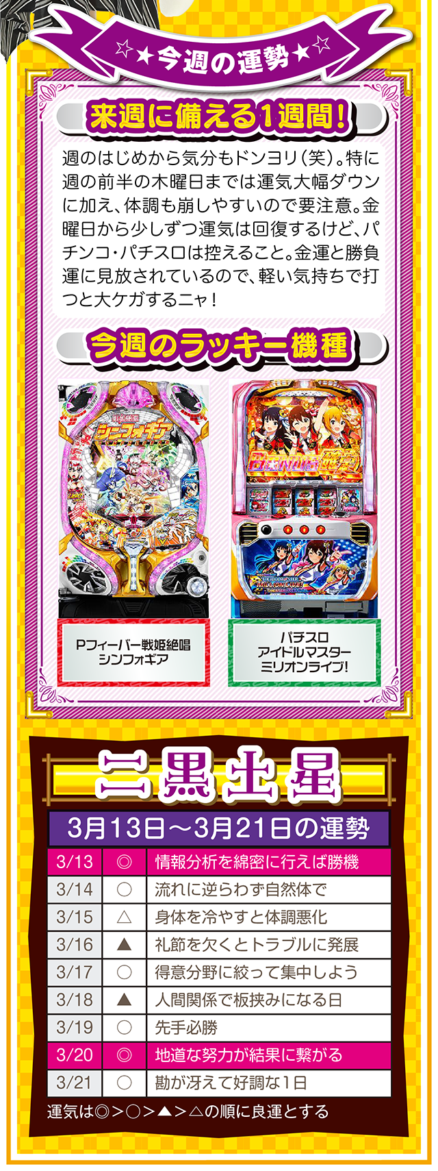 つまらない、そして悲しい人生を送らないためにも、もっと前を、もっと上を見て過ごしてほしいニャン♪ というわけで早速、3月15日から21日の1週間を鑑定ニャ(飲み歩けない現状なのに体重がキッチリ2キロ増のフォー・チュンチュンが、オマケとして3月13日と14日の運勢も鑑定したニャ♡)!