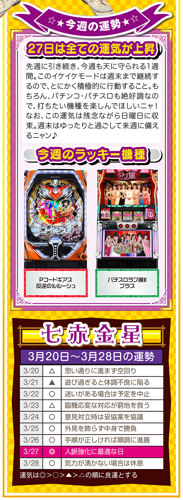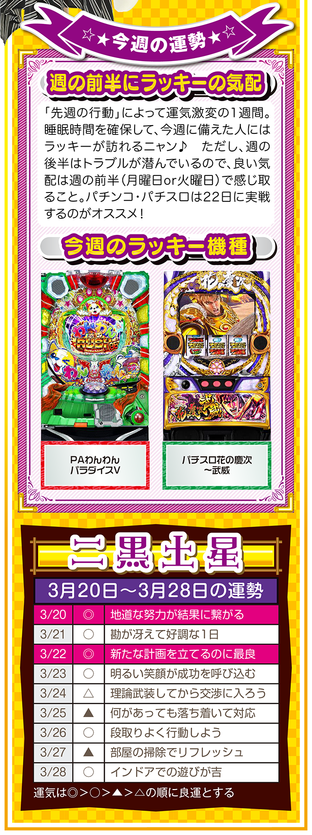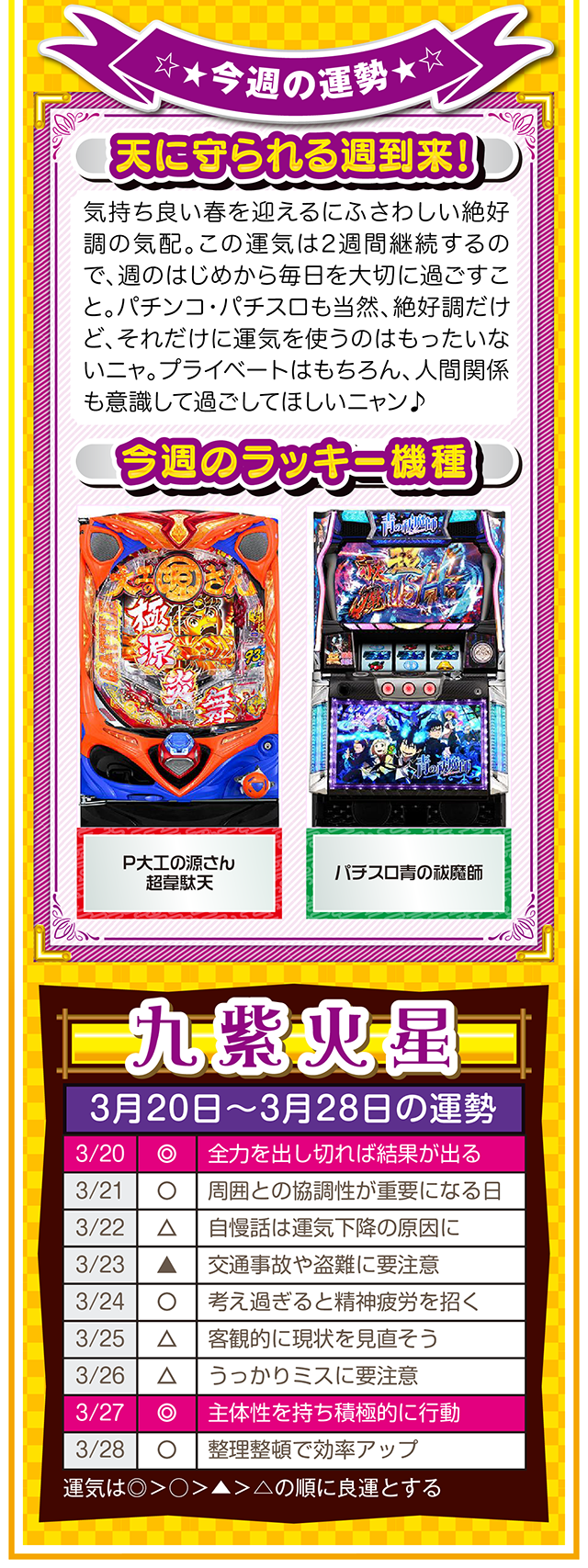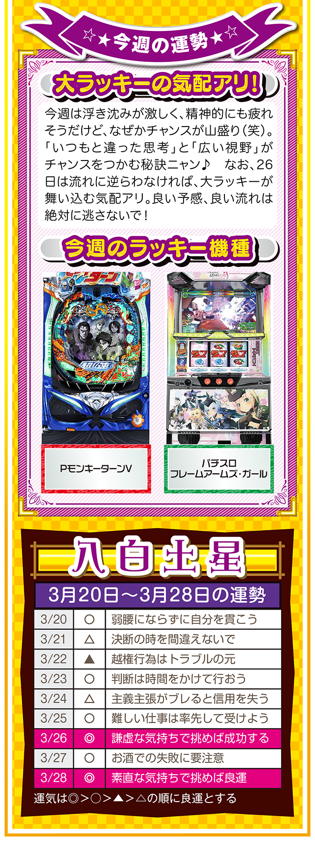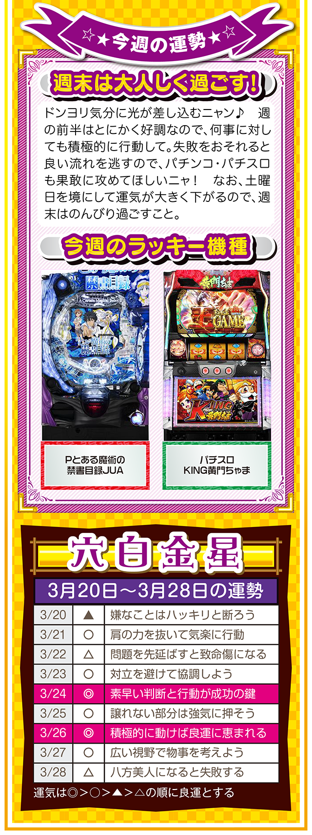もちろん、時間も大切だし、お金も大切だし、自分のプライドも大切。でも、大ラッキーをつかむ人は、失うことをおそれない人。もし、人生をガラリと変えたいなら、「とりあえずやってみる」を思い出して、前へ前へと進んでほしいニャン♪ というわけで早速、3月22日から28日の1週間を鑑定ニャ(自粛要請が空けたら婚活に前のめりのフォー・チュンチュンが、オマケとして3月20日と21日の運勢も鑑定したニャ♡)!