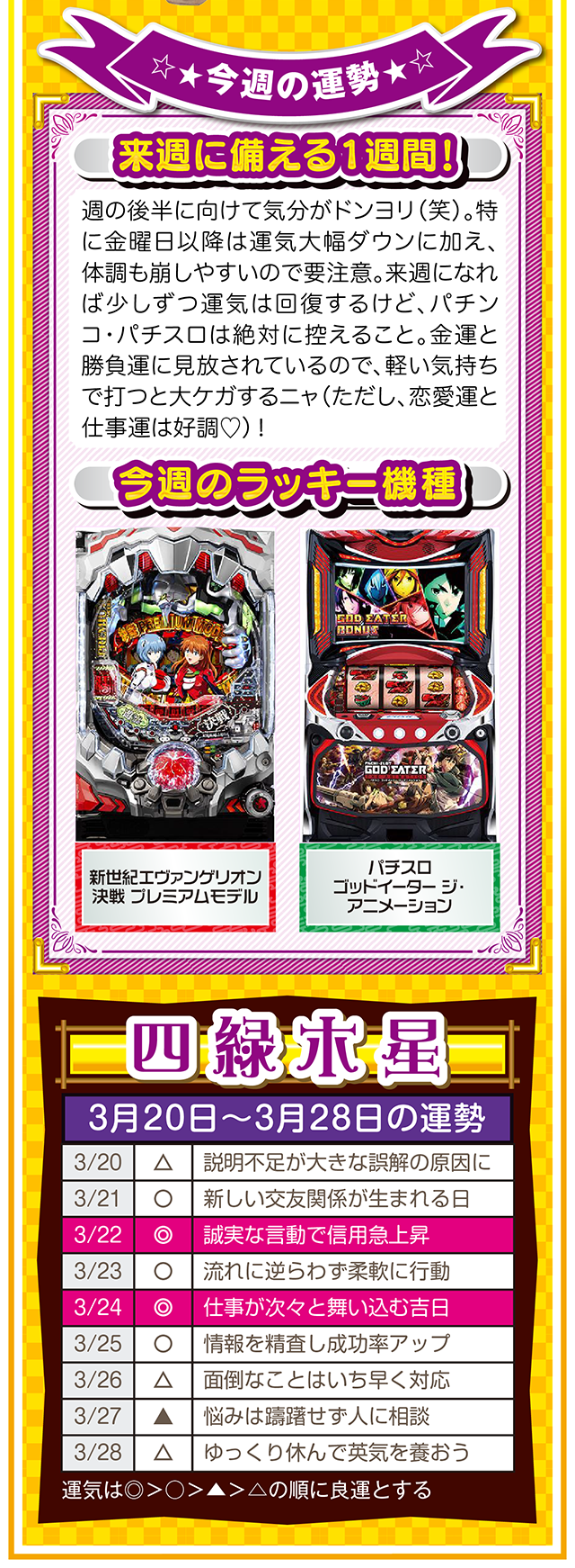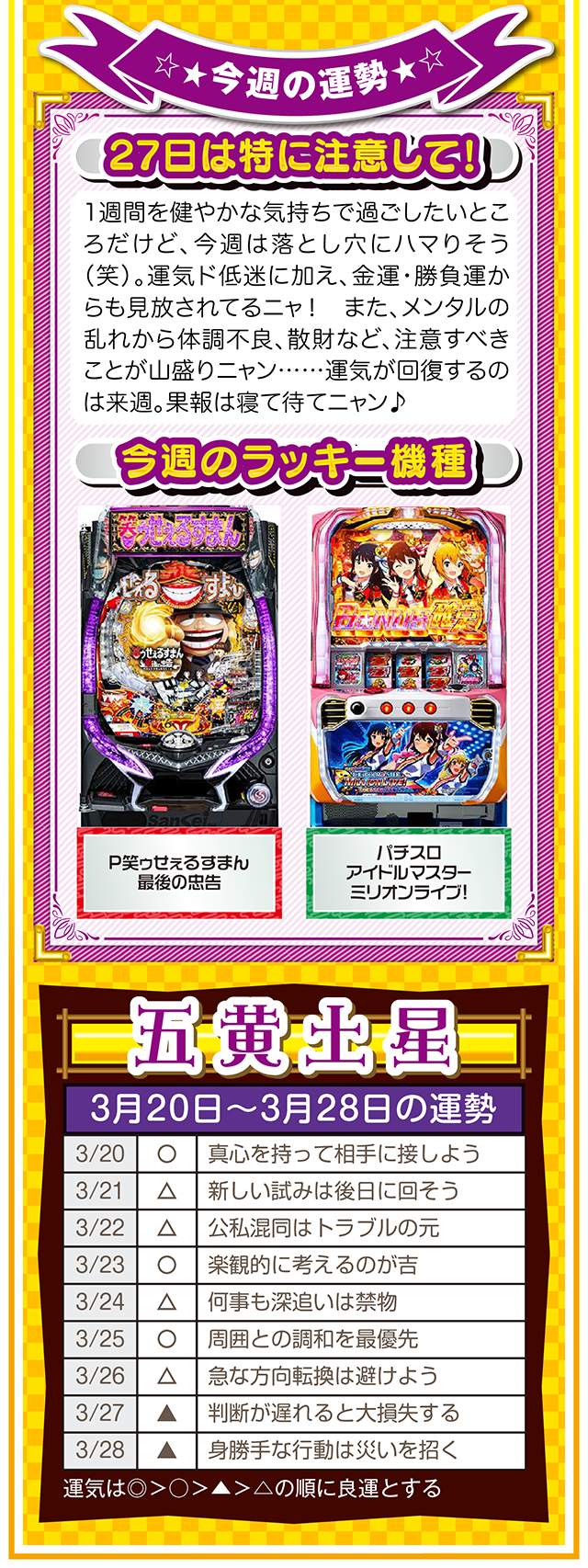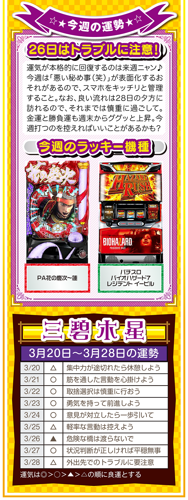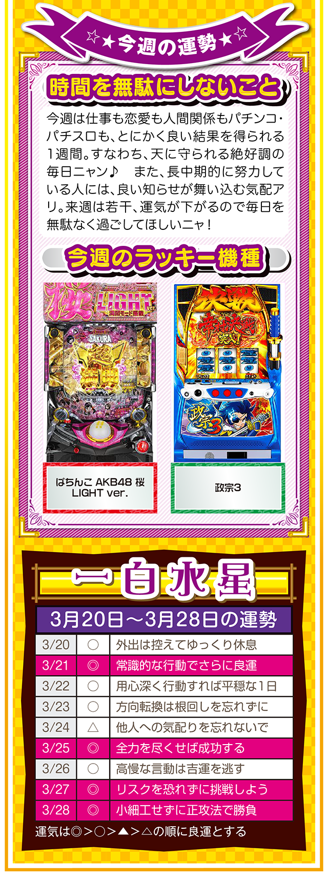 もちろん、時間も大切だし、お金も大切だし、自分のプライドも大切。でも、大ラッキーをつかむ人は、失うことをおそれない人。もし、人生をガラリと変えたいなら、「とりあえずやってみる」を思い出して、前へ前へと進んでほしいニャン♪ というわけで早速、3月22日から28日の1週間を鑑定ニャ(自粛要請が空けたら婚活に前のめりのフォー・チュンチュンが、オマケとして3月20日と21日の運勢も鑑定したニャ♡)!