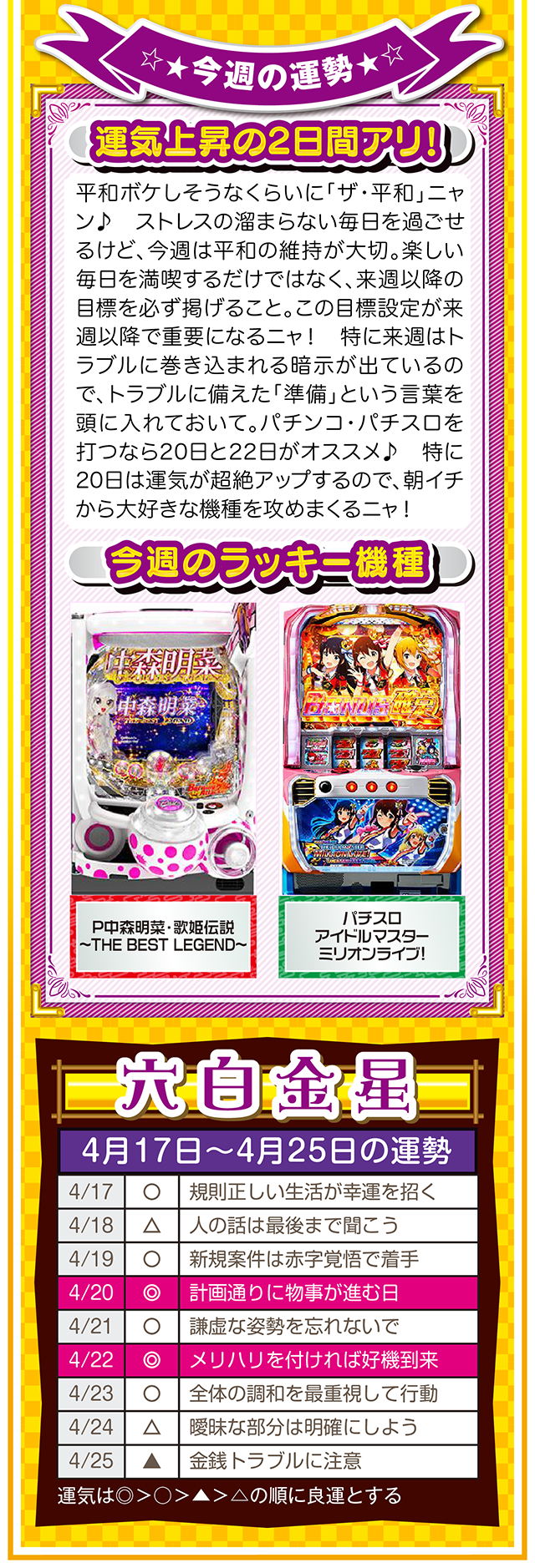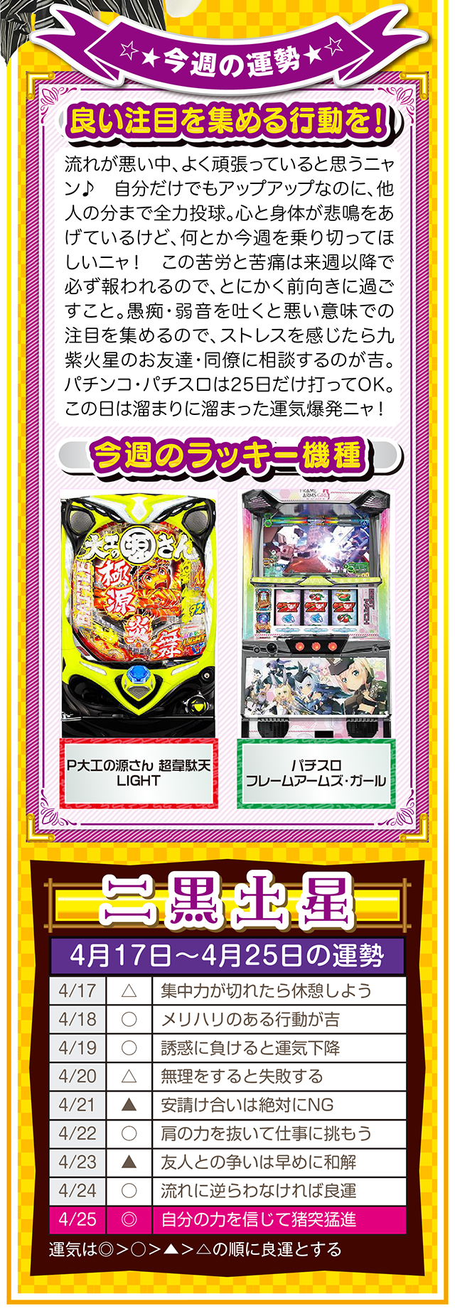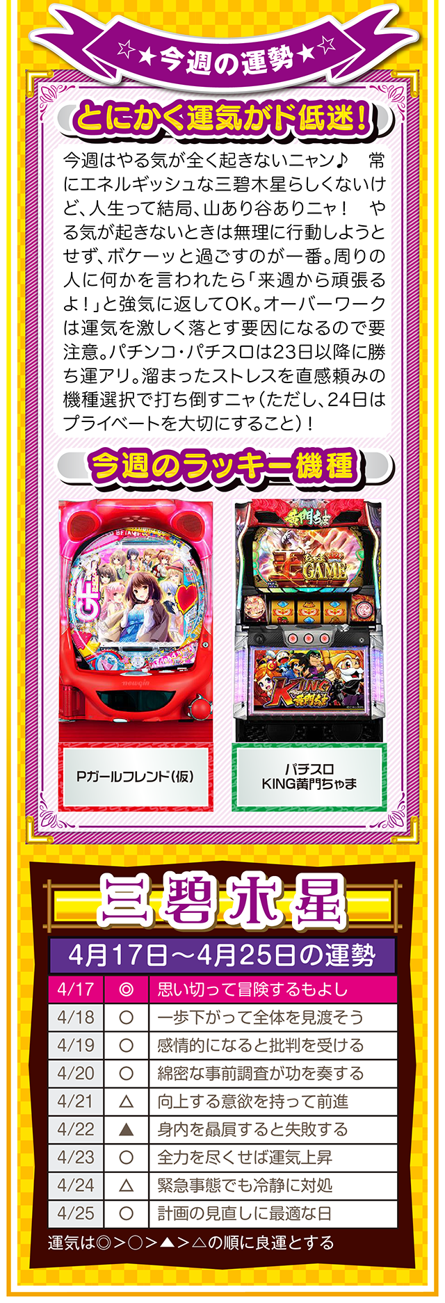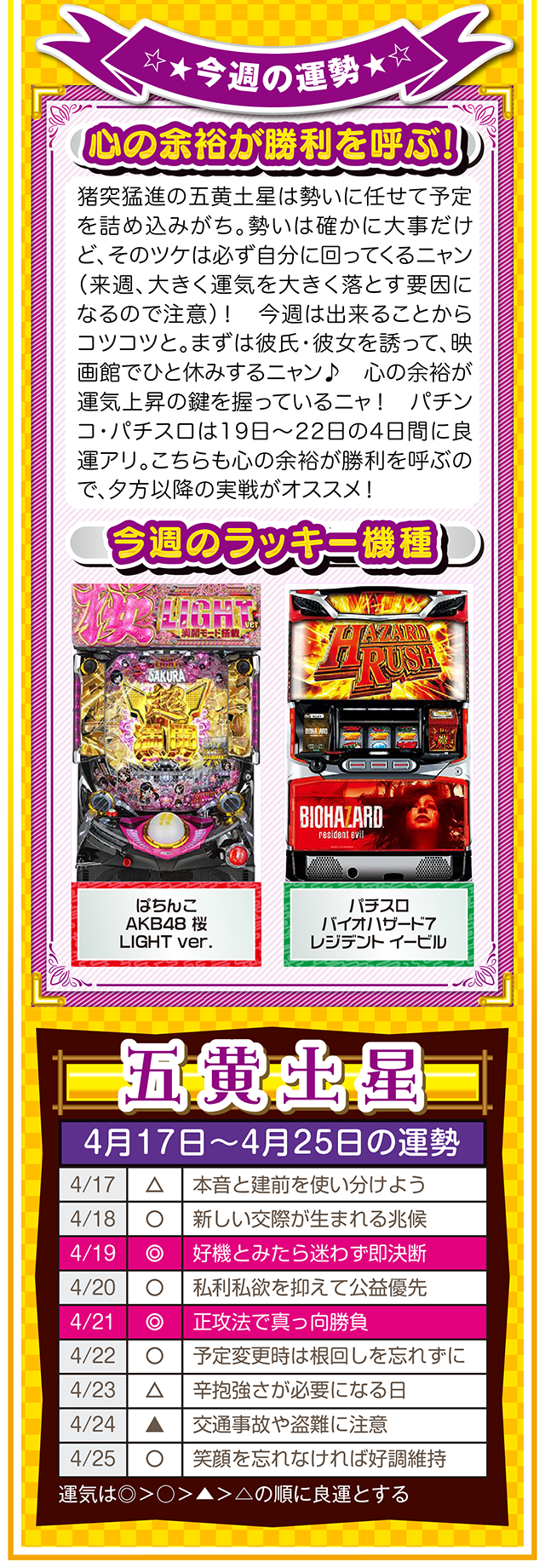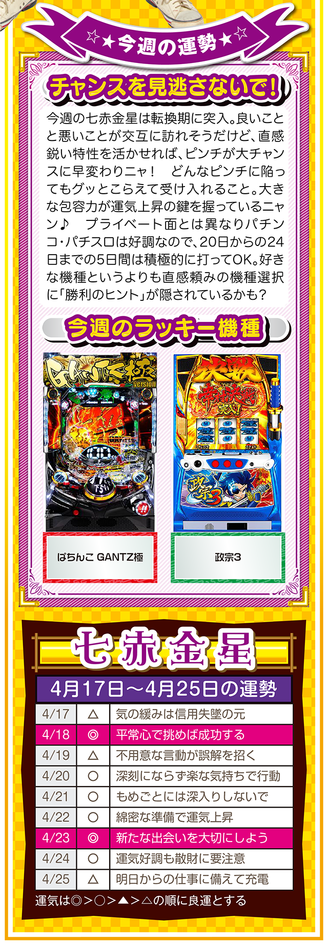 もし、ツキとか流れ、そして運を味方に付けたいのなら、思い切って自分のために生きるのを辞めてみて。この大胆な思考と行動が、人生を豊かにしてくれるはずニャ! というわけで早速、4月19日から25日の1週間を鑑定ニャ(この原稿を書いた後に、なぜか献血センターに向かったフォー・チュンチュンが、オマケとして4月17日と18日の運勢も鑑定したニャン♡)!