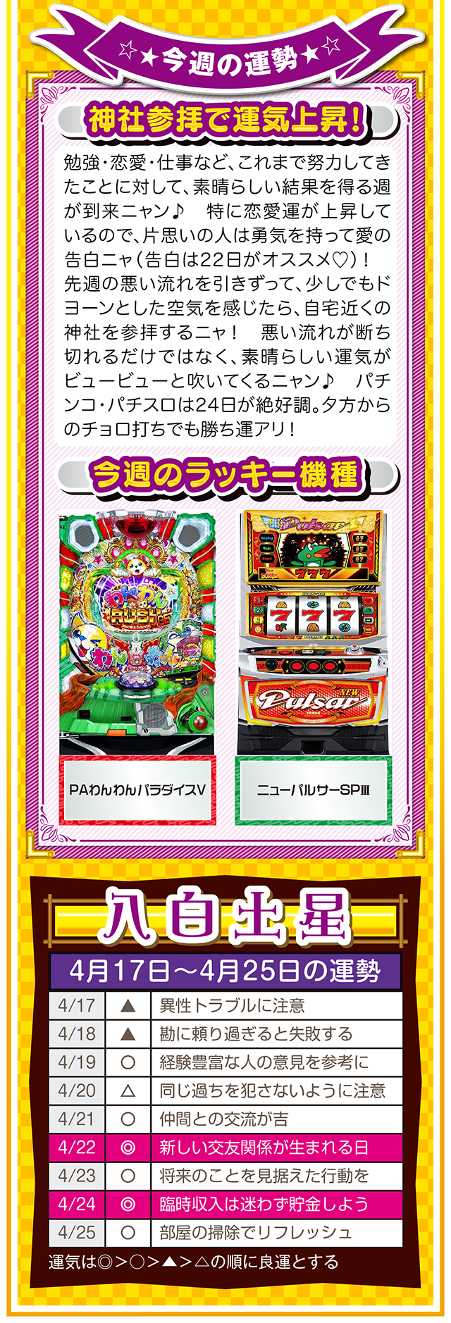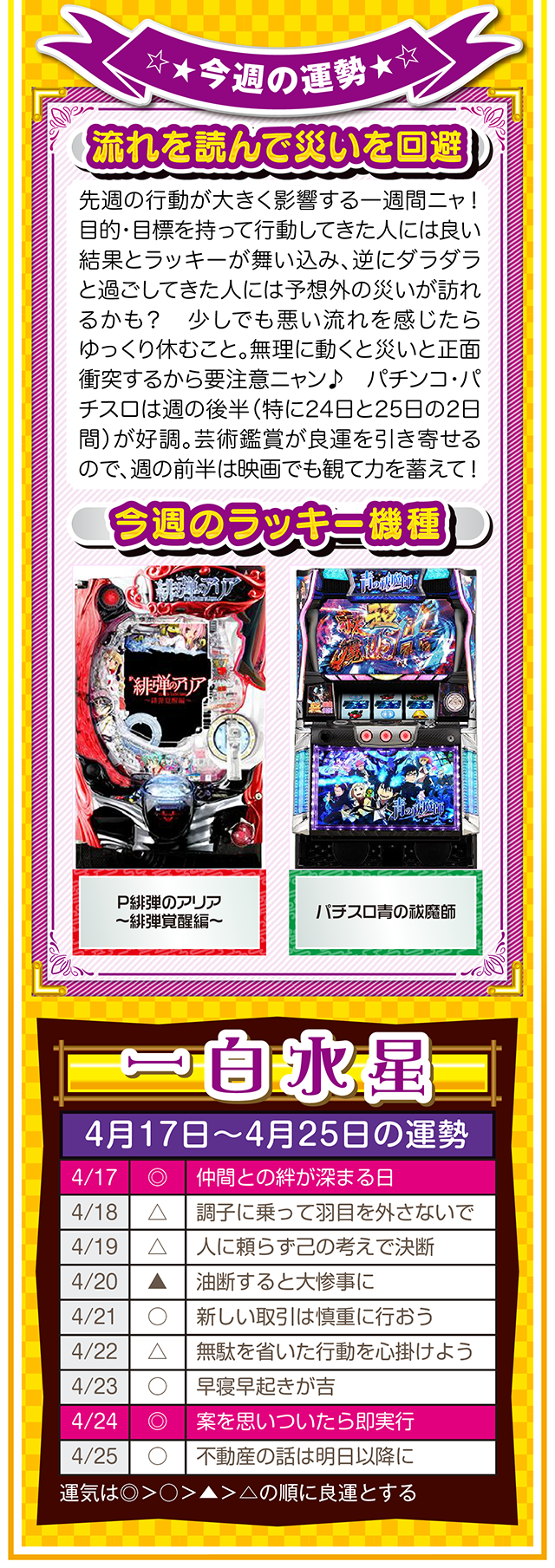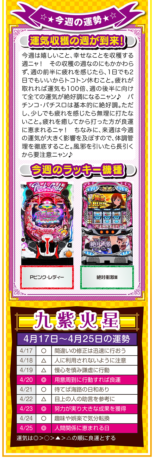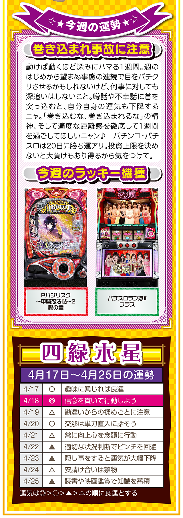 もし、ツキとか流れ、そして運を味方に付けたいのなら、思い切って自分のために生きるのを辞めてみて。この大胆な思考と行動が、人生を豊かにしてくれるはずニャ! というわけで早速、4月19日から25日の1週間を鑑定ニャ(この原稿を書いた後に、なぜか献血センターに向かったフォー・チュンチュンが、オマケとして4月17日と18日の運勢も鑑定したニャン♡)!