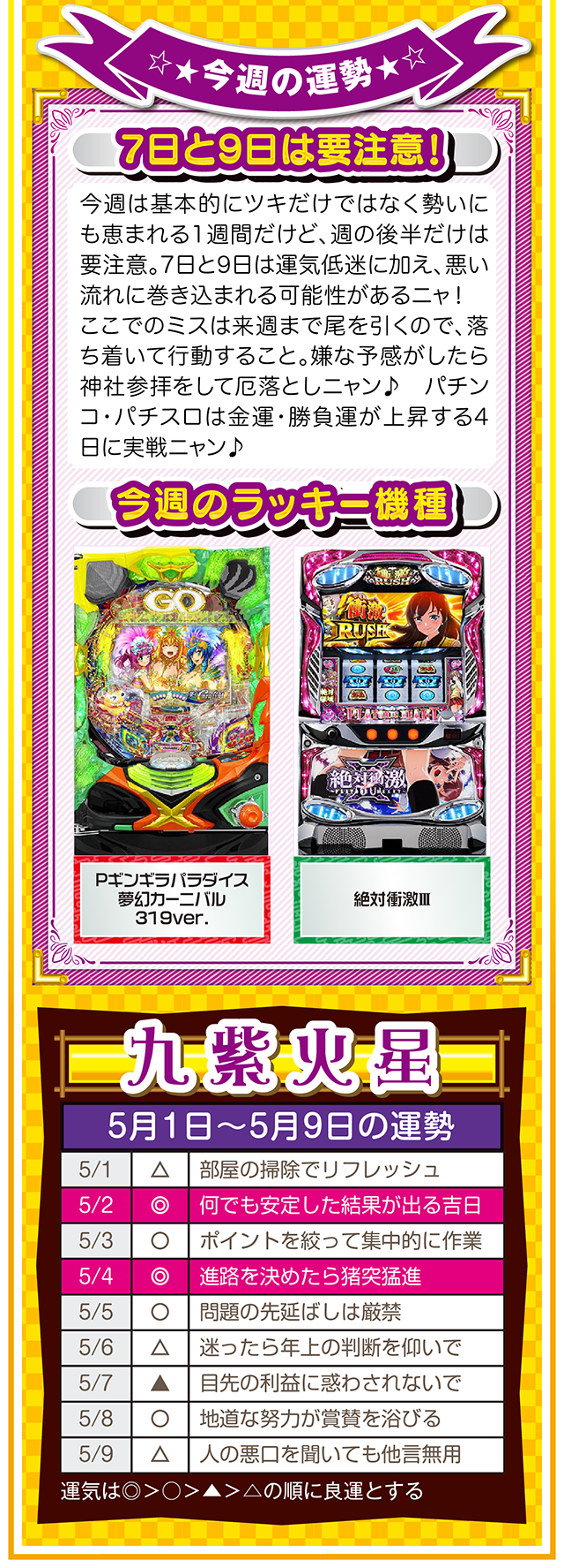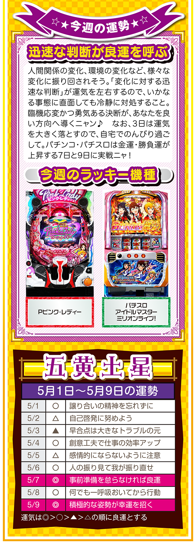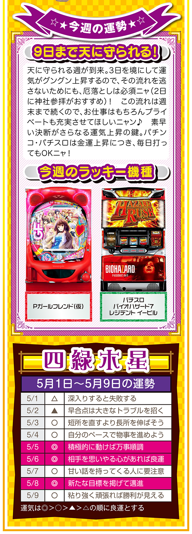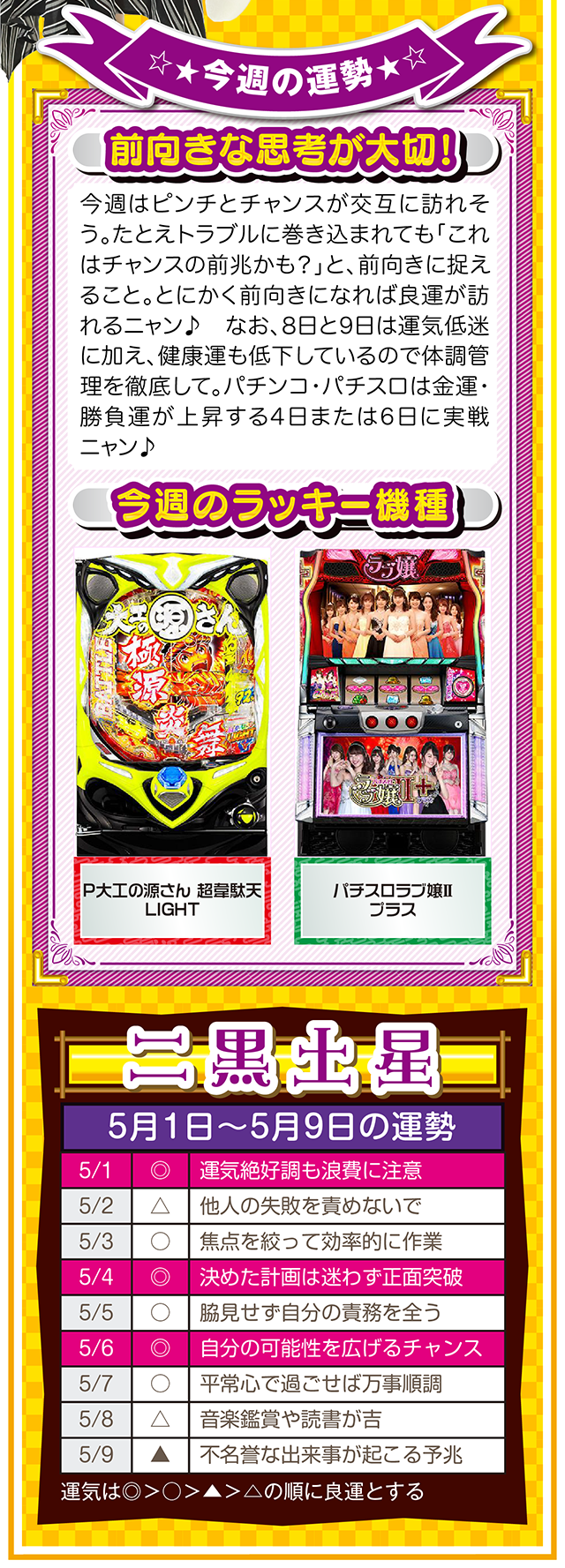 ネガティブ発言を繰り返す人と、距離を置く勇気。この一歩を踏み出すか否かで、流れがガラリと変わることを覚えておいてほしいニャン♪ というわけで早速、5月3日から9日の1週間を鑑定ニャ(異性にフラれても泣きながらポジティブ発言を繰り返すフォー・チュンチュンが、オマケとして5月1日と2日の運勢も鑑定したニャン♡)!