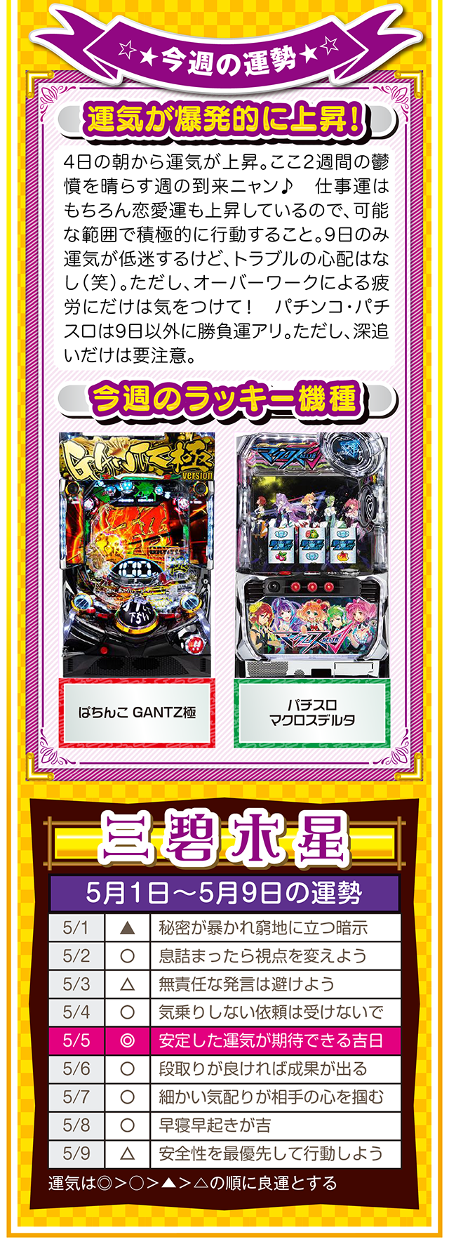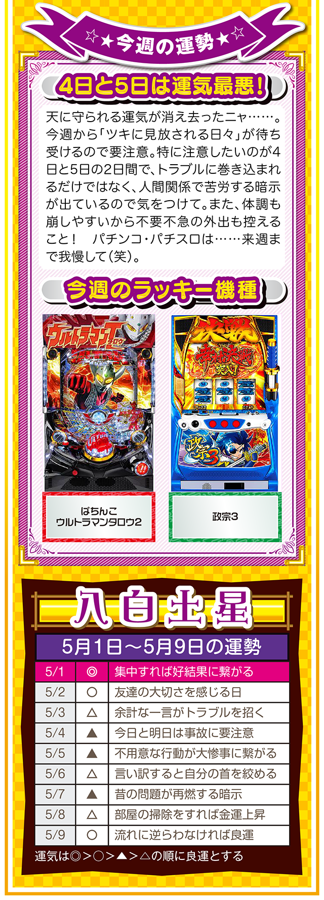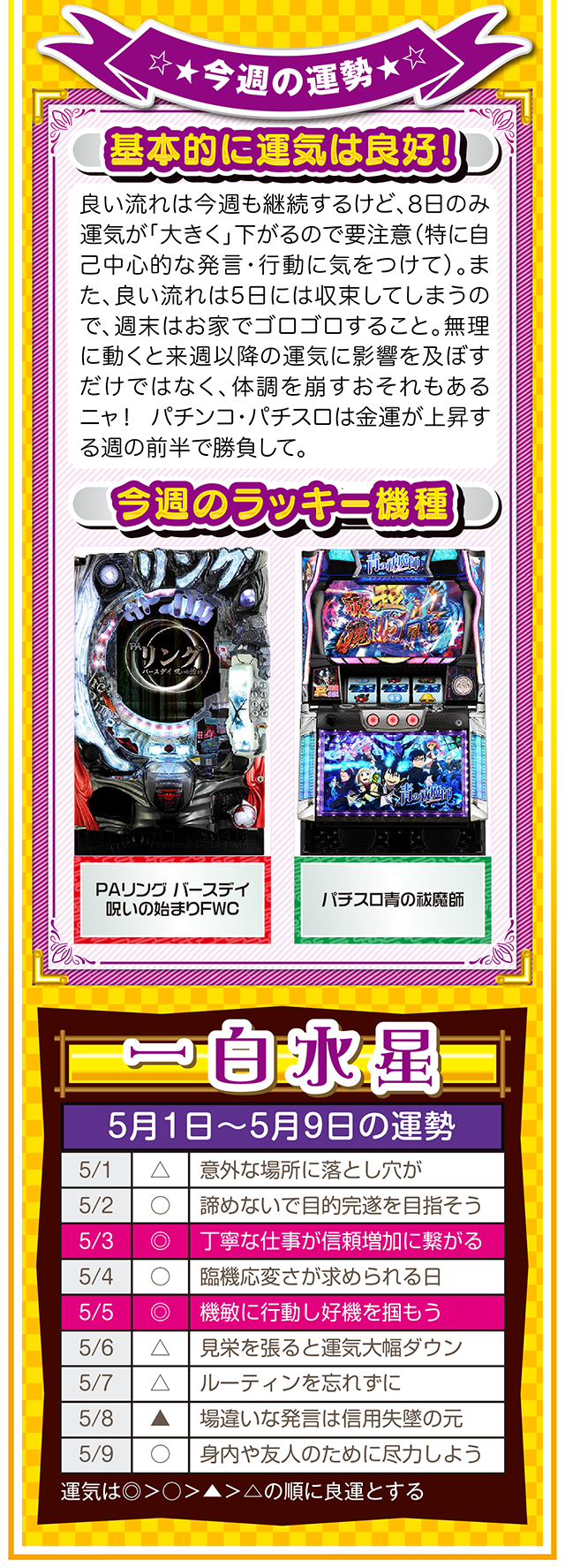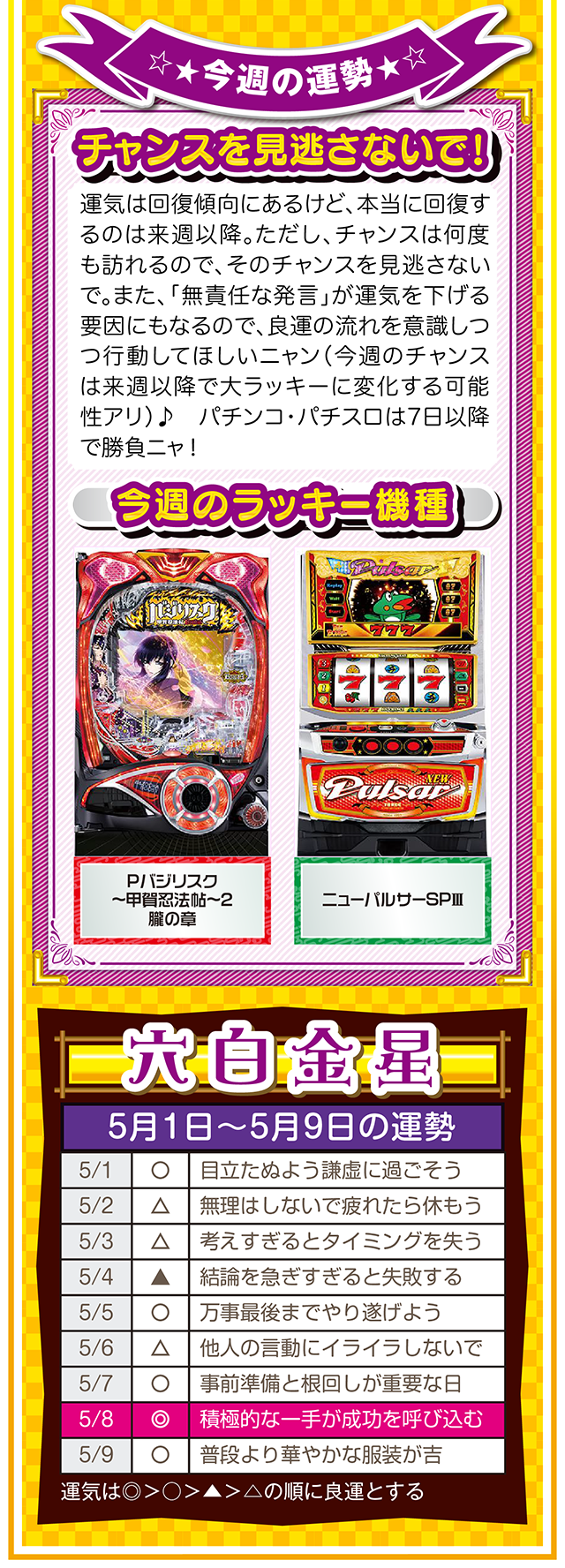 ネガティブ発言を繰り返す人と、距離を置く勇気。この一歩を踏み出すか否かで、流れがガラリと変わることを覚えておいてほしいニャン♪ というわけで早速、5月3日から9日の1週間を鑑定ニャ(異性にフラれても泣きながらポジティブ発言を繰り返すフォー・チュンチュンが、オマケとして5月1日と2日の運勢も鑑定したニャン♡)!