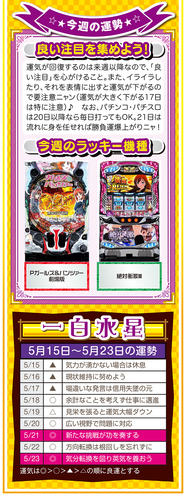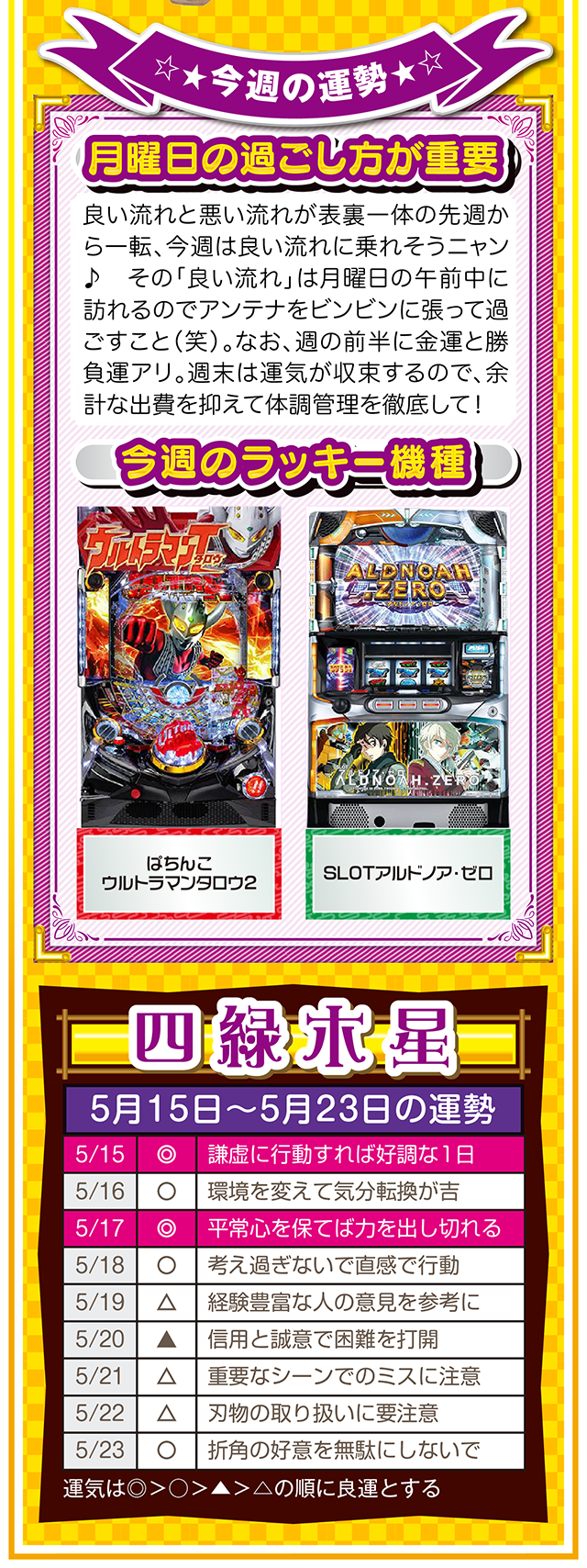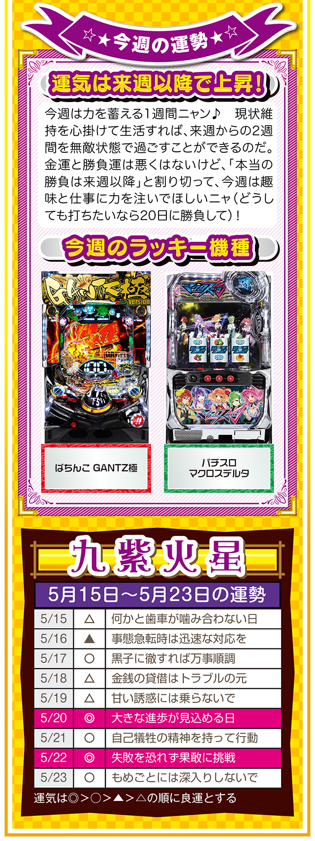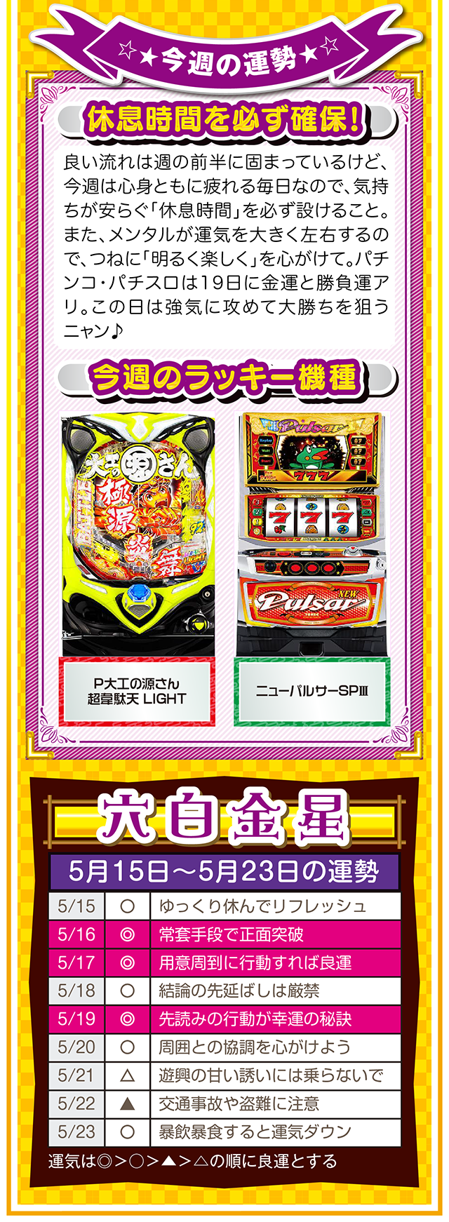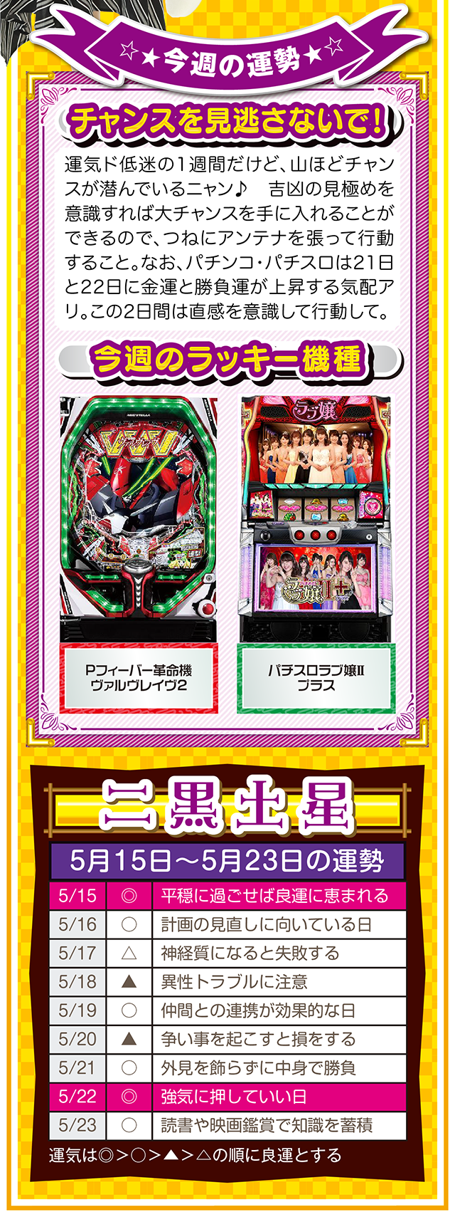 開運は「運を開く」ことであり、「心を開く」ことでもある。「なぜ?」とか「何で?」は時として大切だけど、良運をつかみたいのなら「素直が一番」ということを覚えておいてほしいニャン♪ というわけで早速、5月17日から23日の1週間を鑑定ニャ(私生活は理屈っぽさ全開のフォー・チュンチュンが、オマケとして5月15日と16日の運勢も鑑定したニャン♡)!