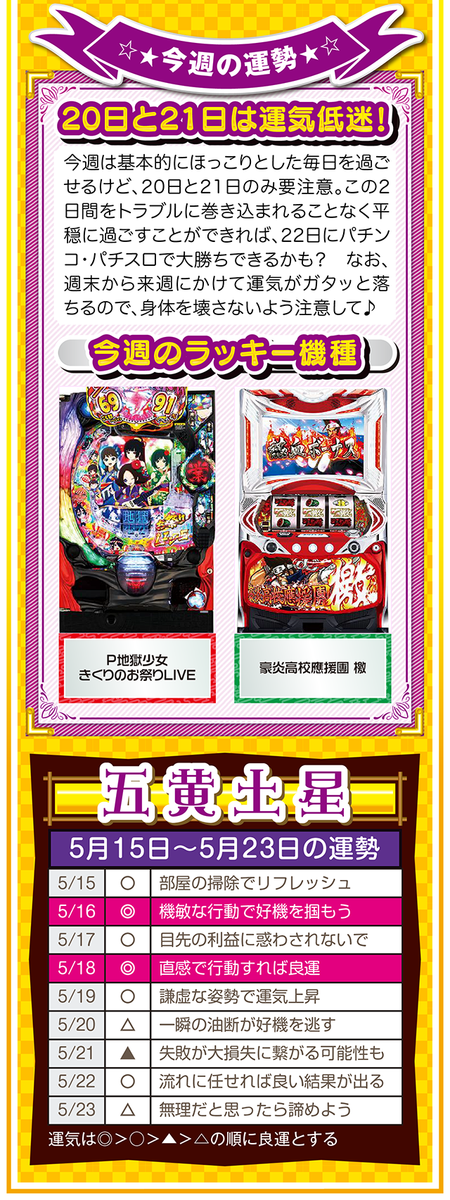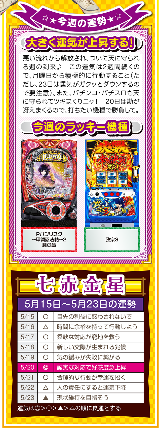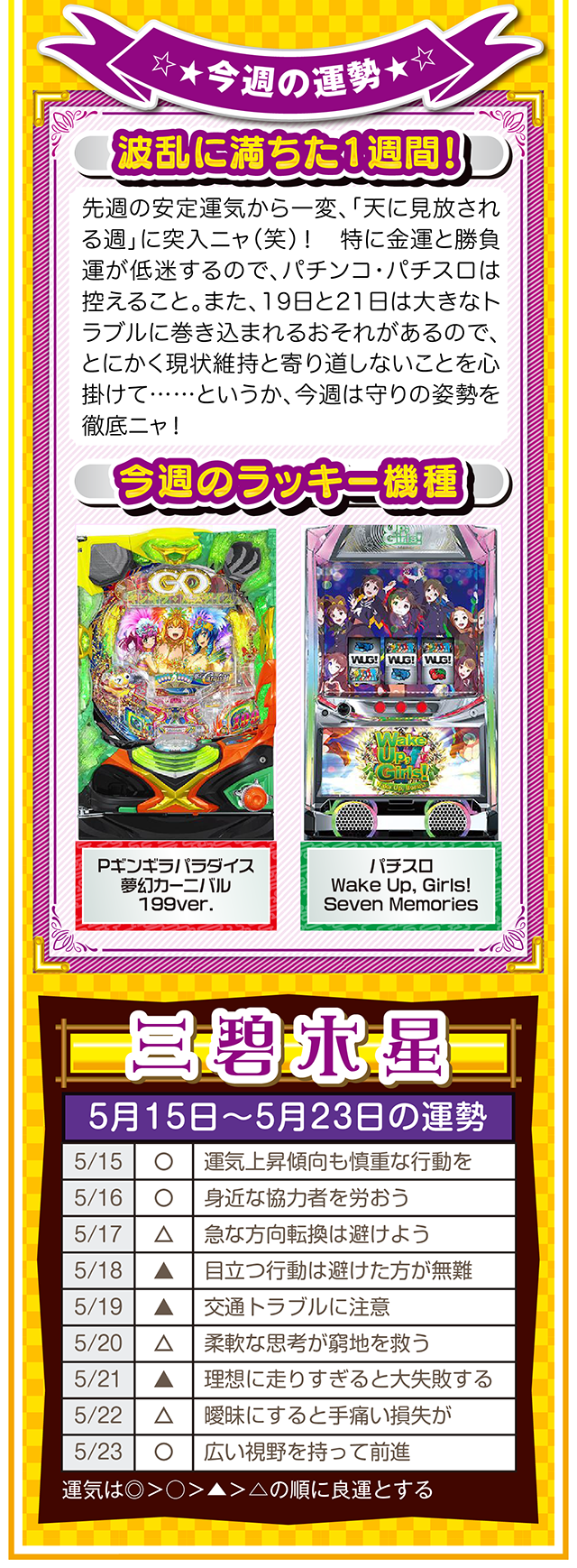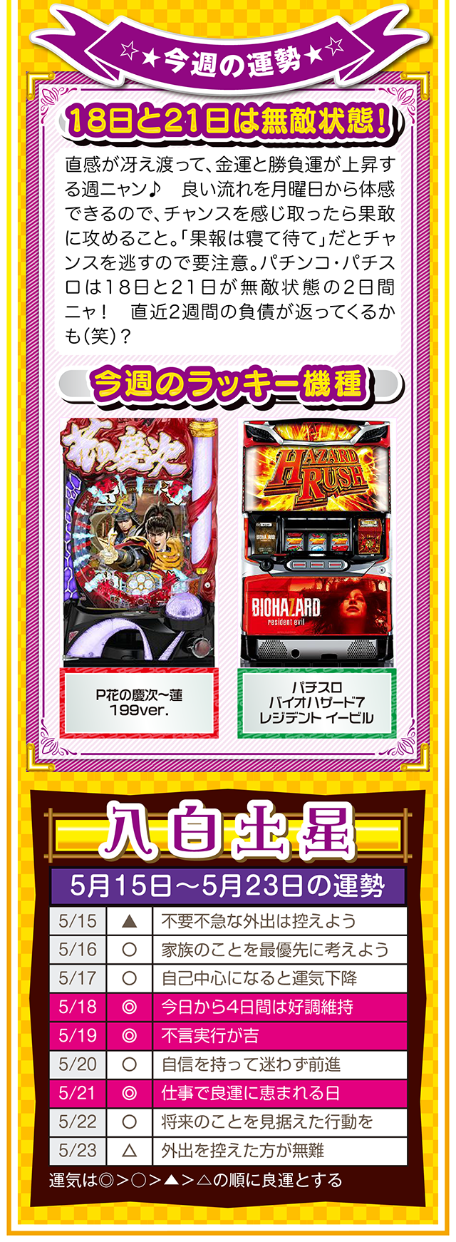 開運は「運を開く」ことであり、「心を開く」ことでもある。「なぜ?」とか「何で?」は時として大切だけど、良運をつかみたいのなら「素直が一番」ということを覚えておいてほしいニャン♪ というわけで早速、5月17日から23日の1週間を鑑定ニャ(私生活は理屈っぽさ全開のフォー・チュンチュンが、オマケとして5月15日と16日の運勢も鑑定したニャン♡)!
