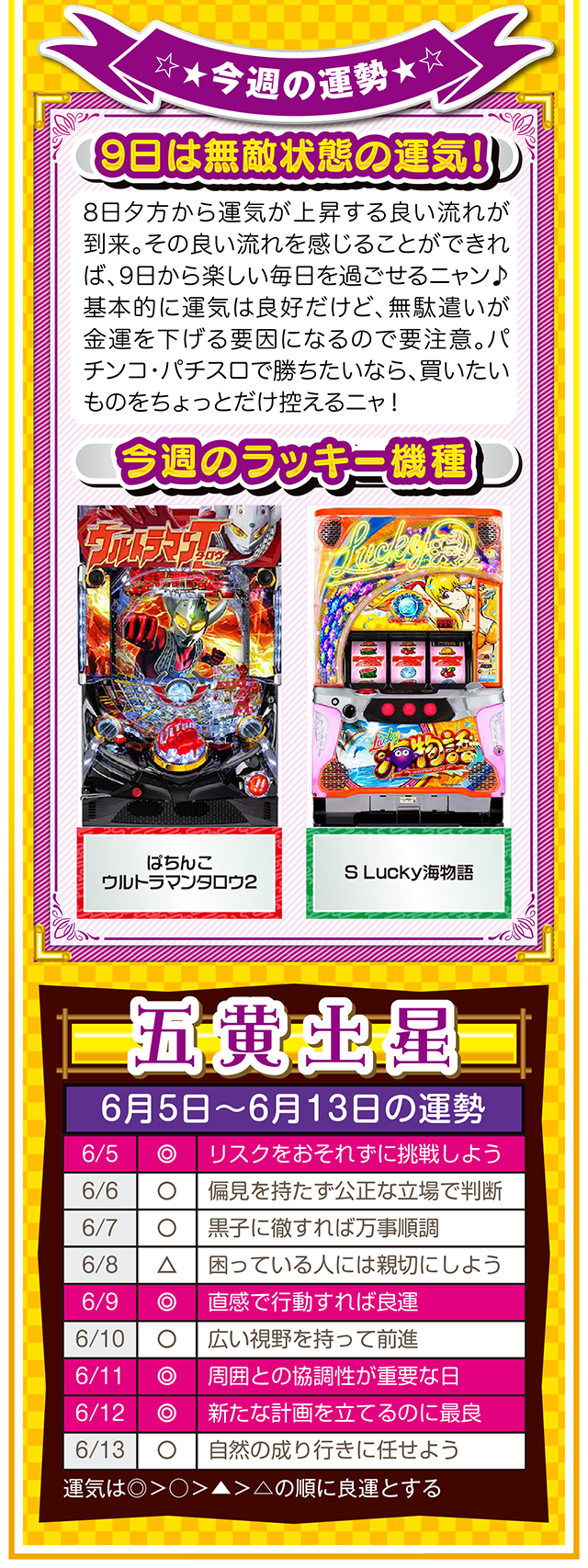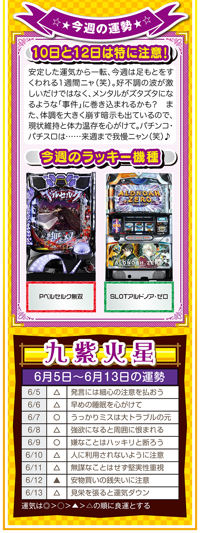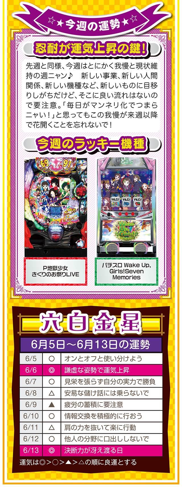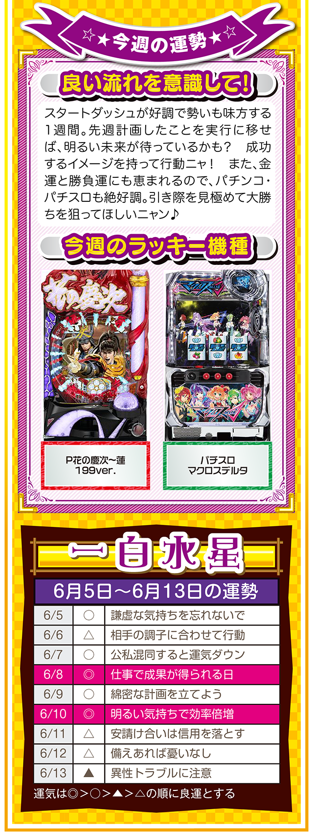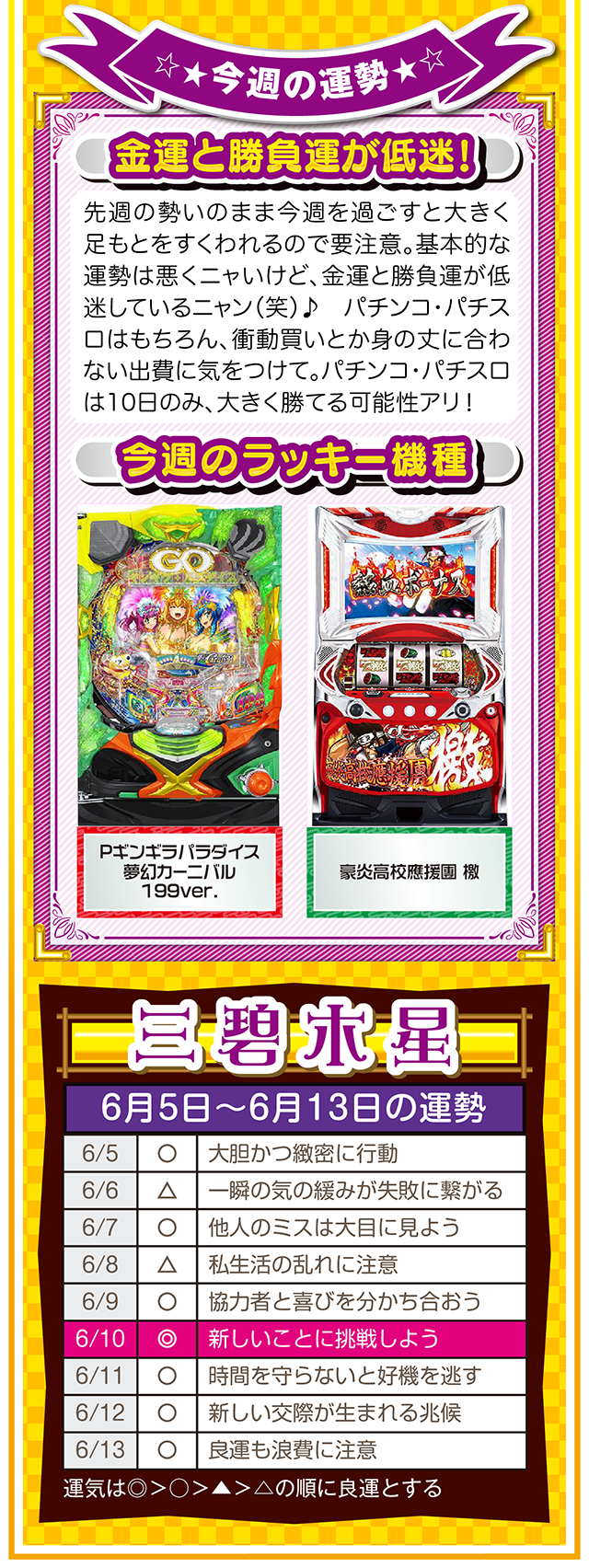サービストークに真偽など必要ないし、「嘘はいけない」という思考は「堅苦しい生き方を選択させる」ということを覚えておいてほしいニャ! というわけで早速、6月7日から13日の1週間を鑑定ニャン(キャバ嬢ばりのサービストークを得意とするフォー・チュンチュンが、オマケとして5日と6日の運勢も鑑定したニャン♡)♪