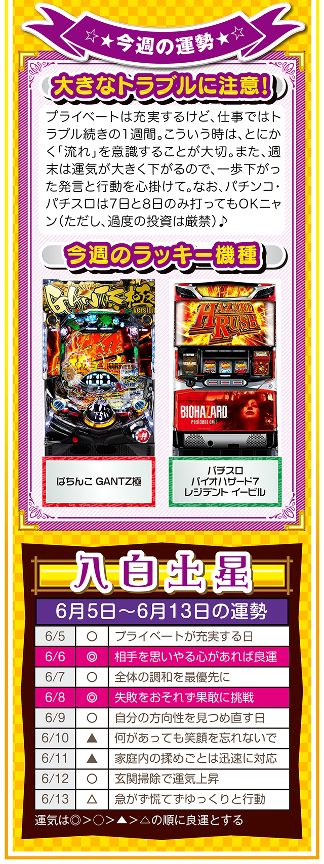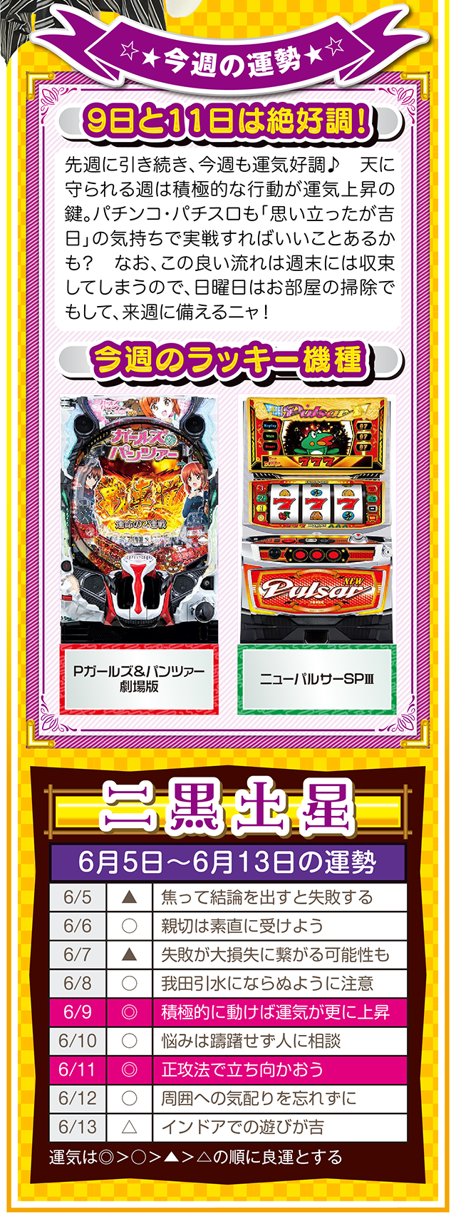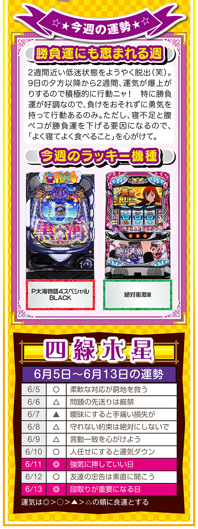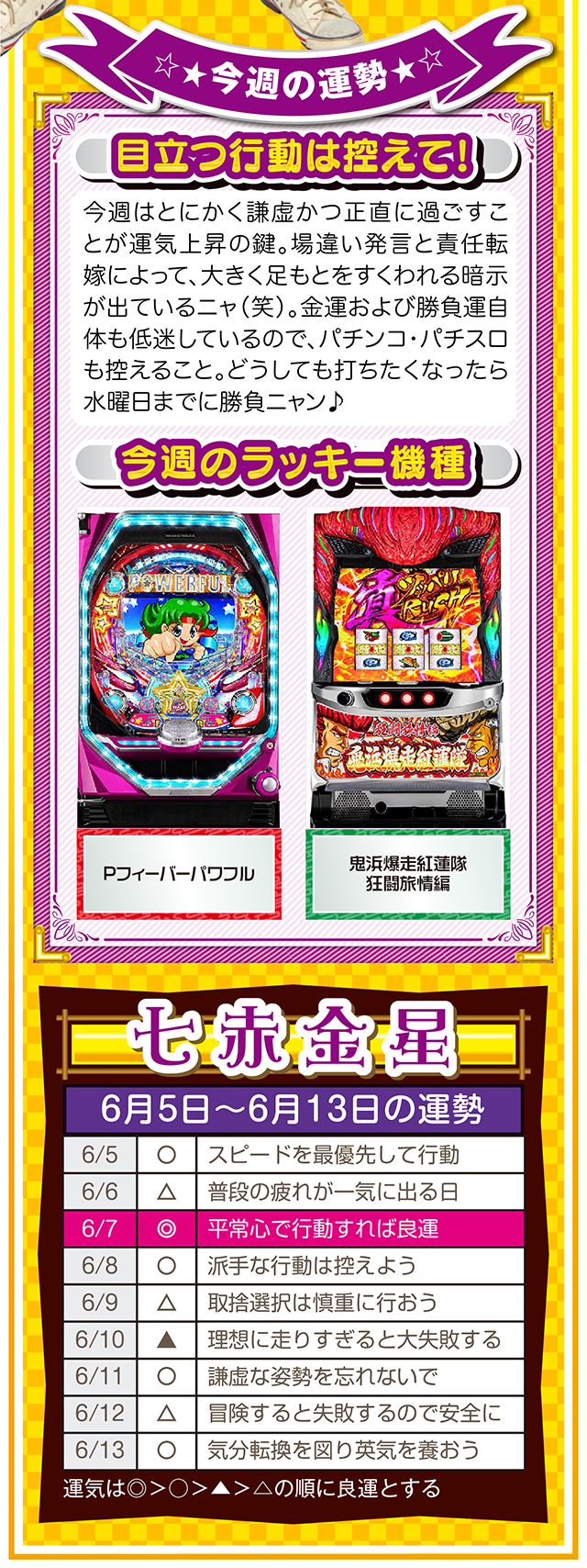 サービストークに真偽など必要ないし、「嘘はいけない」という思考は「堅苦しい生き方を選択させる」ということを覚えておいてほしいニャ! というわけで早速、6月7日から13日の1週間を鑑定ニャン(キャバ嬢ばりのサービストークを得意とするフォー・チュンチュンが、オマケとして5日と6日の運勢も鑑定したニャン♡)♪