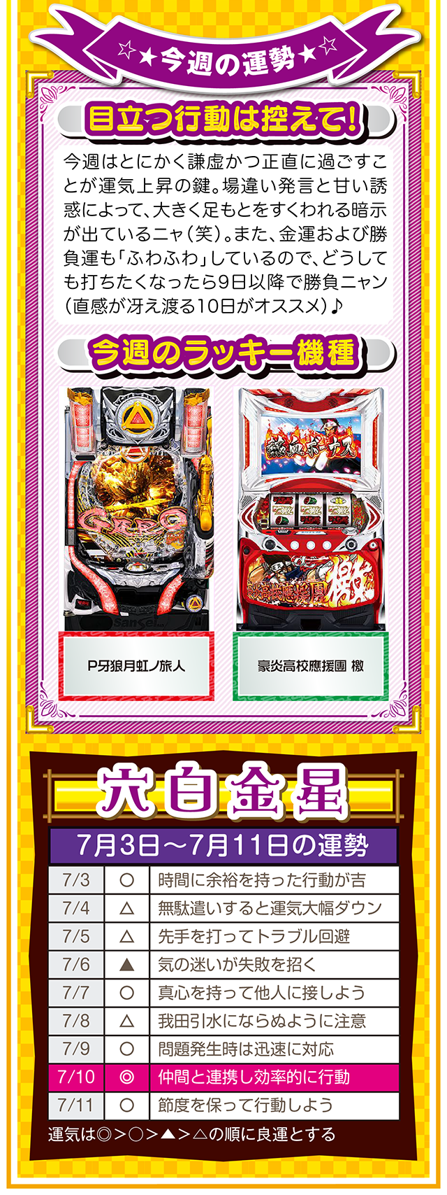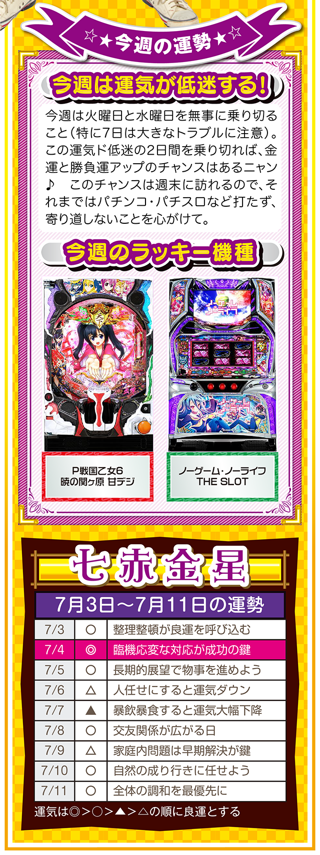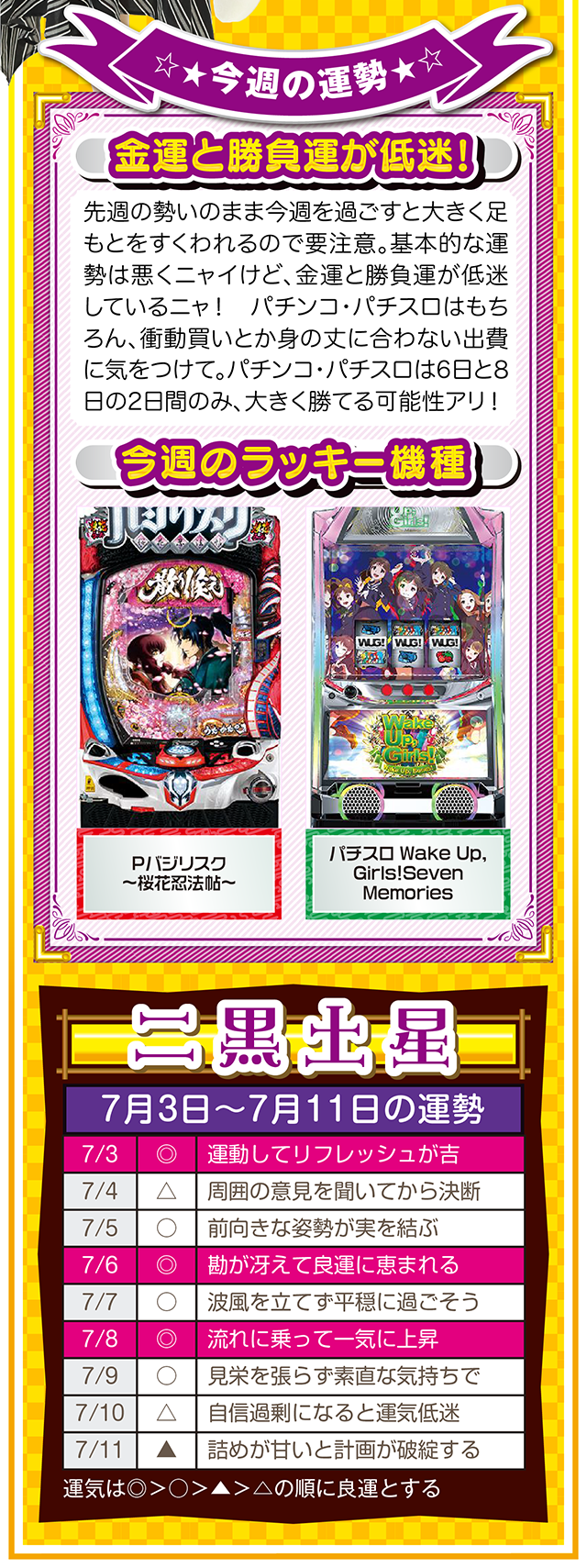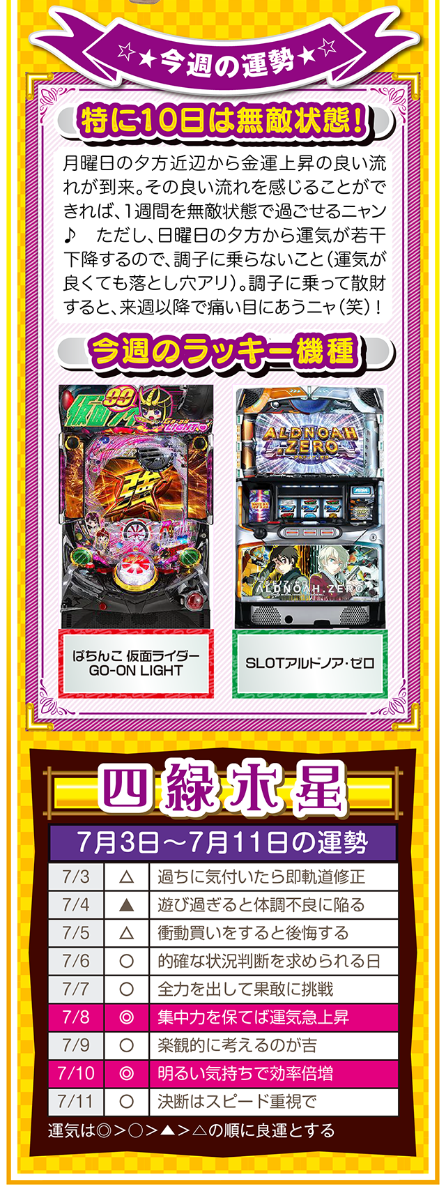良い人生を送りたいのであれば、不満を漏らさず努力すること。そして、自分は運が良いと信じて突き進むこと。信じるから頑張れる。信じる力は岩をも動かし、不運をも遠ざけるバリアになるニャ! というわけで早速、7月5日から7月11日の1週間を鑑定ニャン(異性運のなさに不満を漏らしまくる独身のフォー・チュンチュンが、オマケとして3日と4日の運勢も鑑定したニャン♡)♪