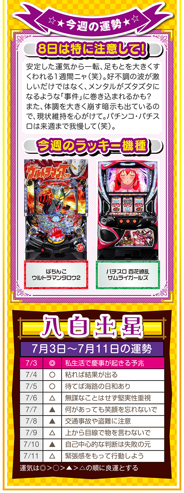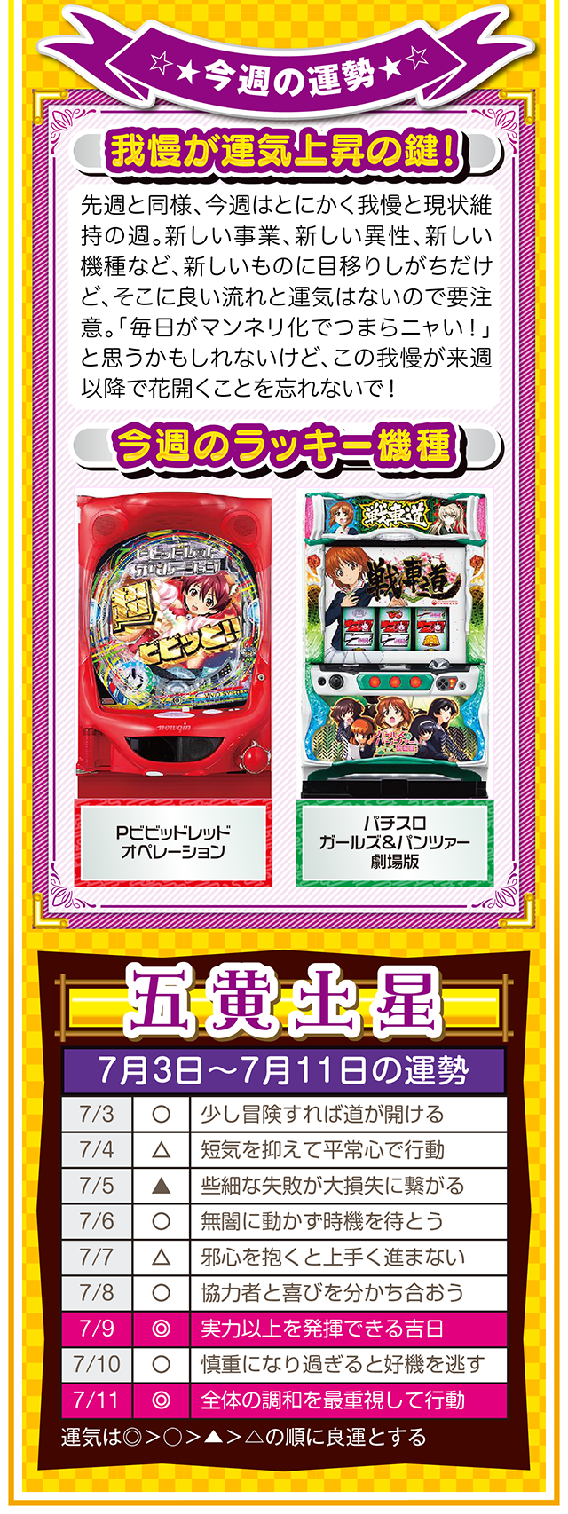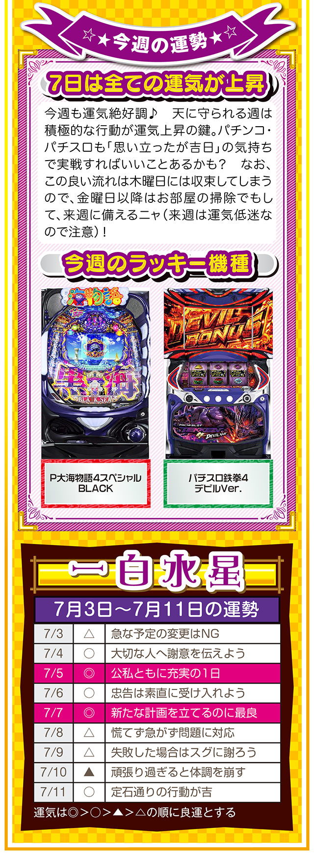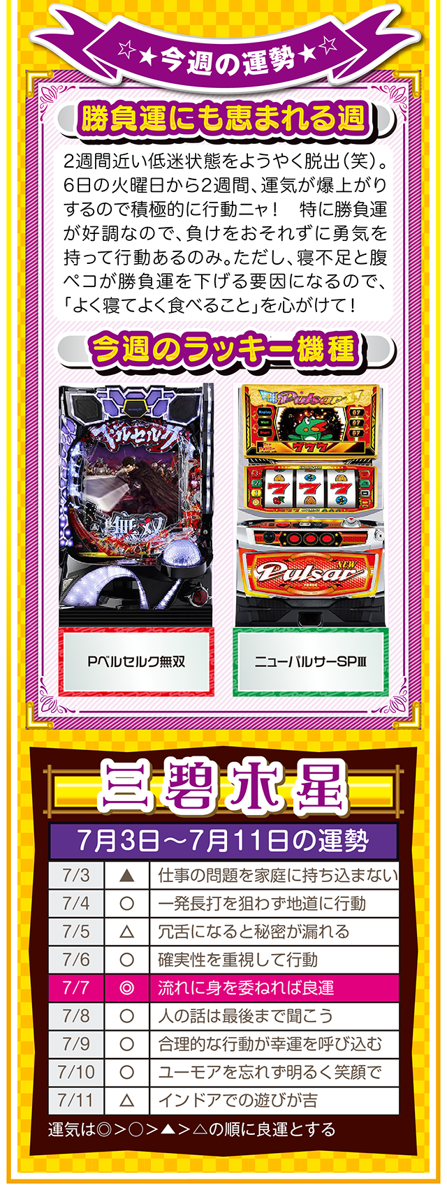 良い人生を送りたいのであれば、不満を漏らさず努力すること。そして、自分は運が良いと信じて突き進むこと。信じるから頑張れる。信じる力は岩をも動かし、不運をも遠ざけるバリアになるニャ! というわけで早速、7月5日から7月11日の1週間を鑑定ニャン(異性運のなさに不満を漏らしまくる独身のフォー・チュンチュンが、オマケとして3日と4日の運勢も鑑定したニャン♡)♪