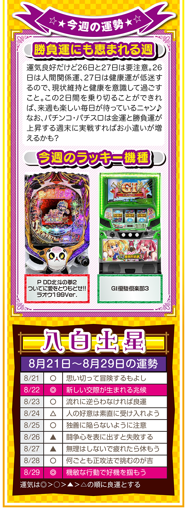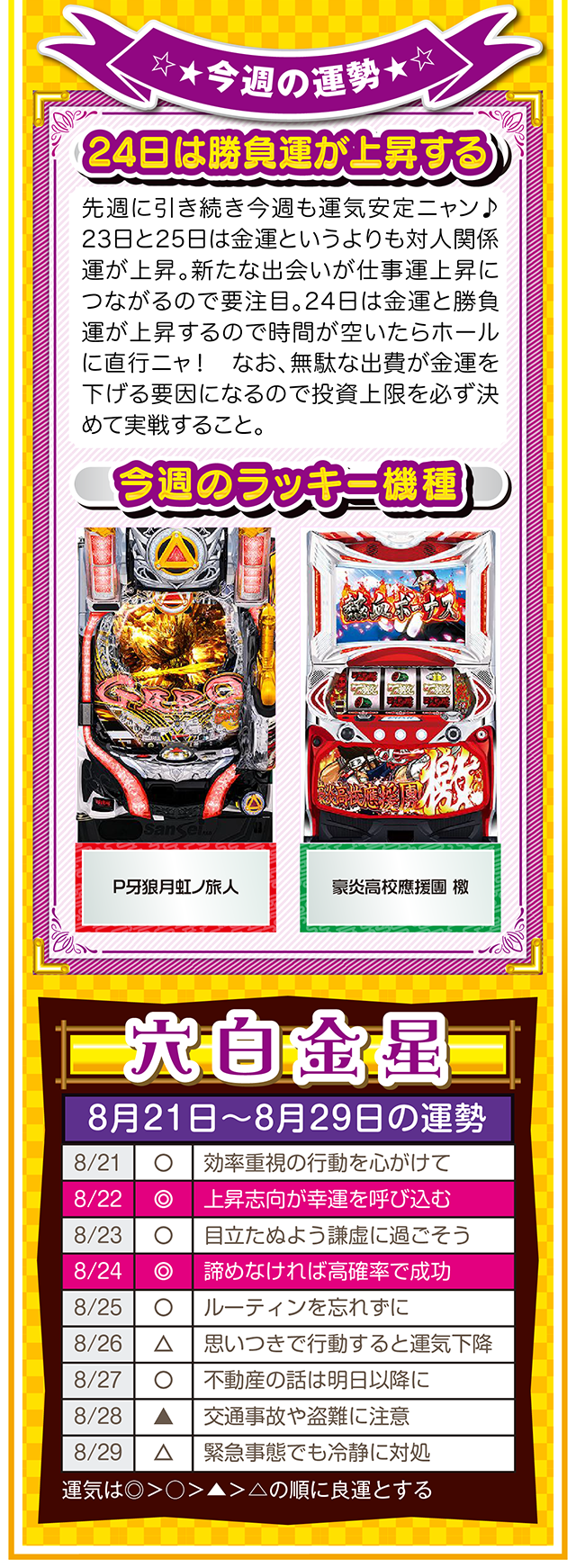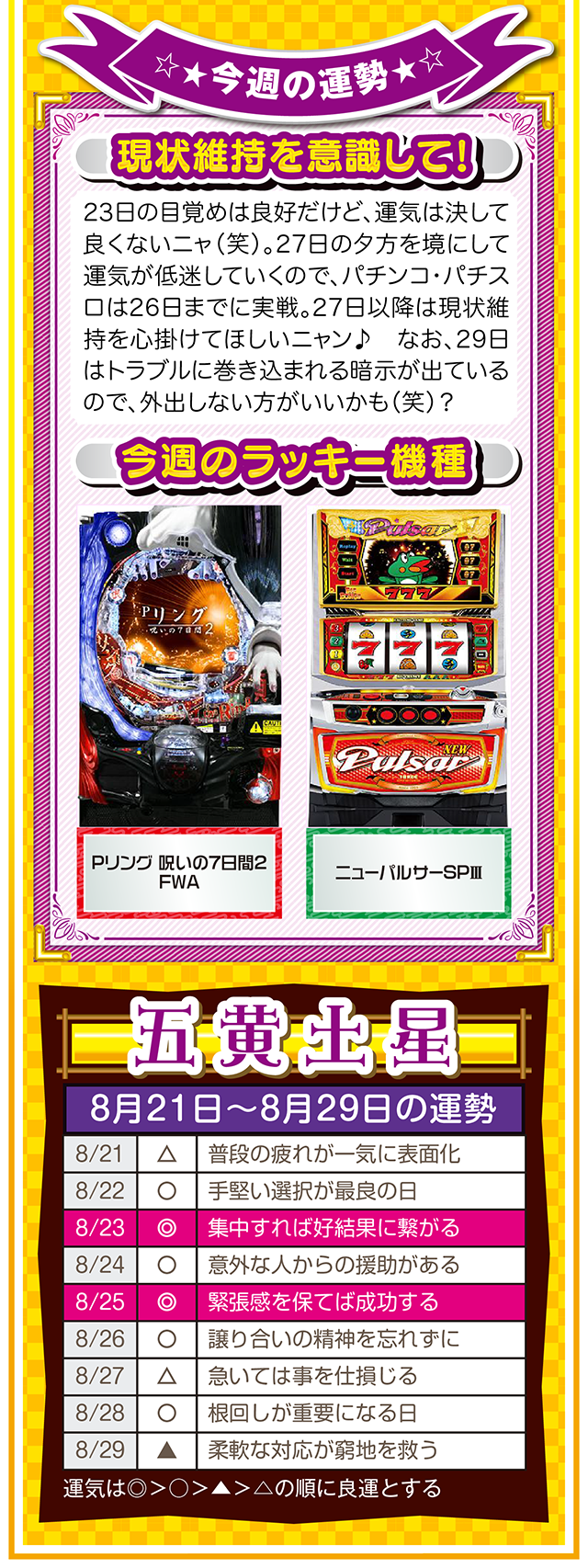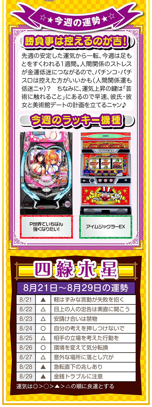 運、ツキ、流れは、外見ではなく内面が綺麗な人が大好き。運、ツキ、流れを味方にするためにも、誠実とか律儀という古くさい言葉をたまには思い出してほしいニャン♪ というわけで早速、8月23日から29日の1週間を鑑定ニャ(誠実と律儀を理解しつつもトラブルだけは全力回避のフォー・チュンチュンが、オマケとして8月21日と22日の運勢も鑑定したニャン♡)!
