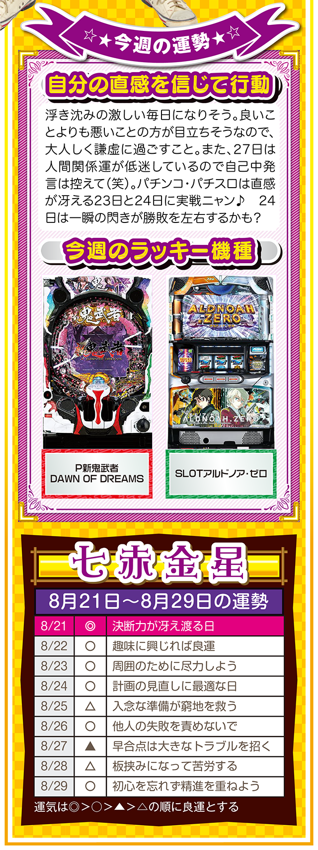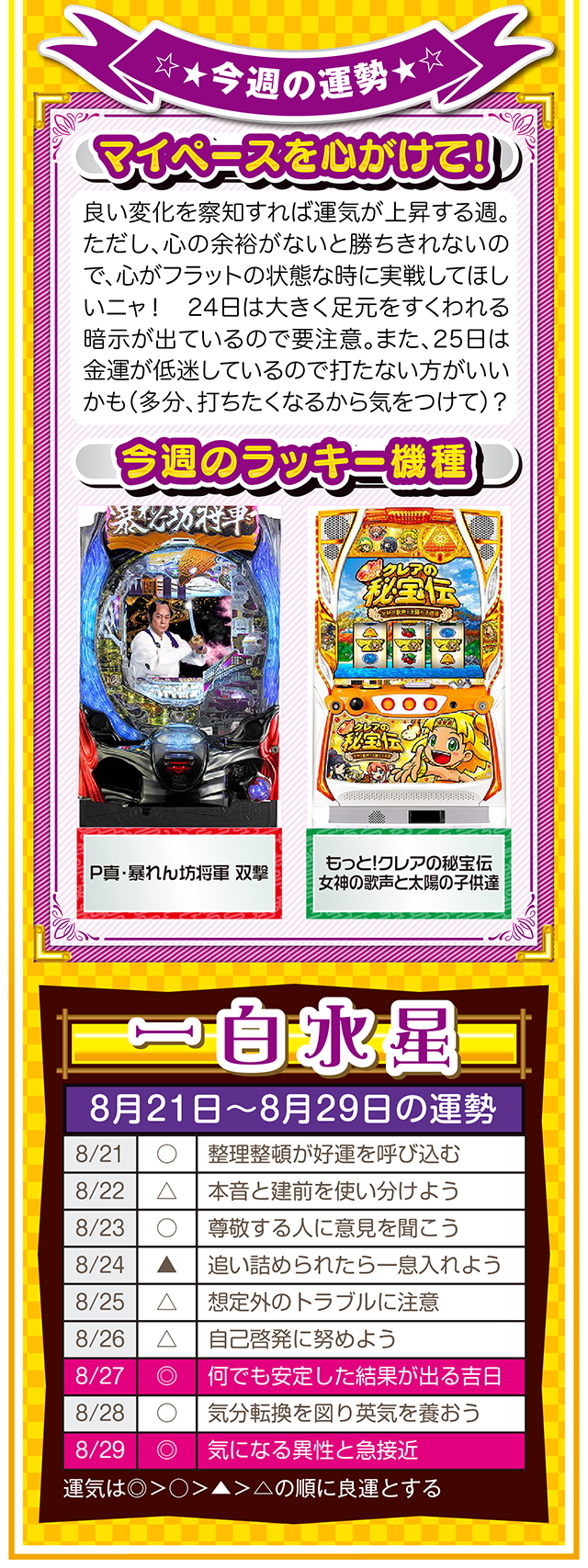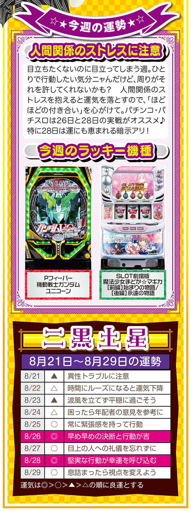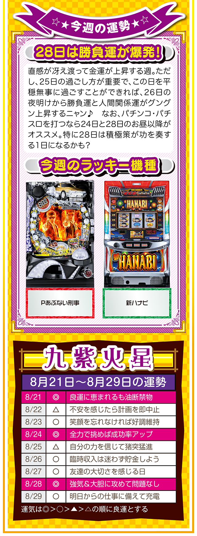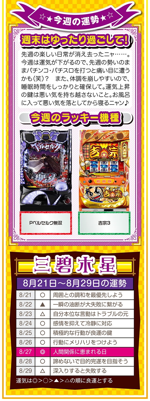 運、ツキ、流れは、外見ではなく内面が綺麗な人が大好き。運、ツキ、流れを味方にするためにも、誠実とか律儀という古くさい言葉をたまには思い出してほしいニャン♪ というわけで早速、8月23日から29日の1週間を鑑定ニャ(誠実と律儀を理解しつつもトラブルだけは全力回避のフォー・チュンチュンが、オマケとして8月21日と22日の運勢も鑑定したニャン♡)!