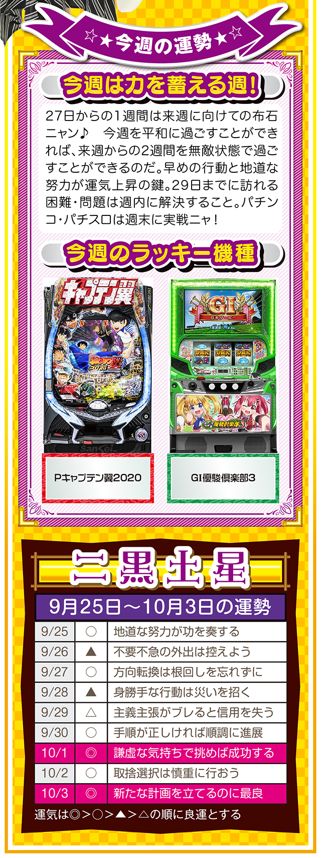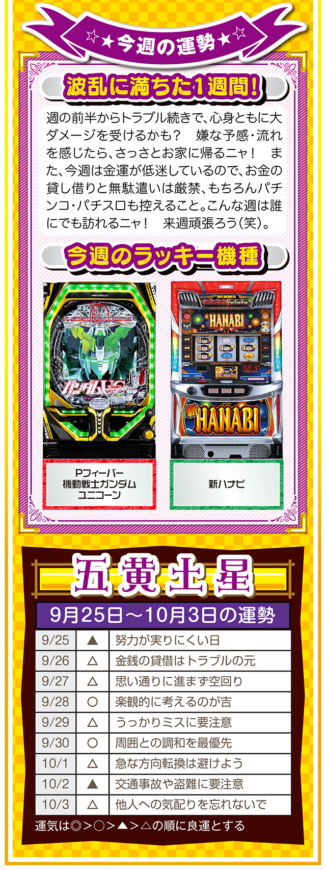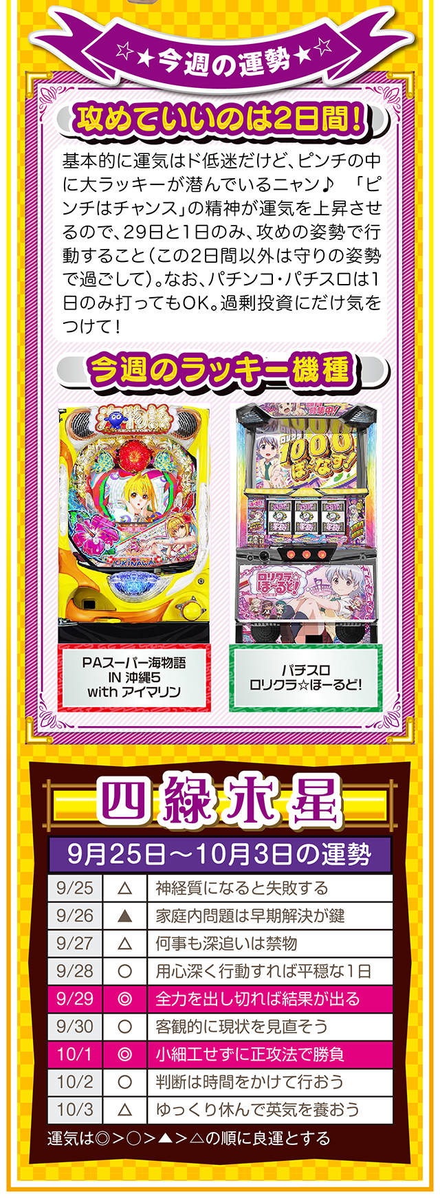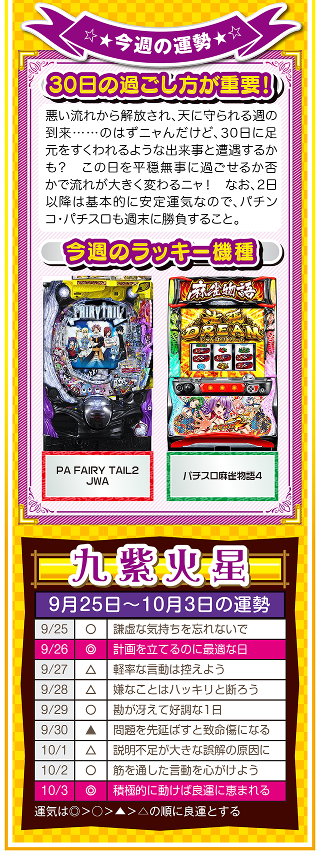 だから、自分の正義感や正当性だけで物事を判断しないこと。責任感と正義感のバランスはすごく難しいけど、「人生、白黒ハッキリさせないくらいがちょうどいい」くらいの気持ちが、人生に彩りを与えてくれるニャン(笑)♪ というわけで早速、9月27日から10月3日の1週間を鑑定ニャ(年を重ねるごとに正義感のハードルがグングン上がるフォー・チュンチュンが、今週もオマケとして25日と26日の運勢も鑑定したニャン♡)!