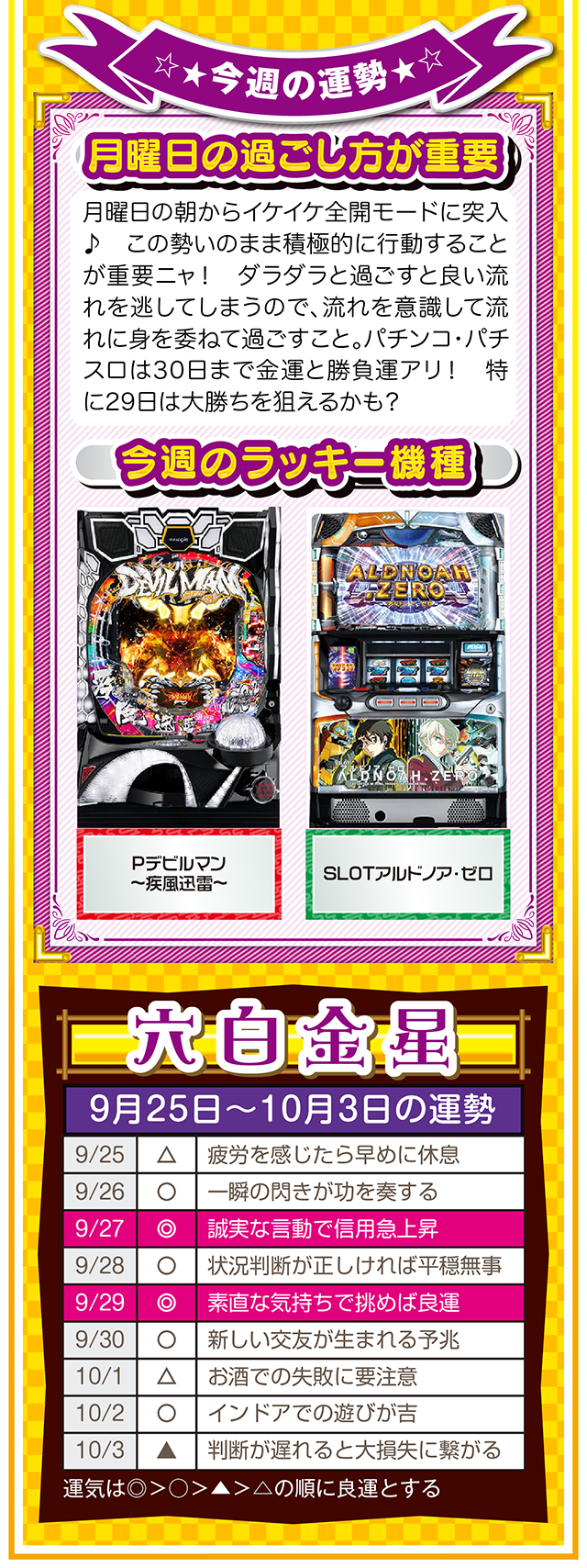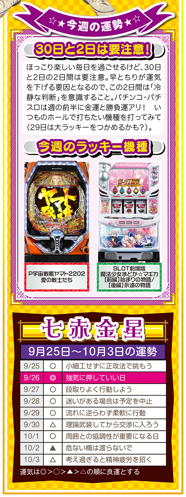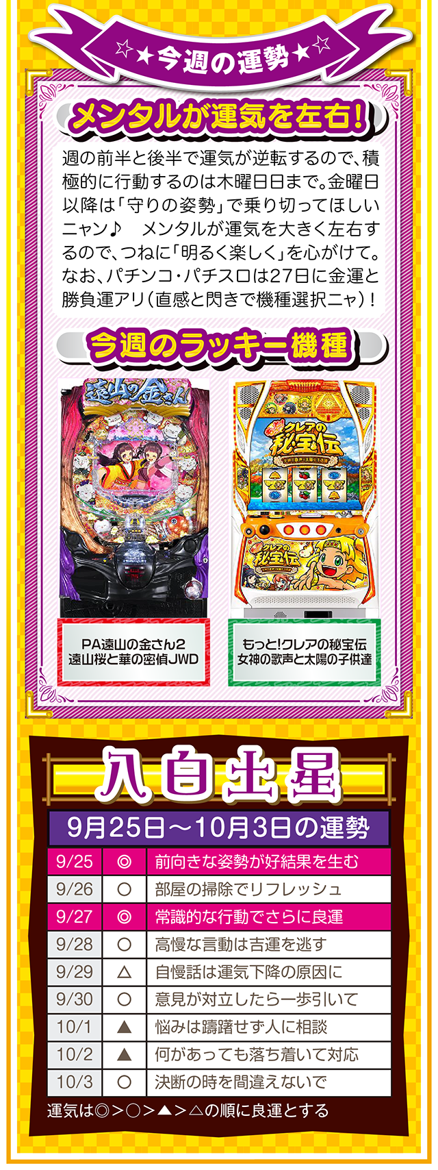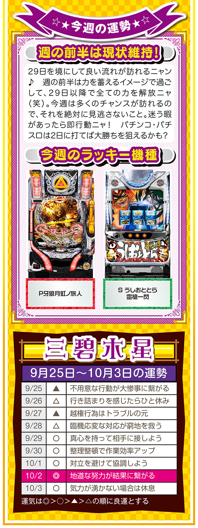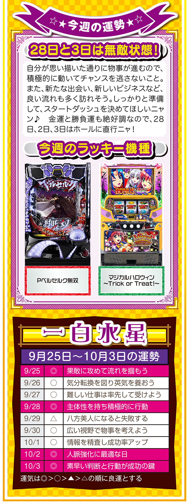 だから、自分の正義感や正当性だけで物事を判断しないこと。責任感と正義感のバランスはすごく難しいけど、「人生、白黒ハッキリさせないくらいがちょうどいい」くらいの気持ちが、人生に彩りを与えてくれるニャン(笑)♪ というわけで早速、9月27日から10月3日の1週間を鑑定ニャ(年を重ねるごとに正義感のハードルがグングン上がるフォー・チュンチュンが、今週もオマケとして25日と26日の運勢も鑑定したニャン♡)!