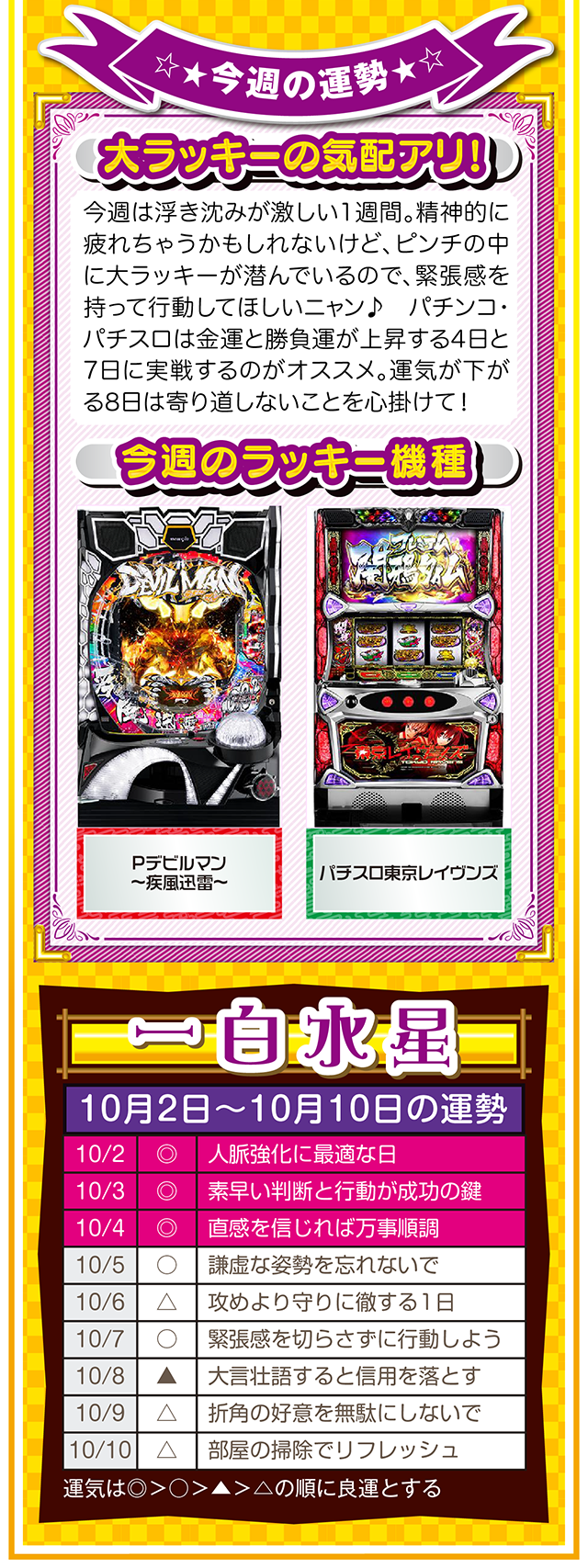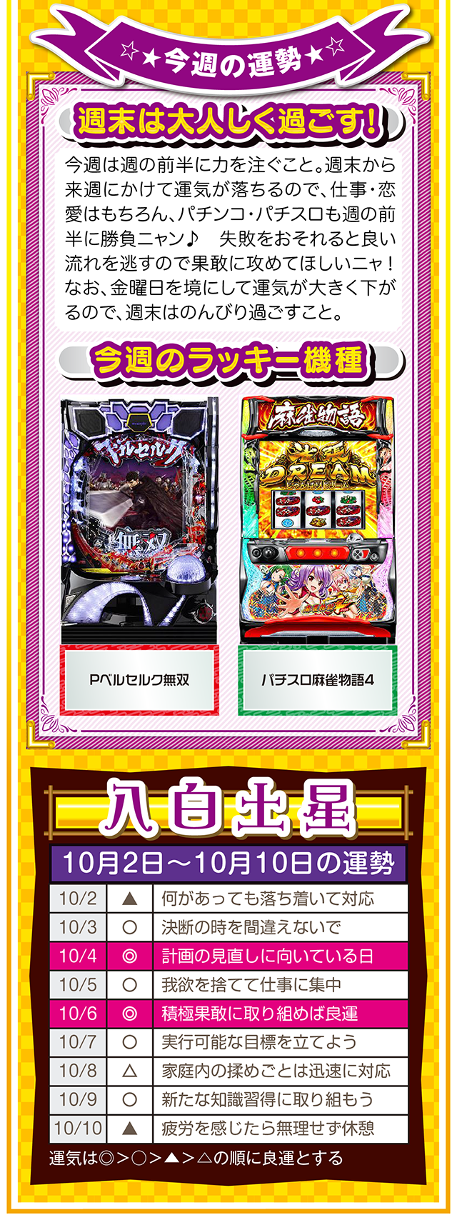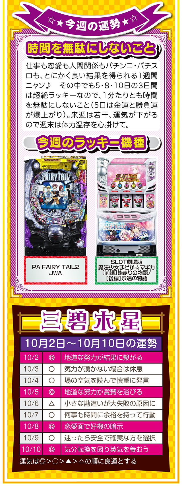 だから、依存している自分を認めて、「ほどほどに依存する」を心掛けること(笑)。自分自身を俯瞰的に捉えるということは、自分自身を理解している証拠。自分を知らなければ「ほどほどに依存する」ことはできないし、正常な判断もできなくなるニャン♪ というわけで早速、10月4日から10日の1週間を鑑定ニャ(普段はツンデレだけど付き合ったら依存しまくるフォー・チュンチュンが、今週もオマケとして2日と3日の運勢も鑑定したニャン♡)!