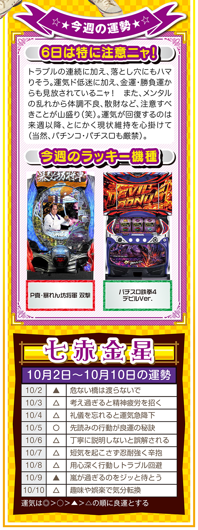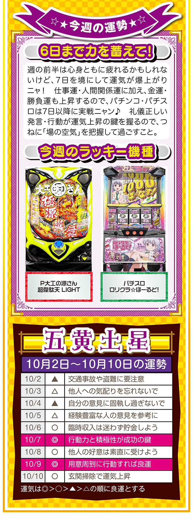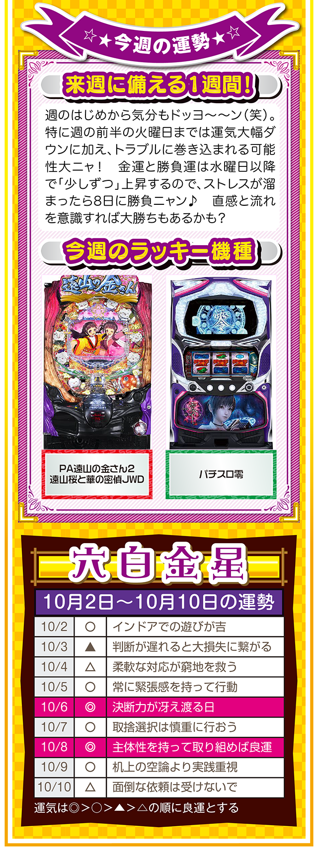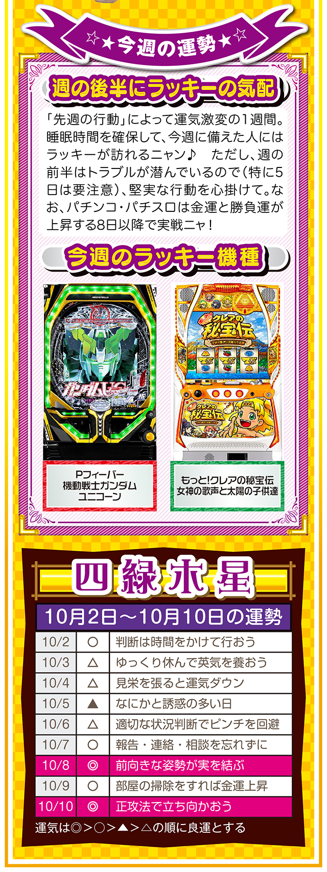 だから、依存している自分を認めて、「ほどほどに依存する」を心掛けること(笑)。自分自身を俯瞰的に捉えるということは、自分自身を理解している証拠。自分を知らなければ「ほどほどに依存する」ことはできないし、正常な判断もできなくなるニャン♪ というわけで早速、10月4日から10日の1週間を鑑定ニャ(普段はツンデレだけど付き合ったら依存しまくるフォー・チュンチュンが、今週もオマケとして2日と3日の運勢も鑑定したニャン♡)!