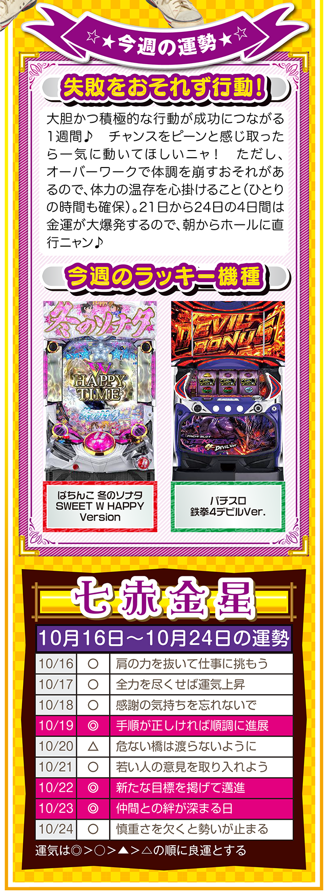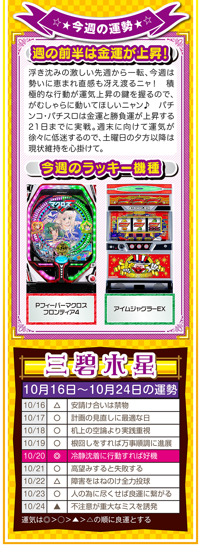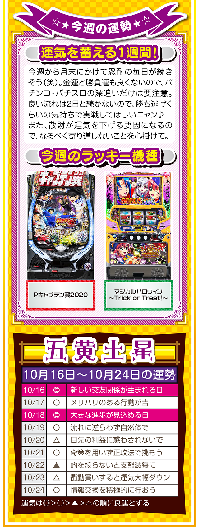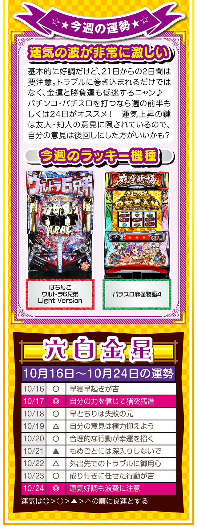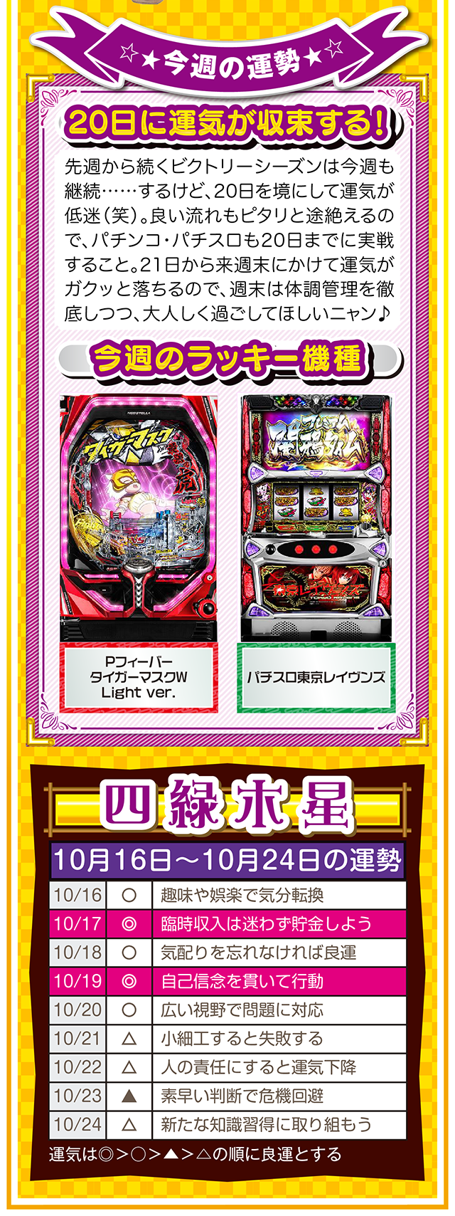 自分自身の理解を深めるきっかけにするのも、「胡散臭っ!」と思うのも勝手だけど、少しでも「当たってるかも?」と思ったら、素直に受け止めてほしいニャン♪ というわけで早速、10月18日から24日の1週間を鑑定ニャ(同性には素直になれても異性には素直になれないフォー・チュンチュンが、今週もオマケとして16日と17日の運勢も鑑定したニャン♡)!
