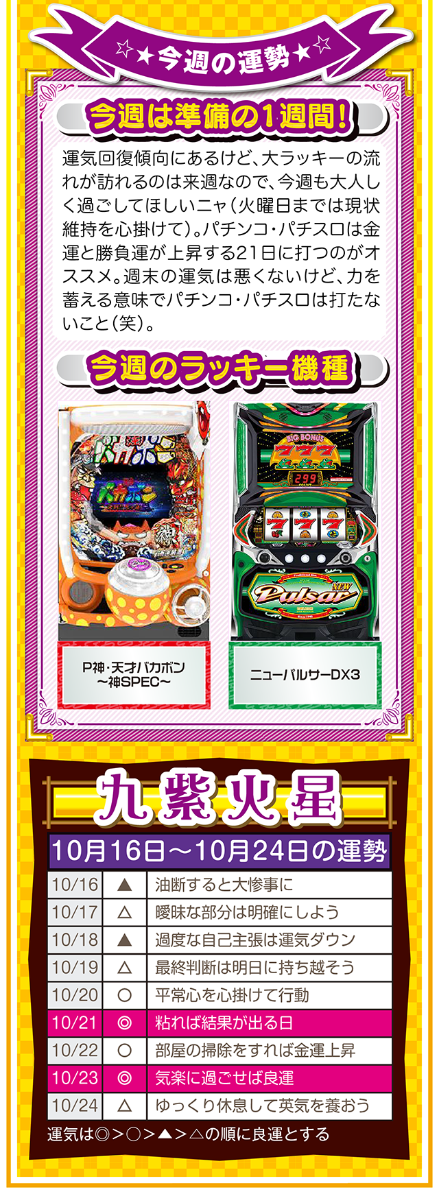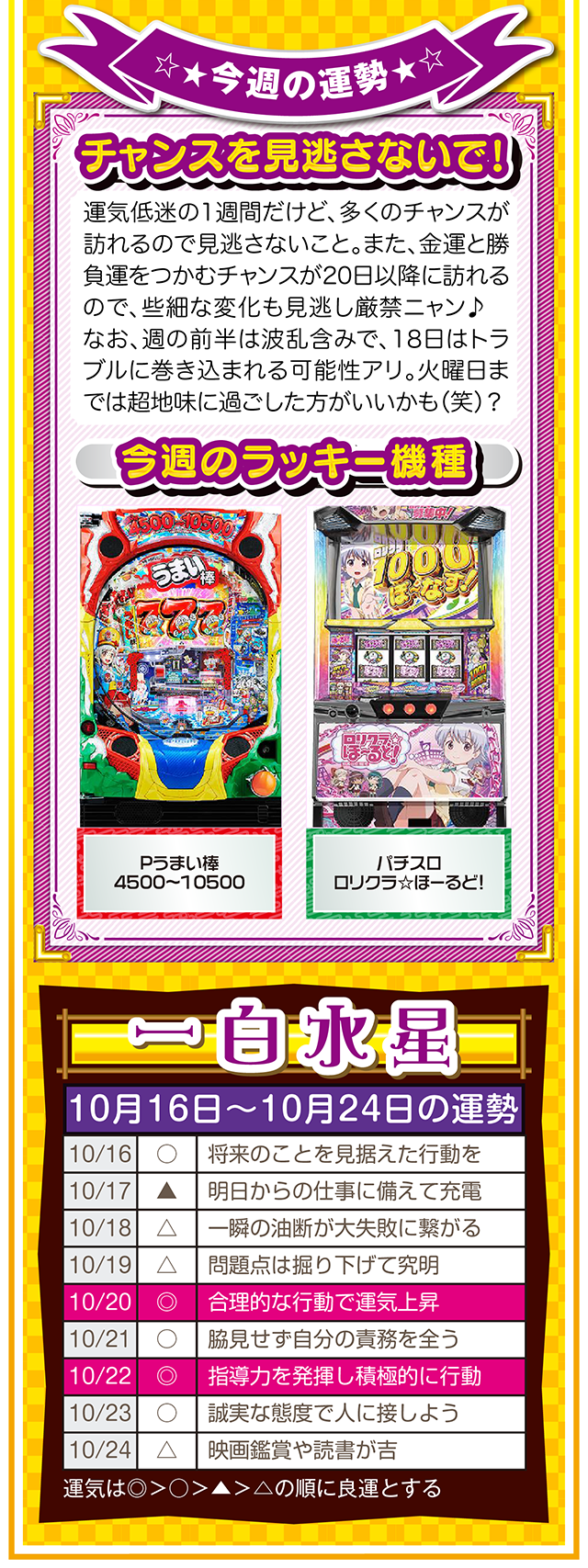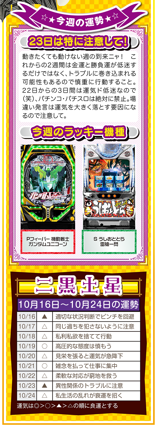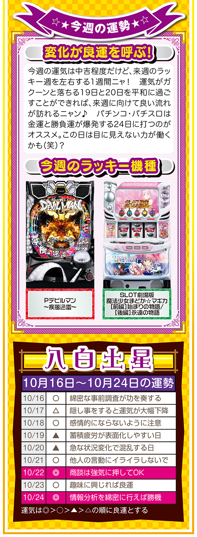 自分自身の理解を深めるきっかけにするのも、「胡散臭っ!」と思うのも勝手だけど、少しでも「当たってるかも?」と思ったら、素直に受け止めてほしいニャン♪ というわけで早速、10月18日から24日の1週間を鑑定ニャ(同性には素直になれても異性には素直になれないフォー・チュンチュンが、今週もオマケとして16日と17日の運勢も鑑定したニャン♡)!